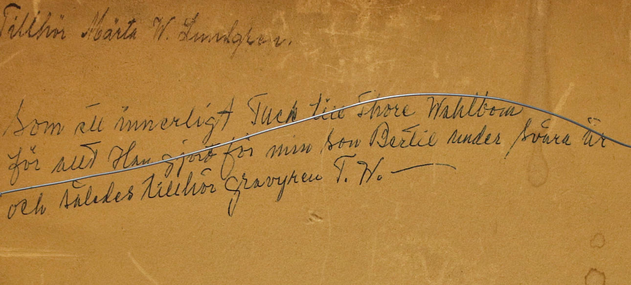 ”Sydämelliset kiitokset Thore Wahlbomille kaikesta, mitä hän on tehnyt poikani Bertilin hyväksi vaikeina vuosina ja siten kaiverrus kuuluu T.W.".