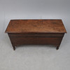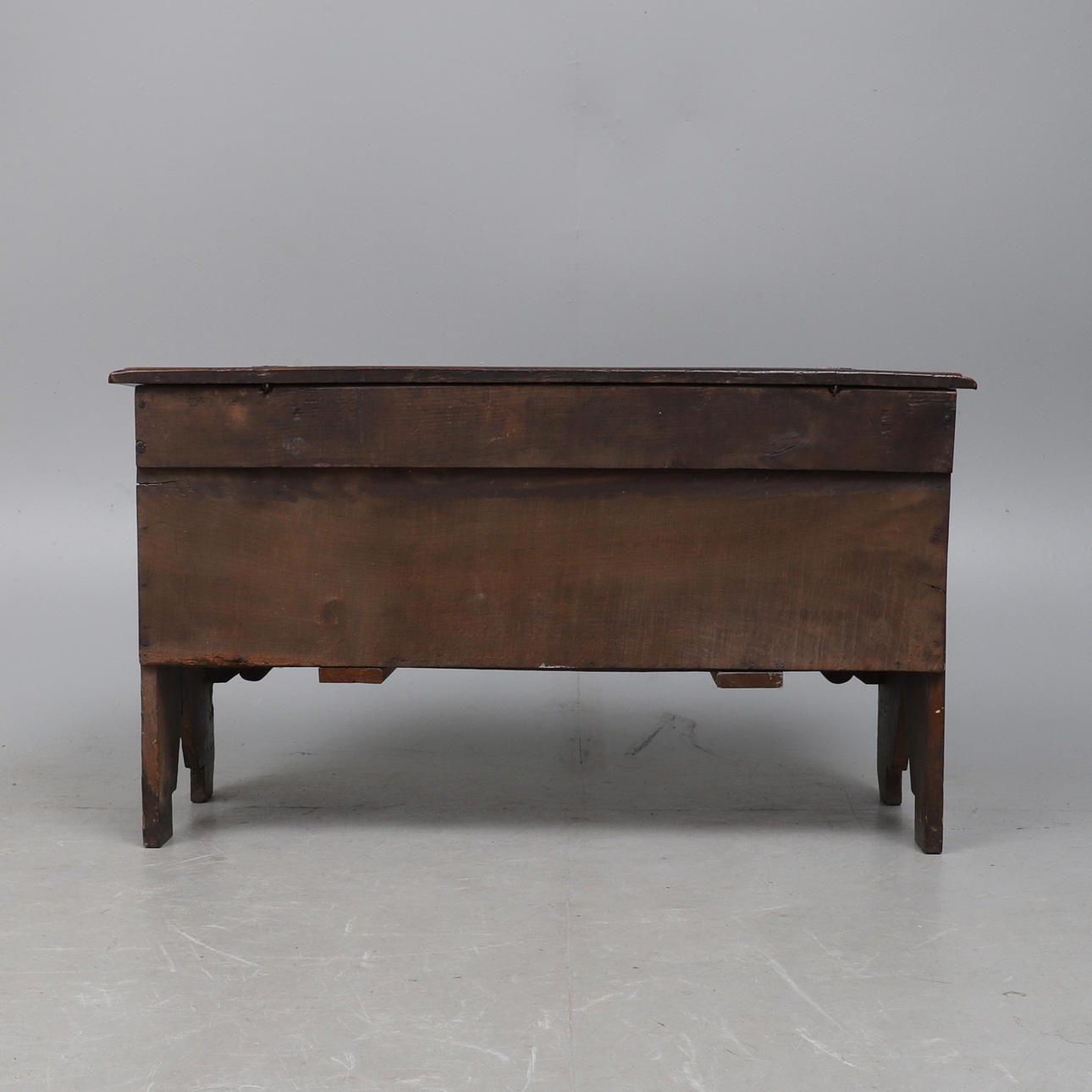 restaurointeja, koputettu, merkitty, naarmuuntunut ja tahrattu, merkkejä vanhasta madosta, puuttuu kynttilälaatikko ja lukko, vanhat vauriot kiinnikkeissä ja jaloissa.