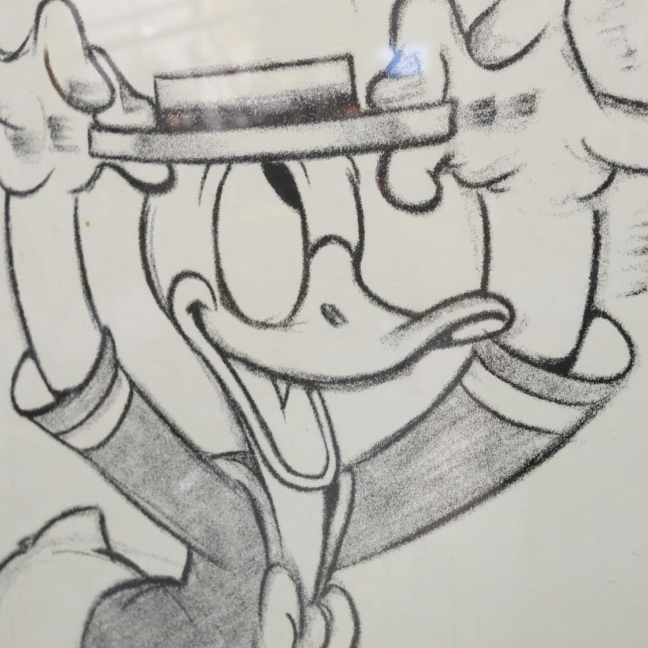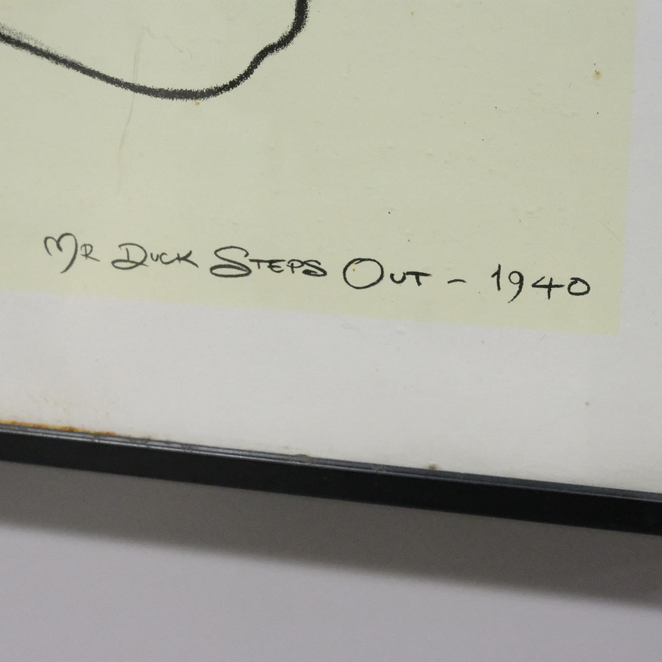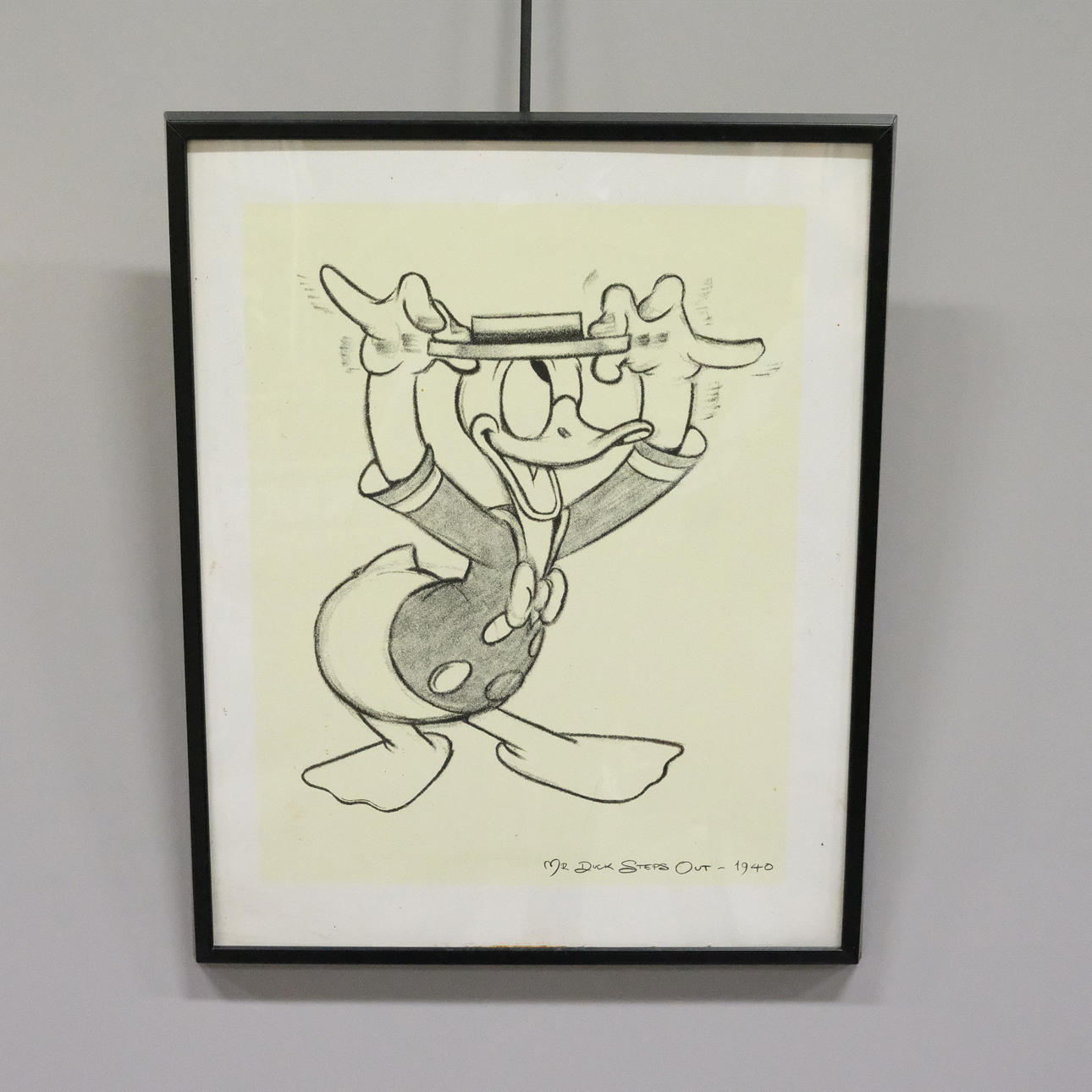 ”Herra Ankka astuu ulos 1940". Kuvan mitat: n. 41 x 32 cm. Rungon mitat: n. 51,5 x 41,5 cm.