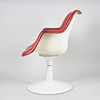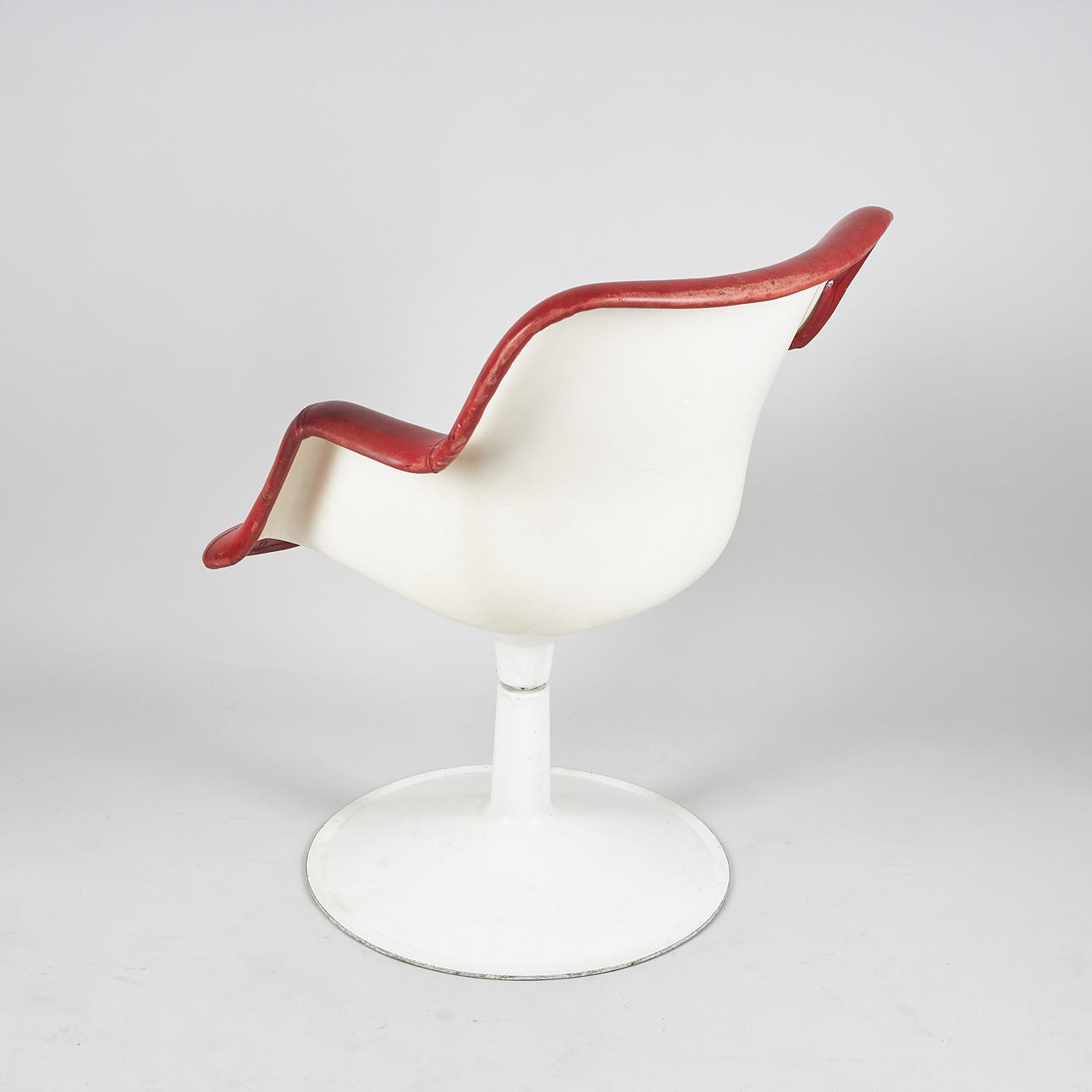 Valkoinen runko metallista ja muovista. Istuin punaisesta nahasta. Korkeus 83 cm, istuinkorkeus noin 43 cm.