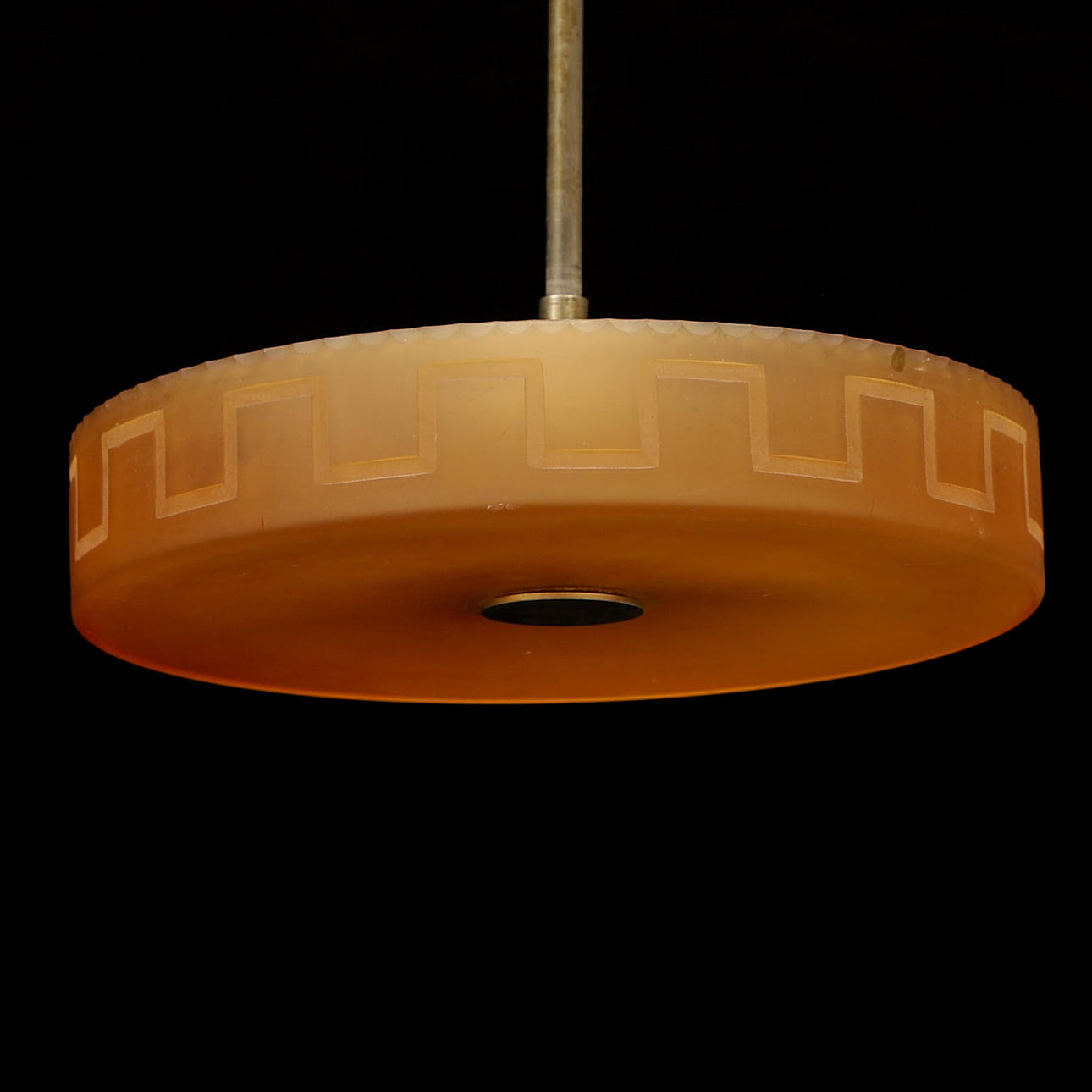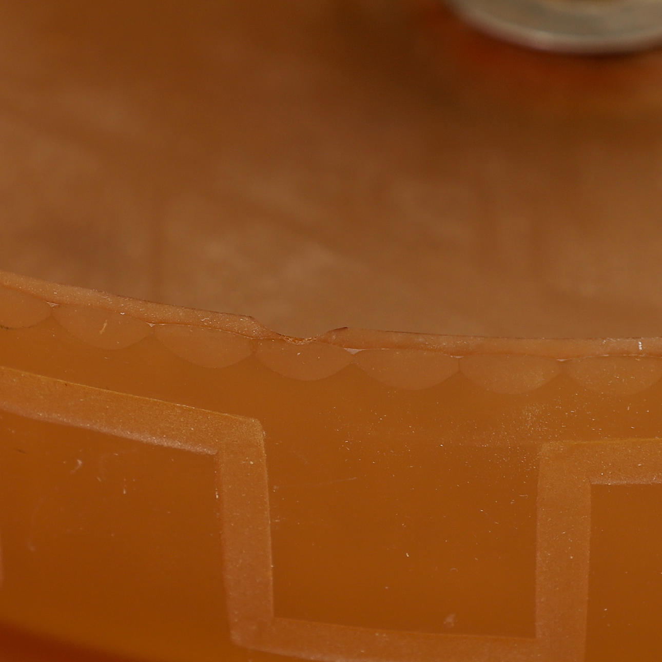 Keltainen lasi, pyöreä katto kaiverrettulla sisustuksella. Halk 35, höjd 49 cm.