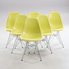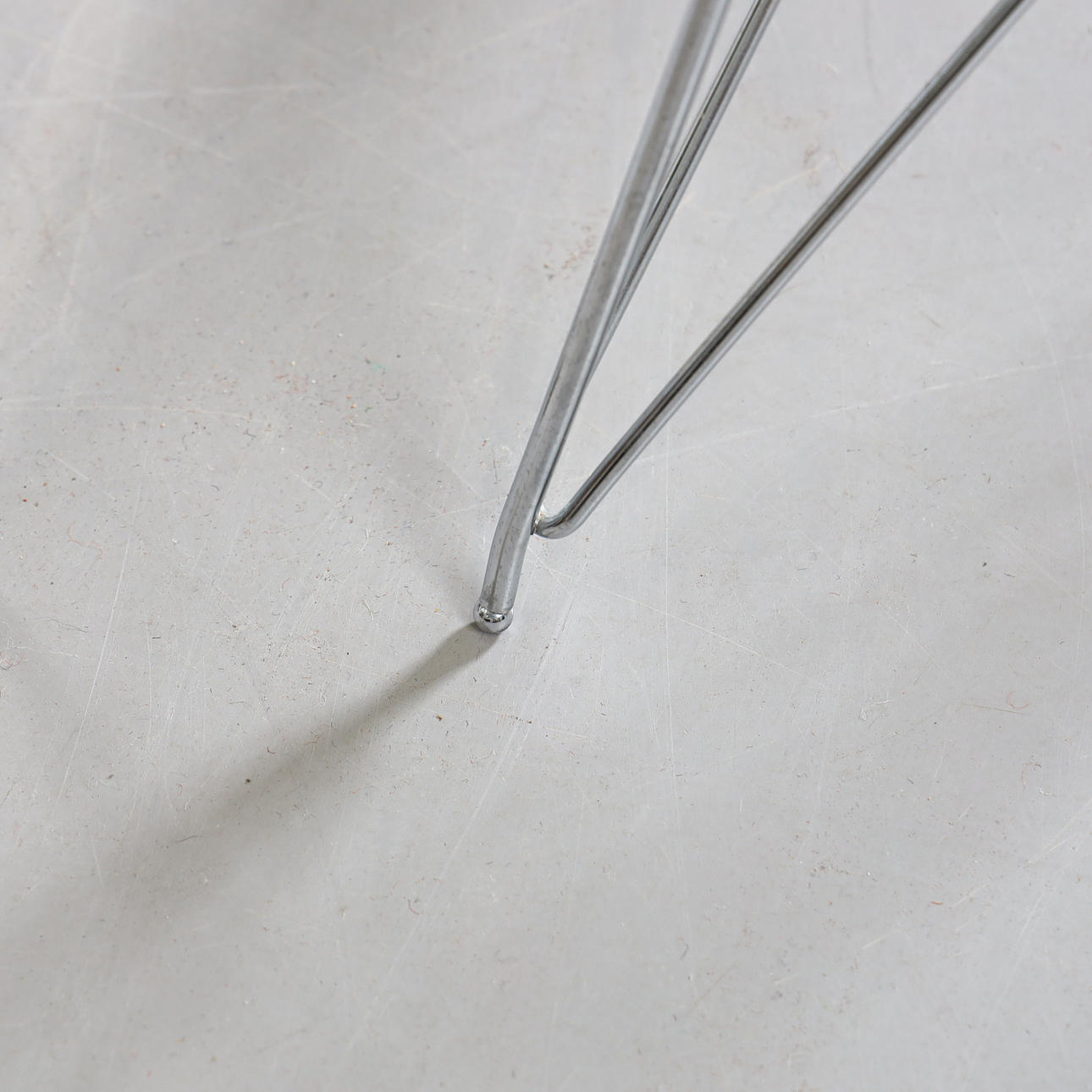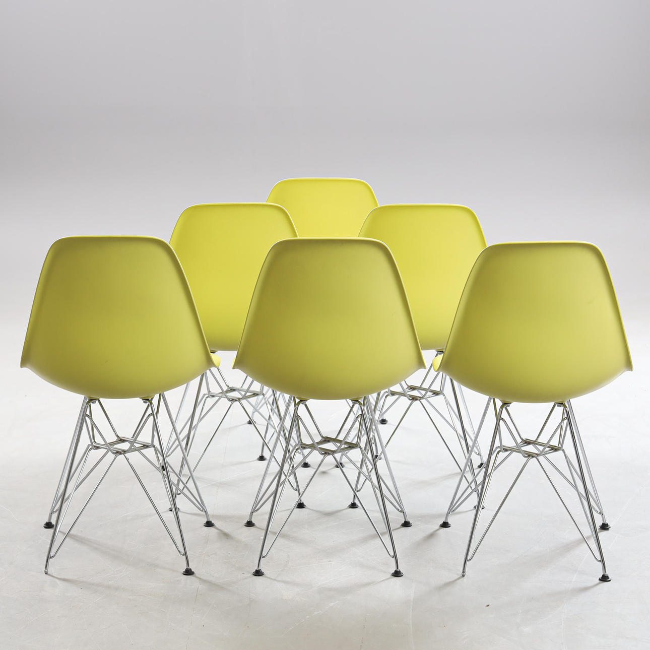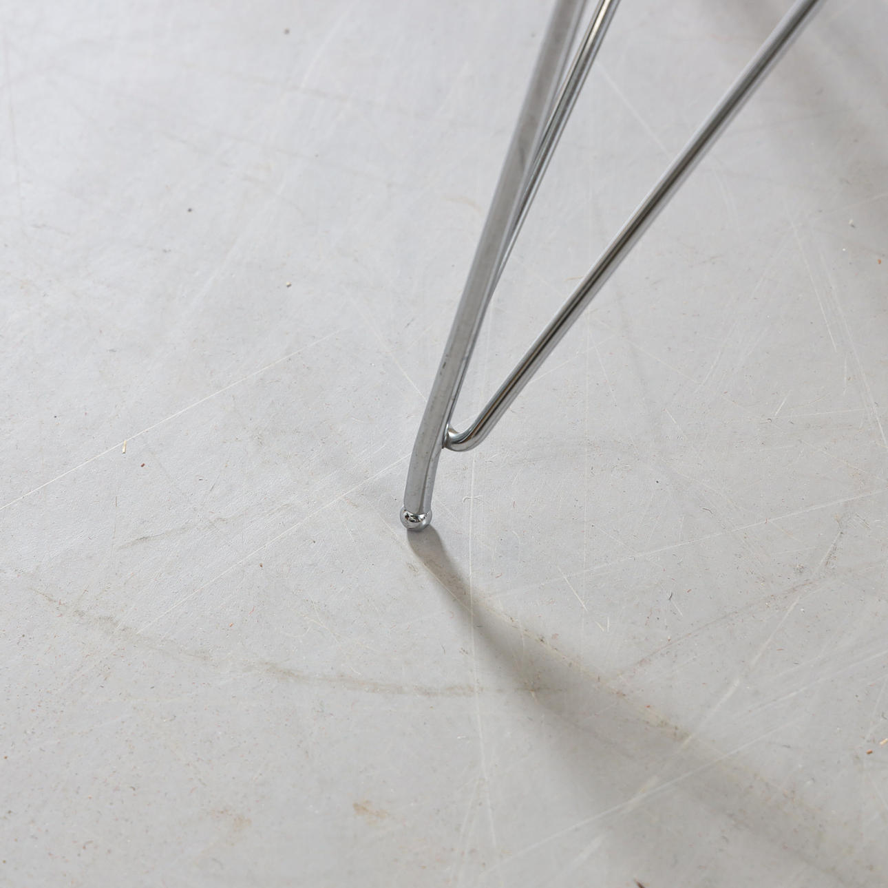 Muoviset valetut istuimet. Jalkateline kiiltävää kromattua metallia. Istuinkorkeus n. 44 cm.