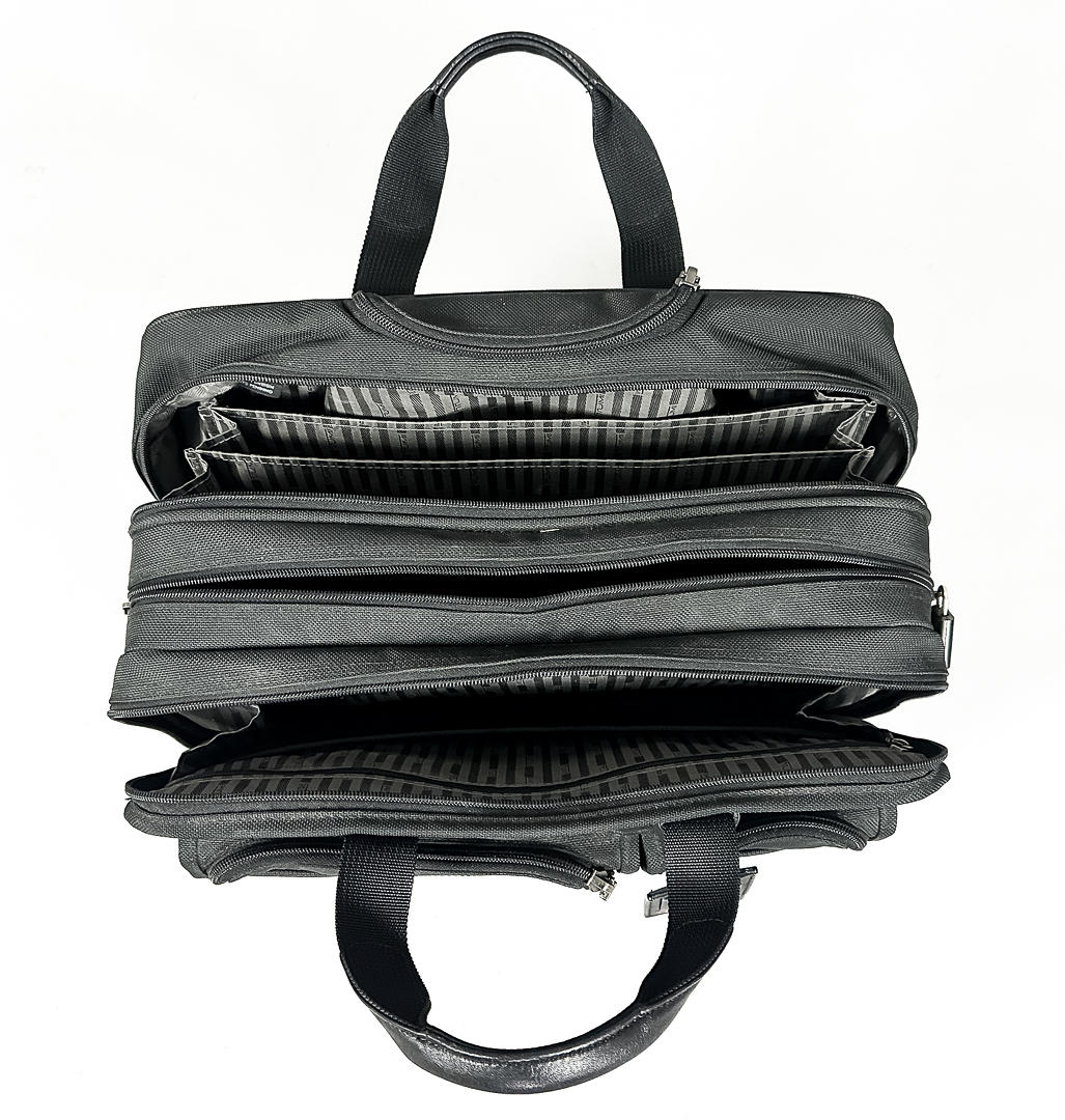 Käsilaukku, jossa kannettavan tietokoneen sisäosa, 4 vetoketjullista lokeroa ja neljä suurempaa lokeroa, 3 vetoketjulla. Teleskooppikahva, pyörät. Voidaan helposti yhdistää suureen pussiin. Koodilukko.