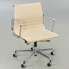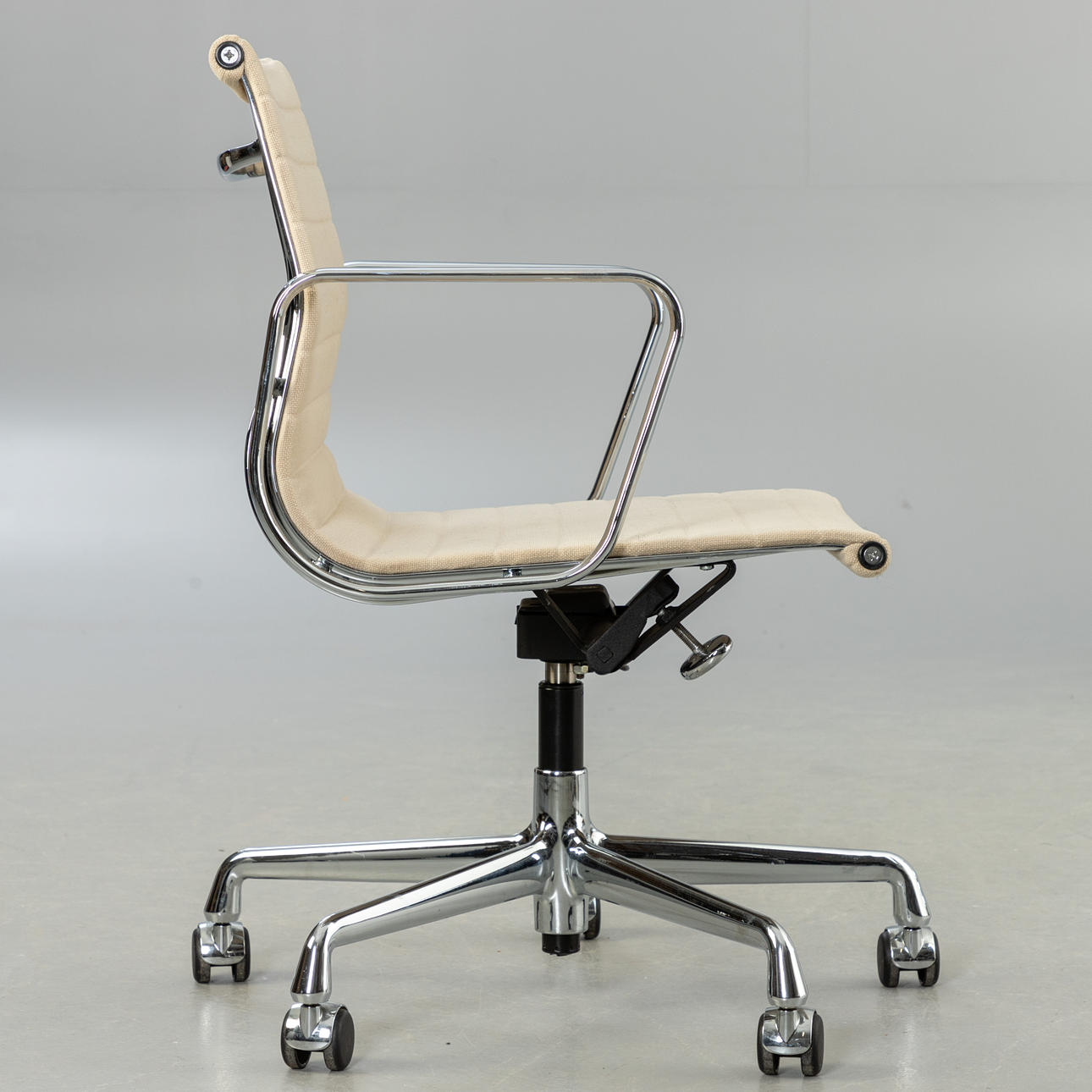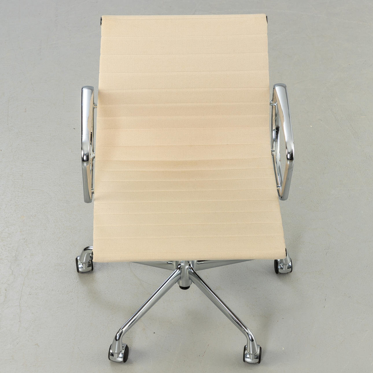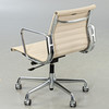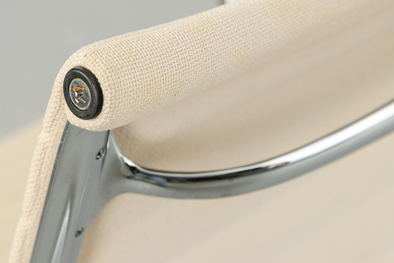 Ray & Charles Eames Alu Chair EA117 -työtuoli Vitralle. Suunnittelu: 1958. 5 tähden pohja painevaletuilla alumiinivanteilla, kromattu. Istuin päällystetty kermanvärisellä hopsakilla. Korkeuden säätö kaasujousen avulla. Sisäänrakennettu keinumekanismi Kirjoitettu.