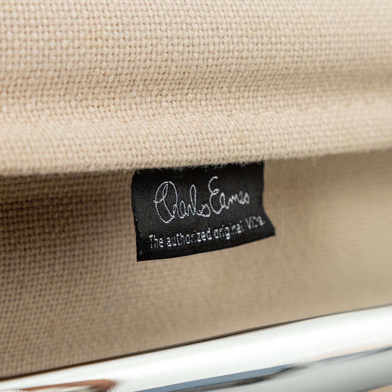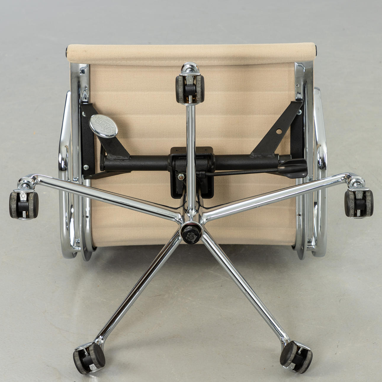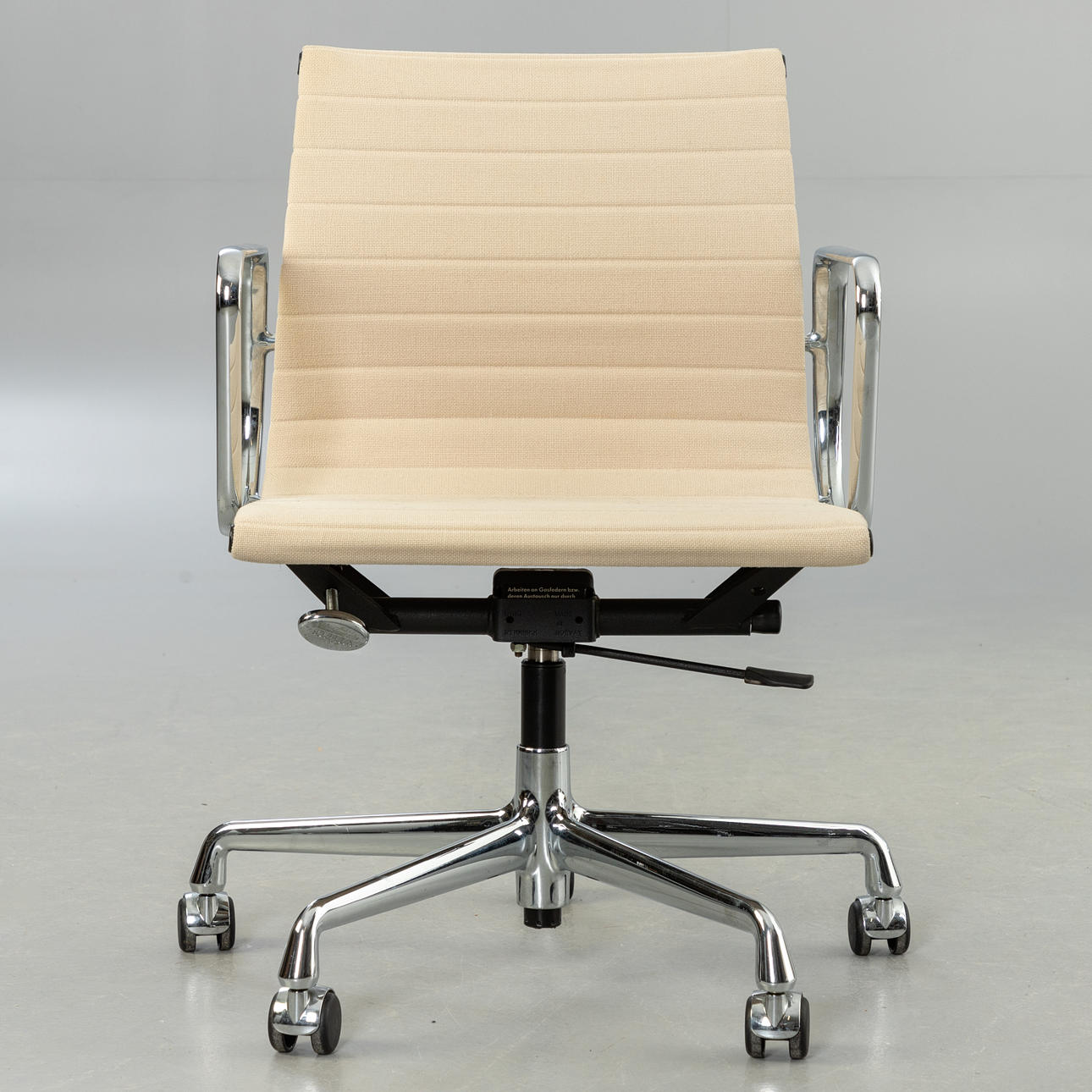Ray & Charles Eames Alu Chair EA117 -työtuoli Vitralle. Suunnittelu: 1958. 5 tähden pohja painevaletuilla alumiinivanteilla, kromattu. Istuin päällystetty kermanvärisellä hopsakilla. Korkeuden säätö kaasujousen avulla. Sisäänrakennettu keinumekanismi Kirjoitettu.