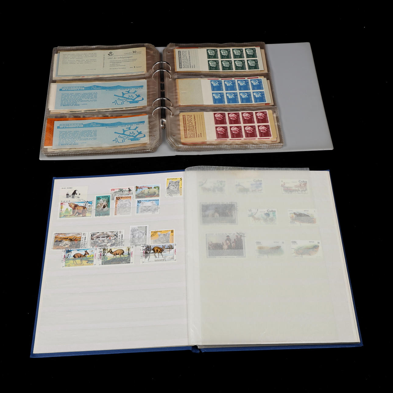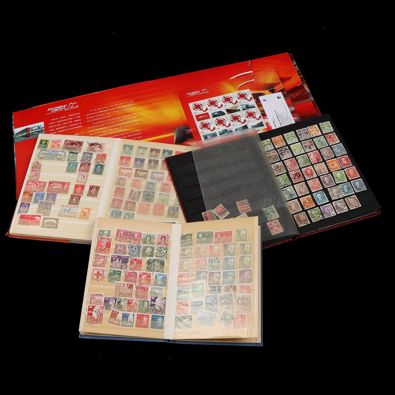 Neljä albumia sekapostimerkkejä eri puolilta maailmaa, pääosin leimattuja.