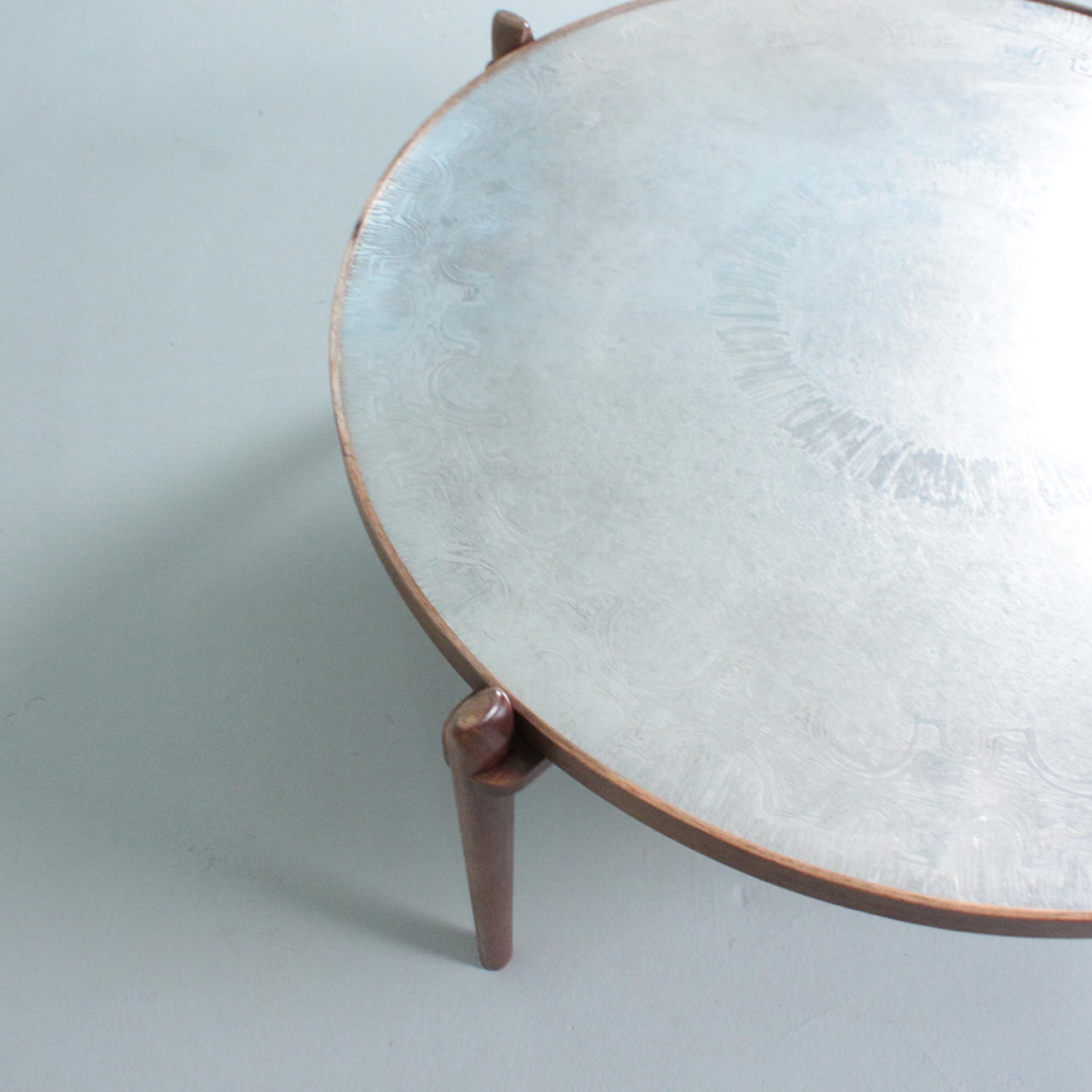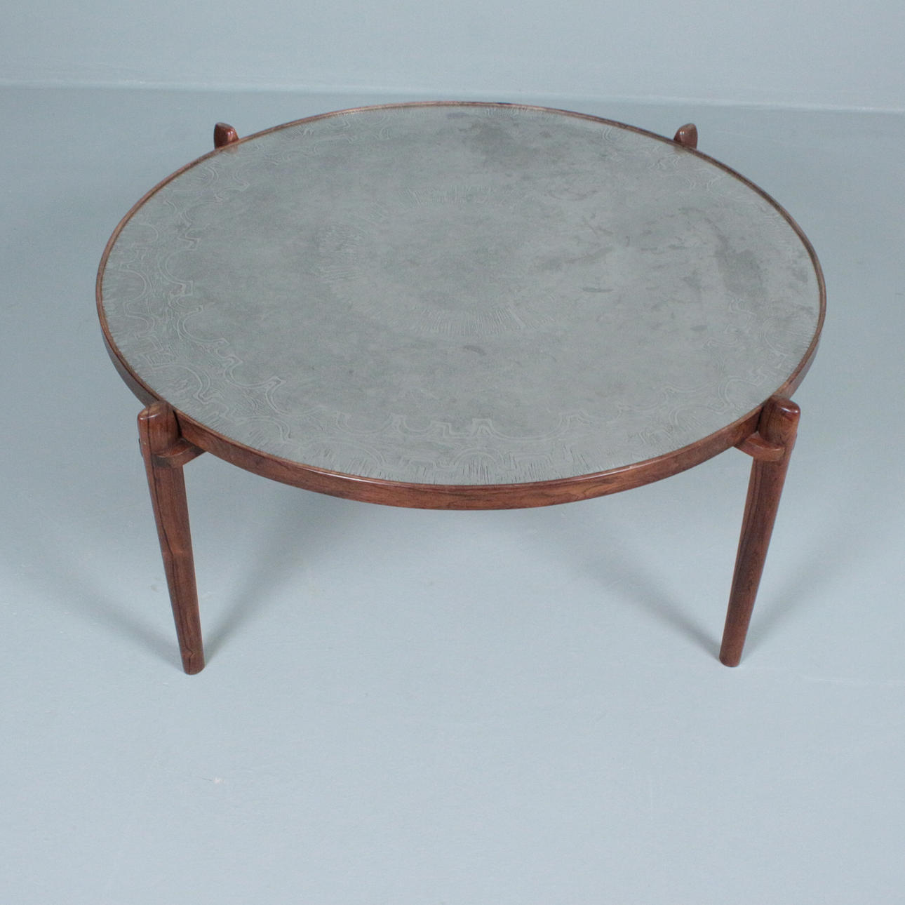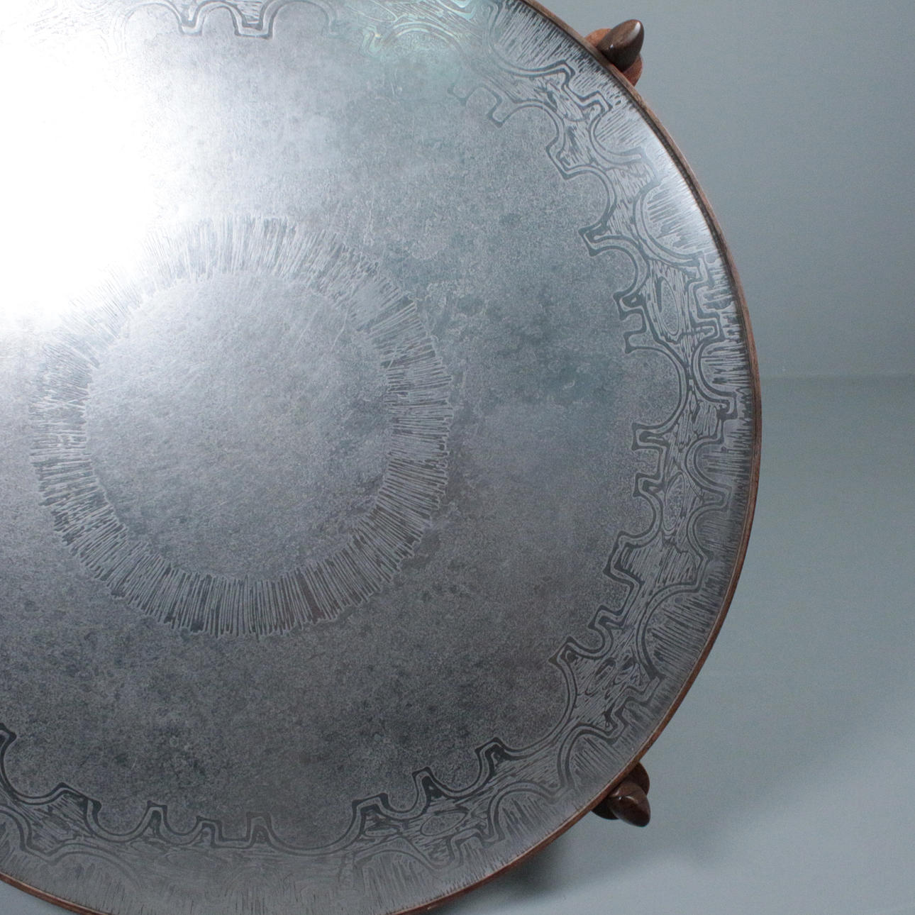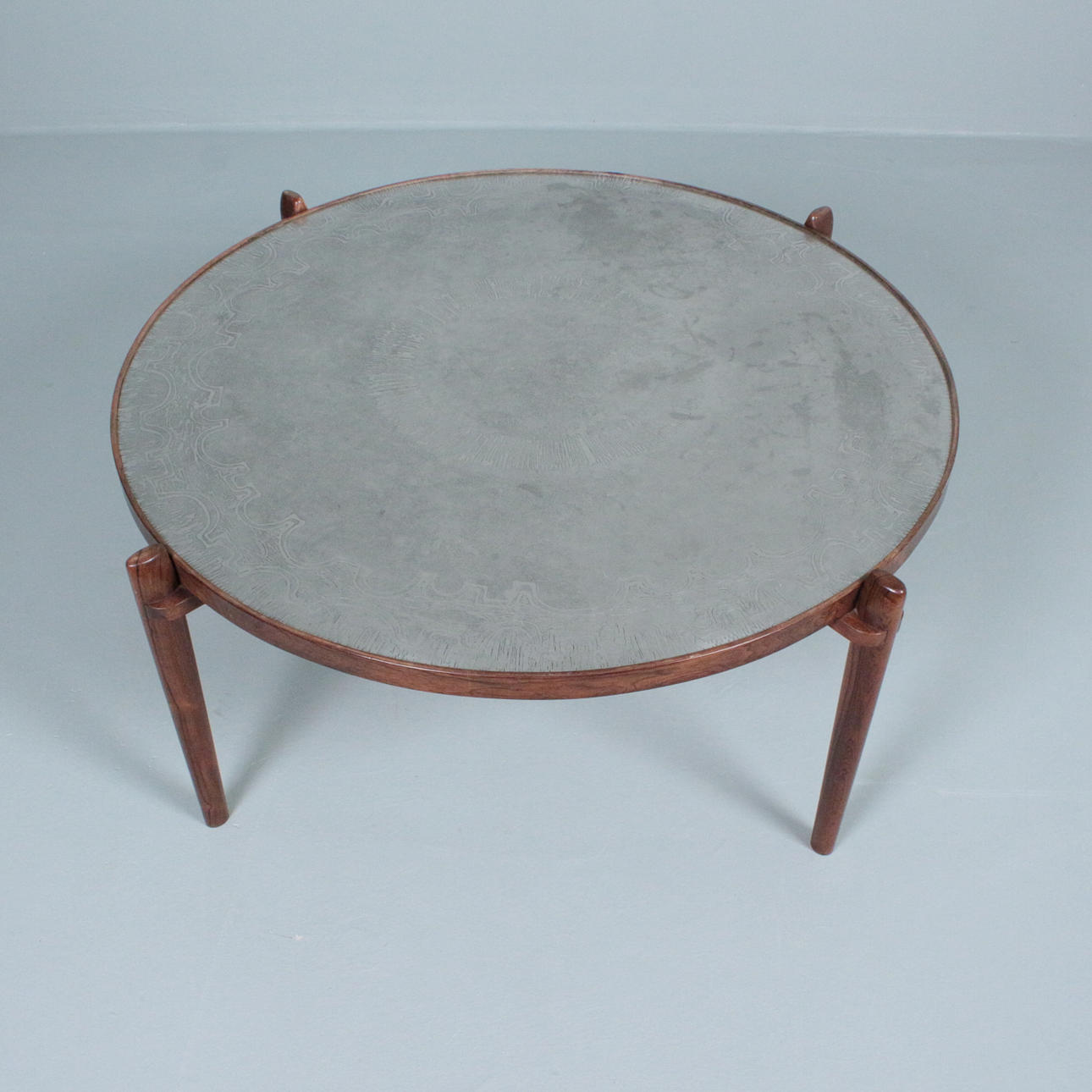 Sohvapöytä/sohvapöytä, malli E8 by Heinz Lilenthal, pyöreä puinen sohvapöytä etsatulla alumiinilevyllä. Mitat: Korkeus 46 cm, Ø 110 cm.