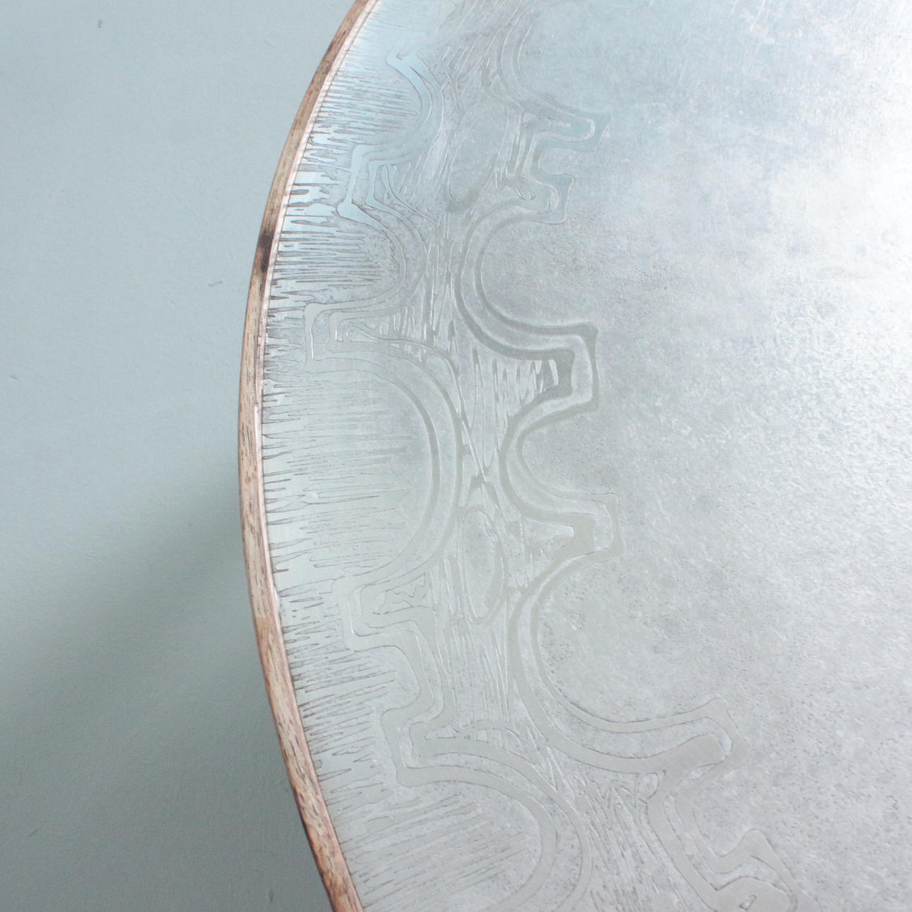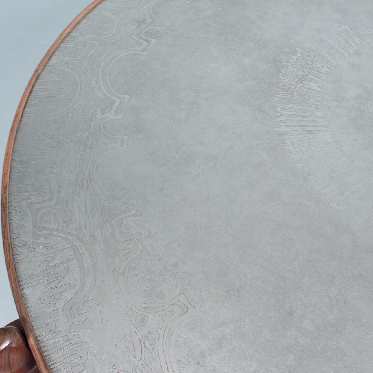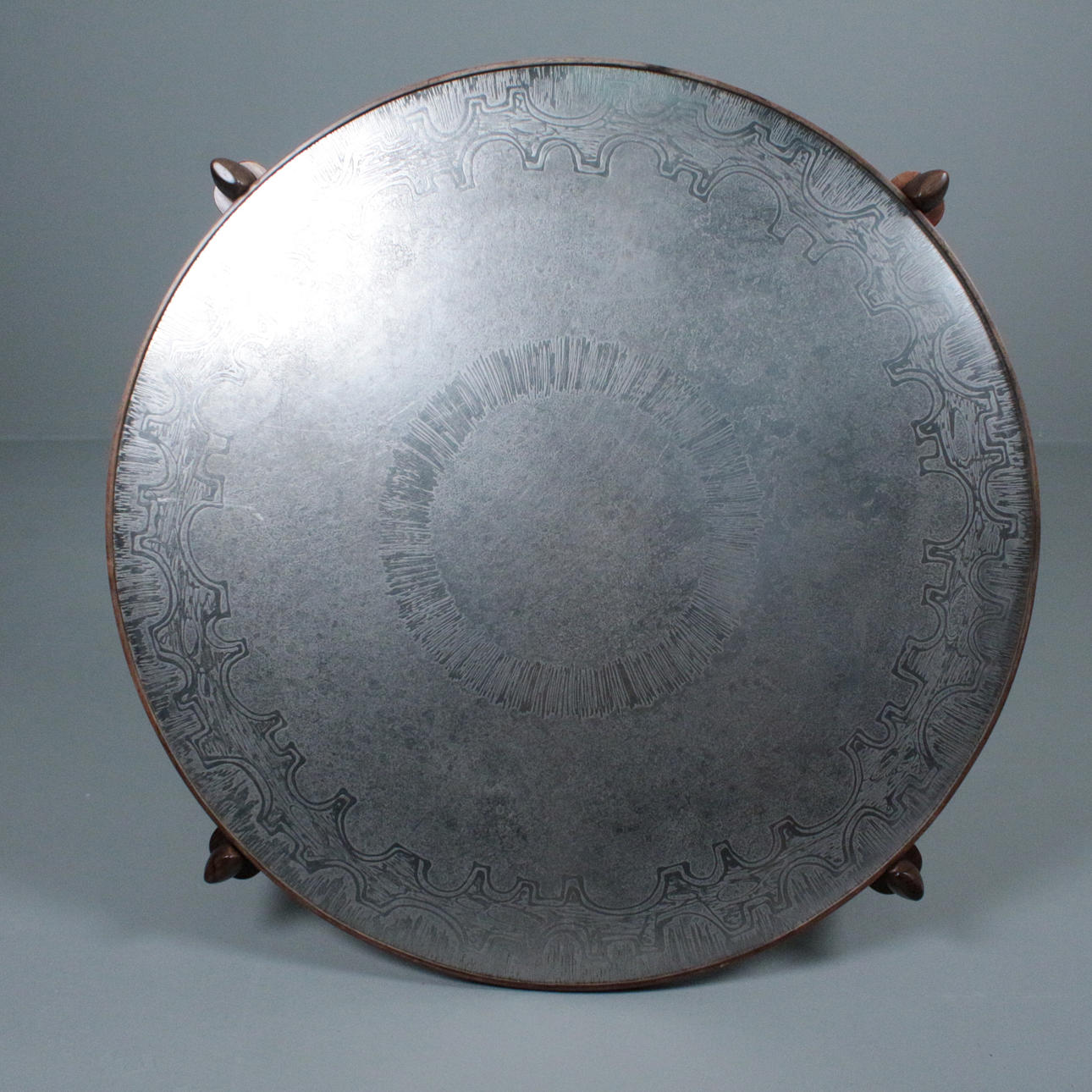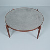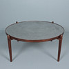 Sohvapöytä/sohvapöytä, malli E8 by Heinz Lilenthal, pyöreä puinen sohvapöytä etsatulla alumiinilevyllä. Mitat: Korkeus 46 cm, Ø 110 cm.