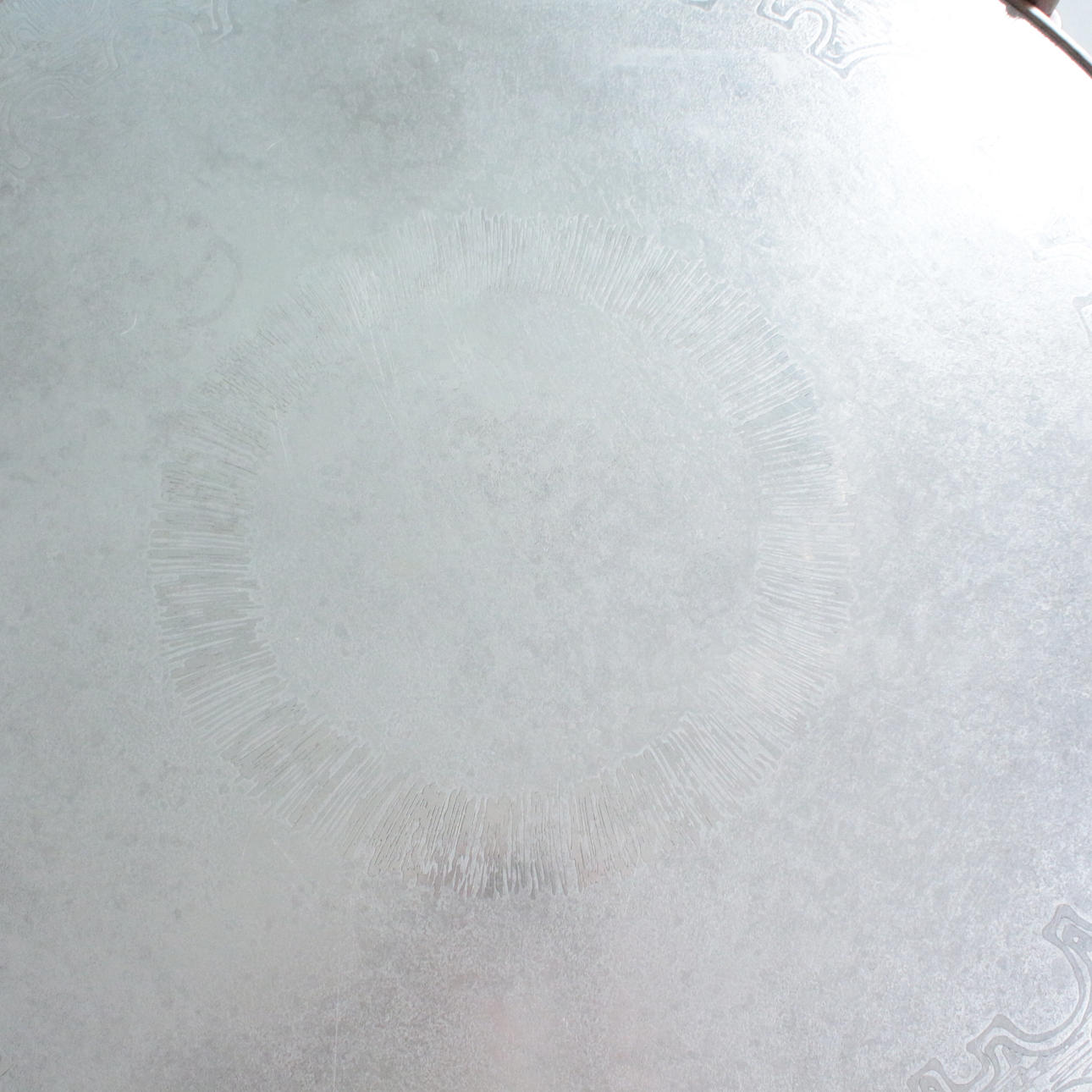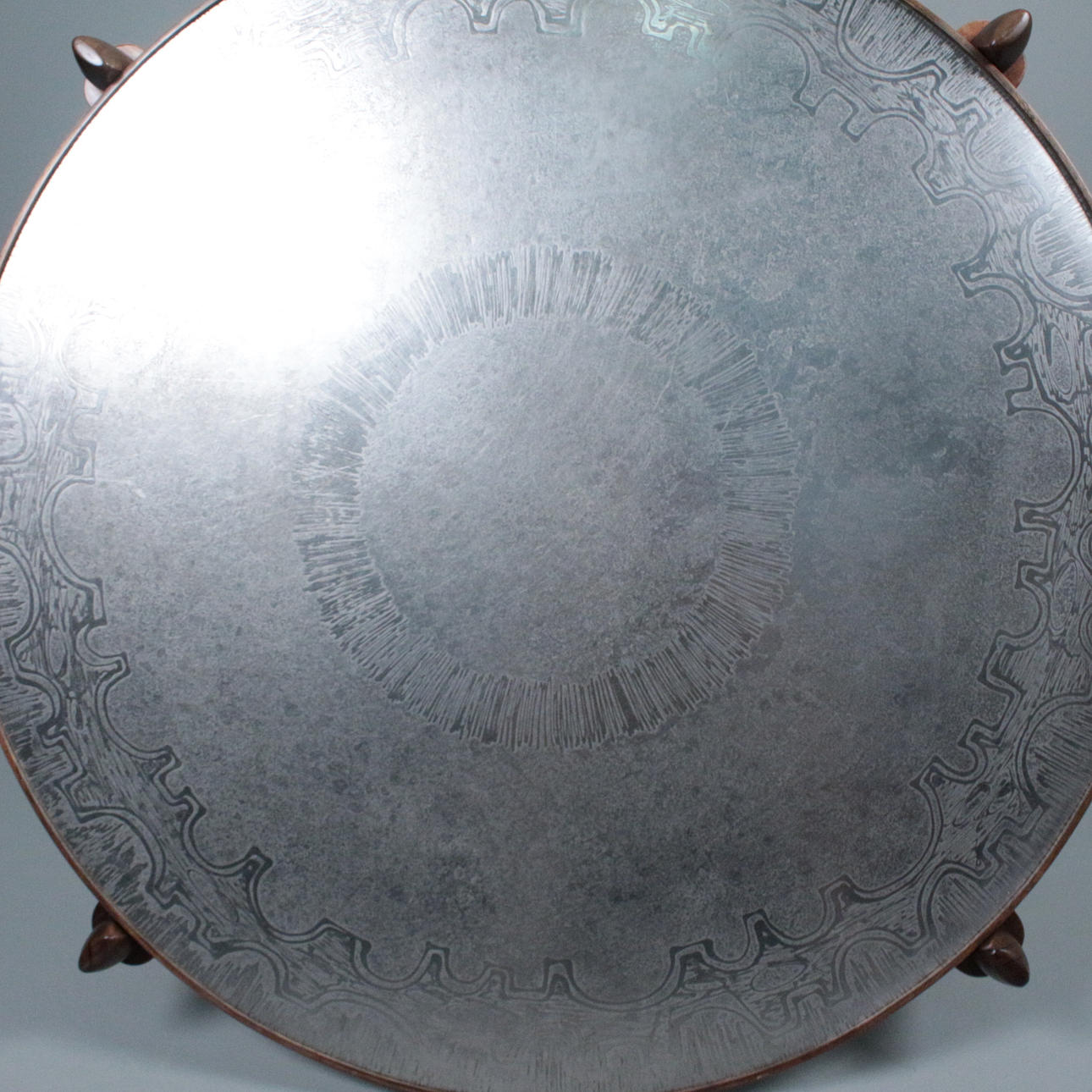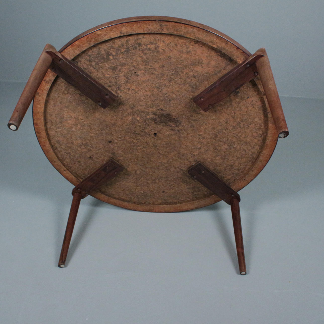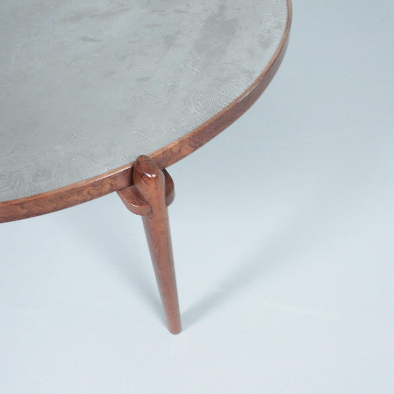 Sohvapöytä/sohvapöytä, malli E8 by Heinz Lilenthal, pyöreä puinen sohvapöytä etsatulla alumiinilevyllä. Mitat: Korkeus 46 cm, Ø 110 cm.