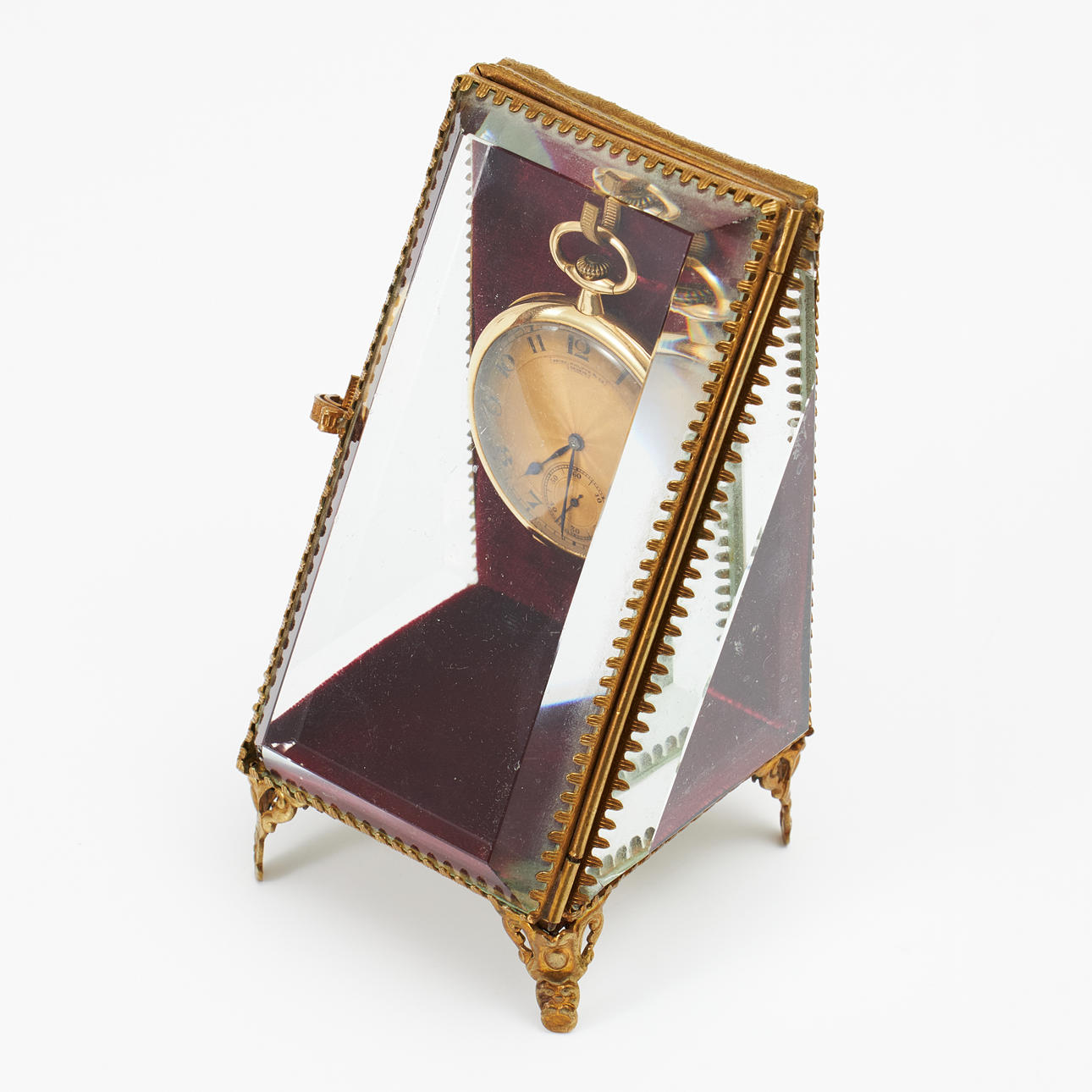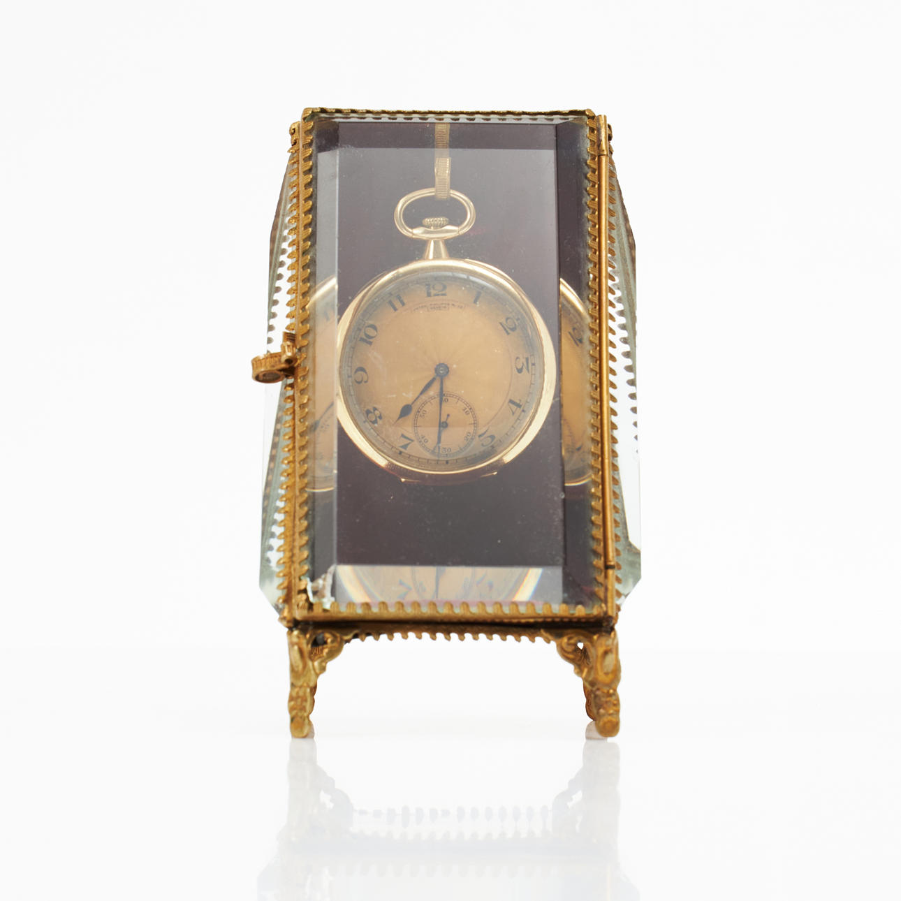 Kellotaulu arabialaisilla numeroilla, sisäkansi 18 k, kotelo nro. 404900, sarjanumero. 185993, laki nro. 185993, halkaisija 46 mm, paino noin 64 g, jalusta mukana