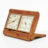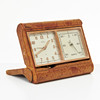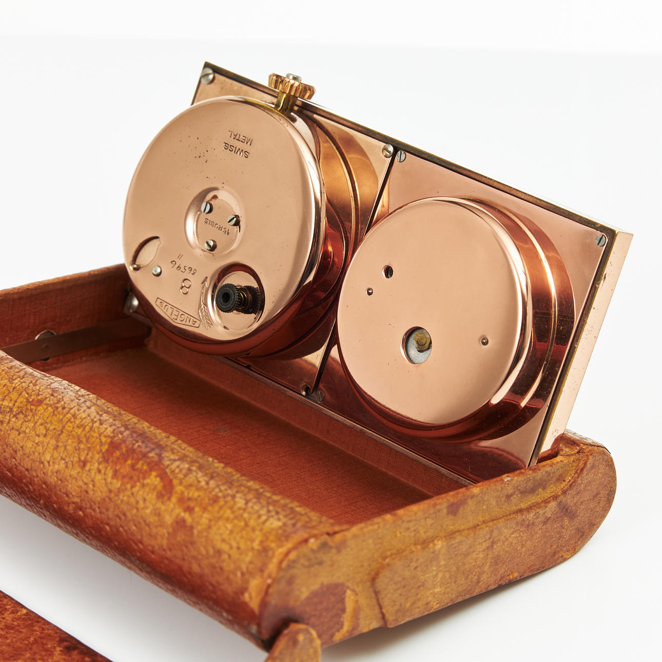 Manuaalinen, barometri, hälytys, 8 päivän tehoreservi, nahkapäällysteinen ja kuparinvärinen metalli, korkeus taitettu 11 cm.