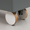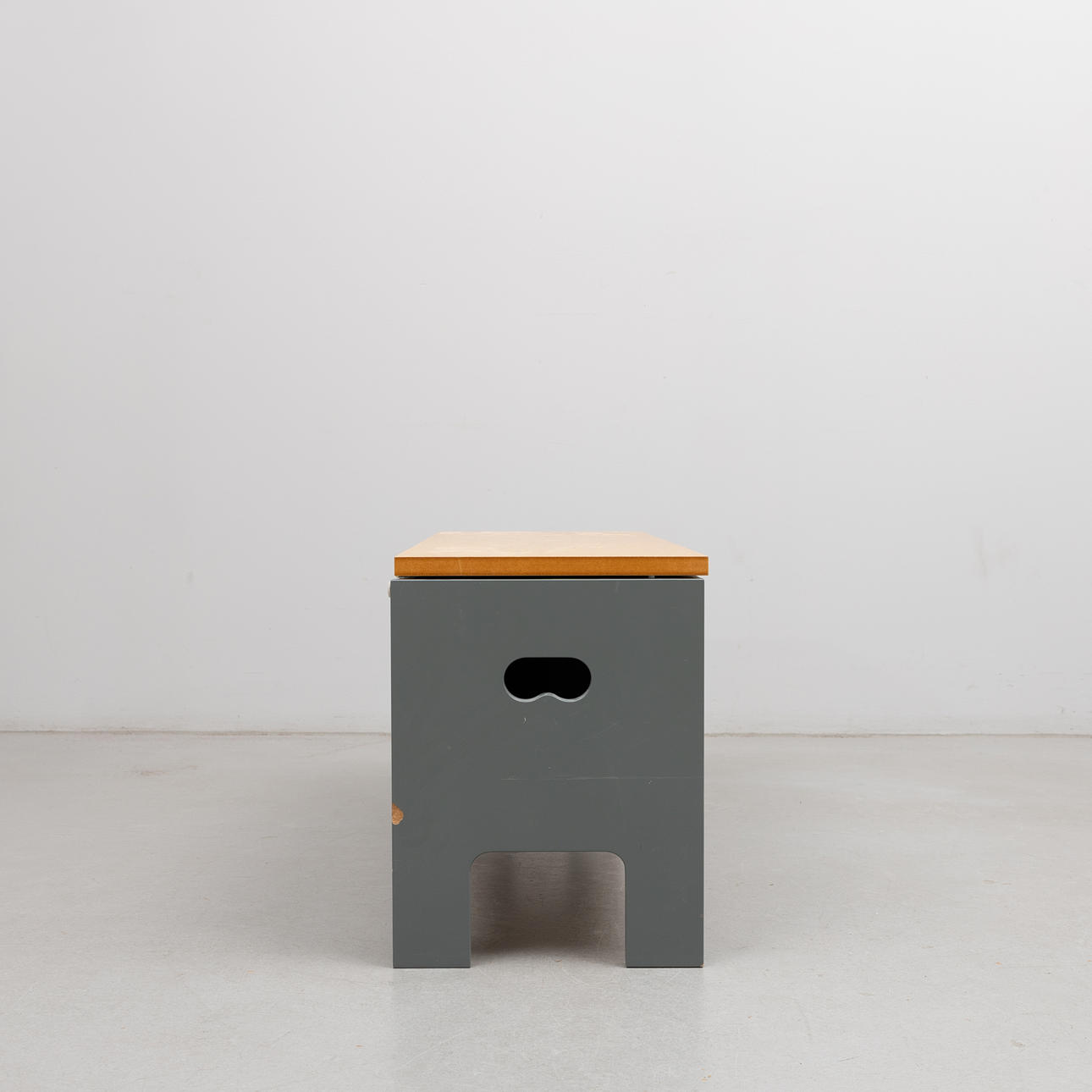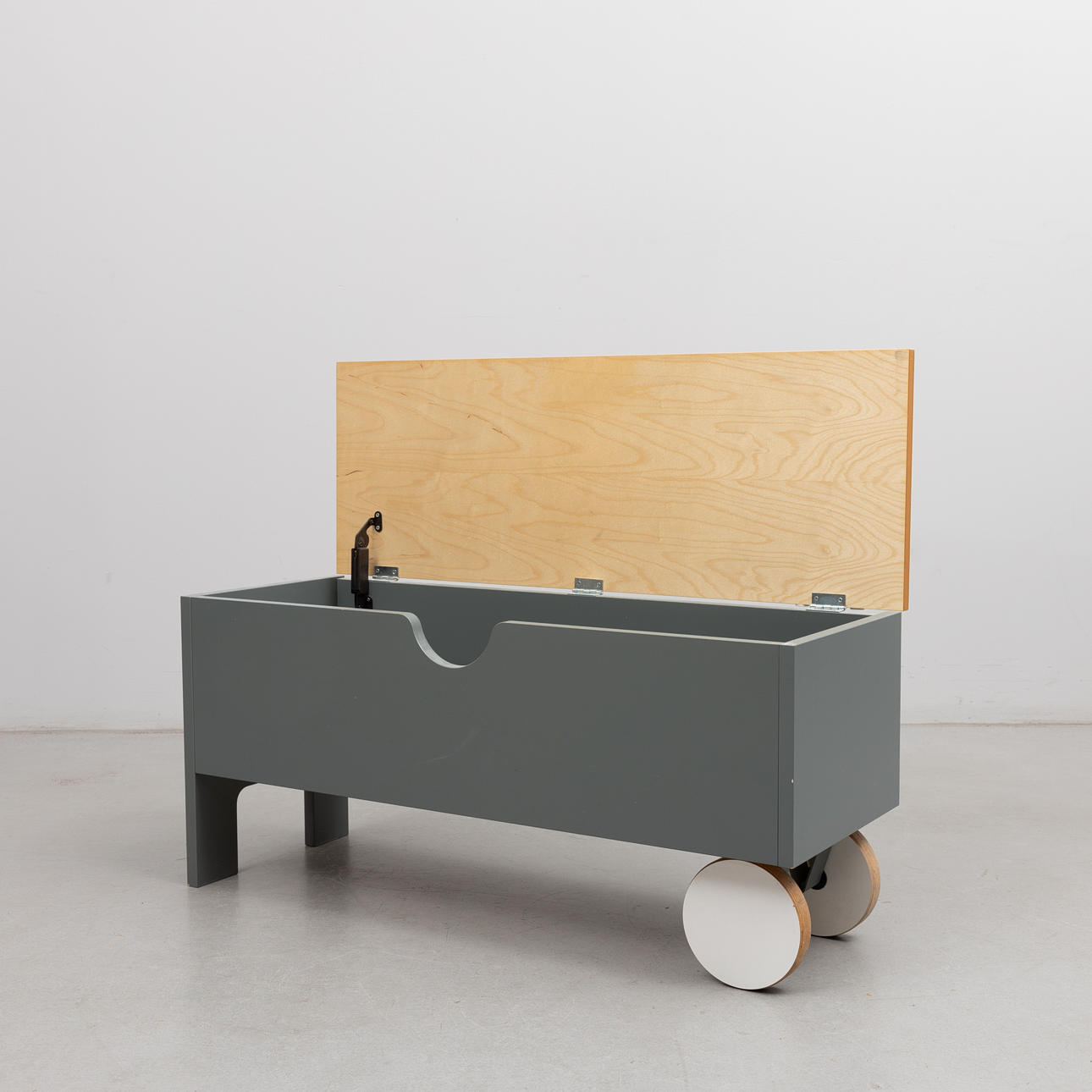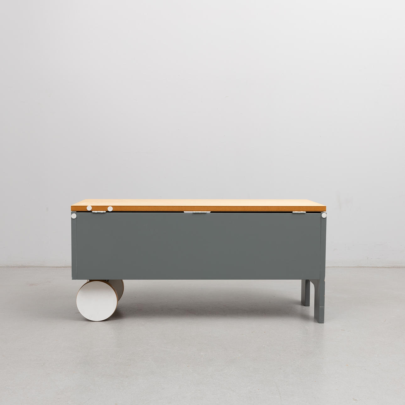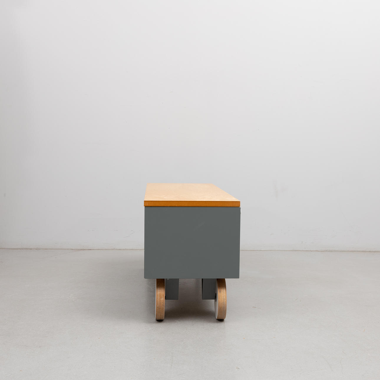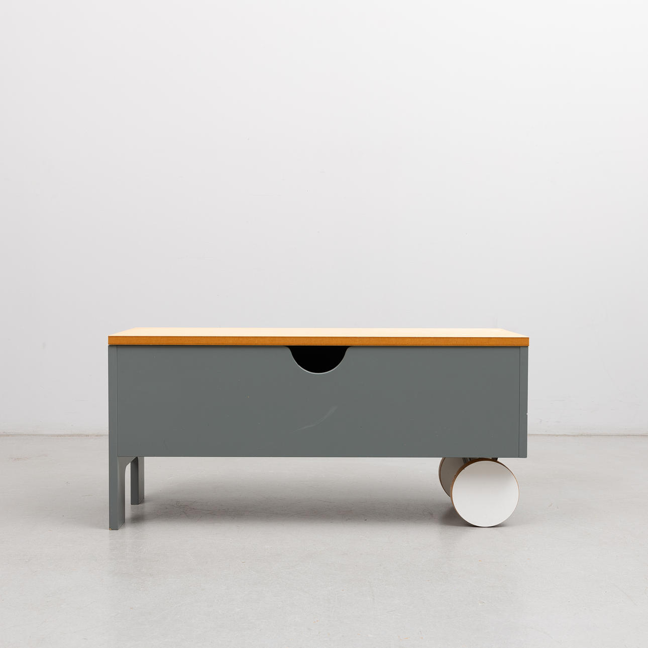 Puuta, harmaalakattu ja taittolevy koivua. Toinen puoli pyörillä. n. 90 x 32, korkeus 42 cm.