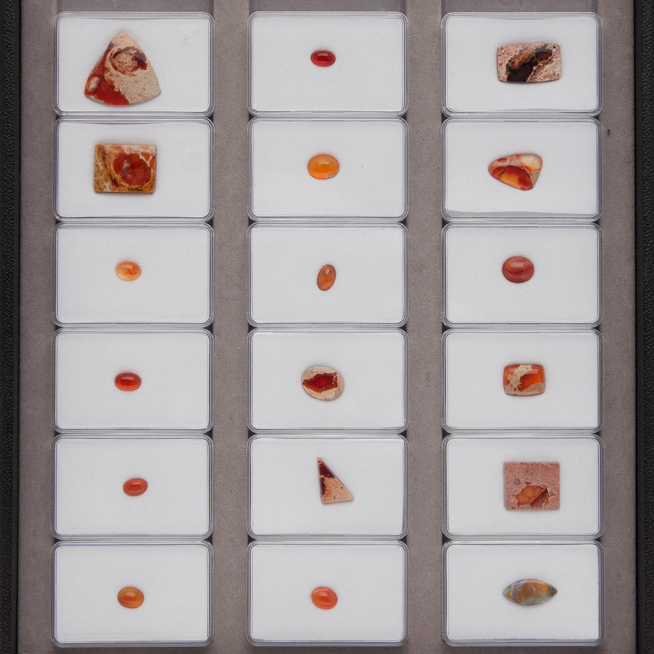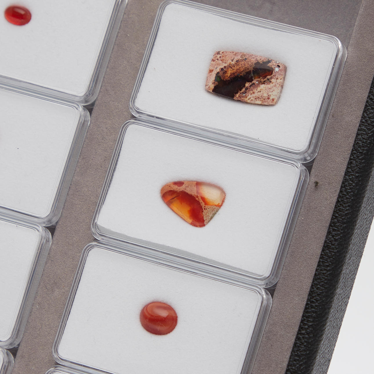Kokoelma irtonaisia tuliopaaleja ja lohkareopaali-navettia yhteensä n. 84,60 ct. eri väreissä, leikkauksissa ja kooissa.