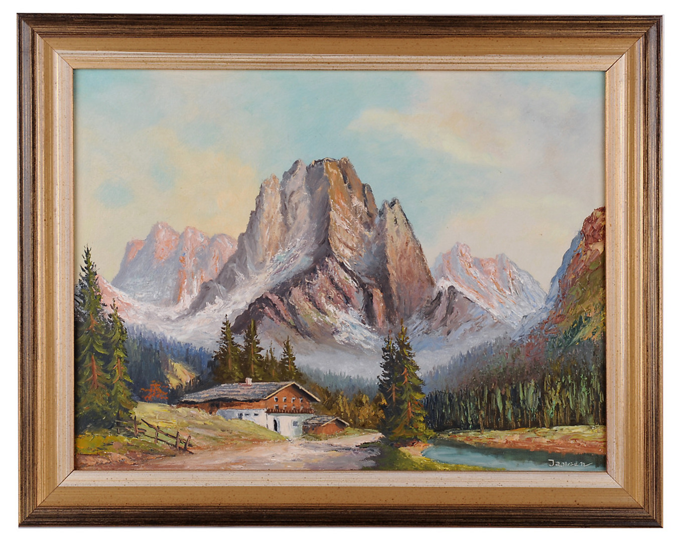 331375. SIGNIERT JANZEN. Kota kohoavan vuoriston edessä.