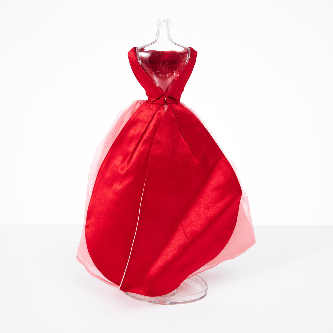 Mekko, jossa vaaleanpunainen sifonkihame ja punainen satiiniliivi,