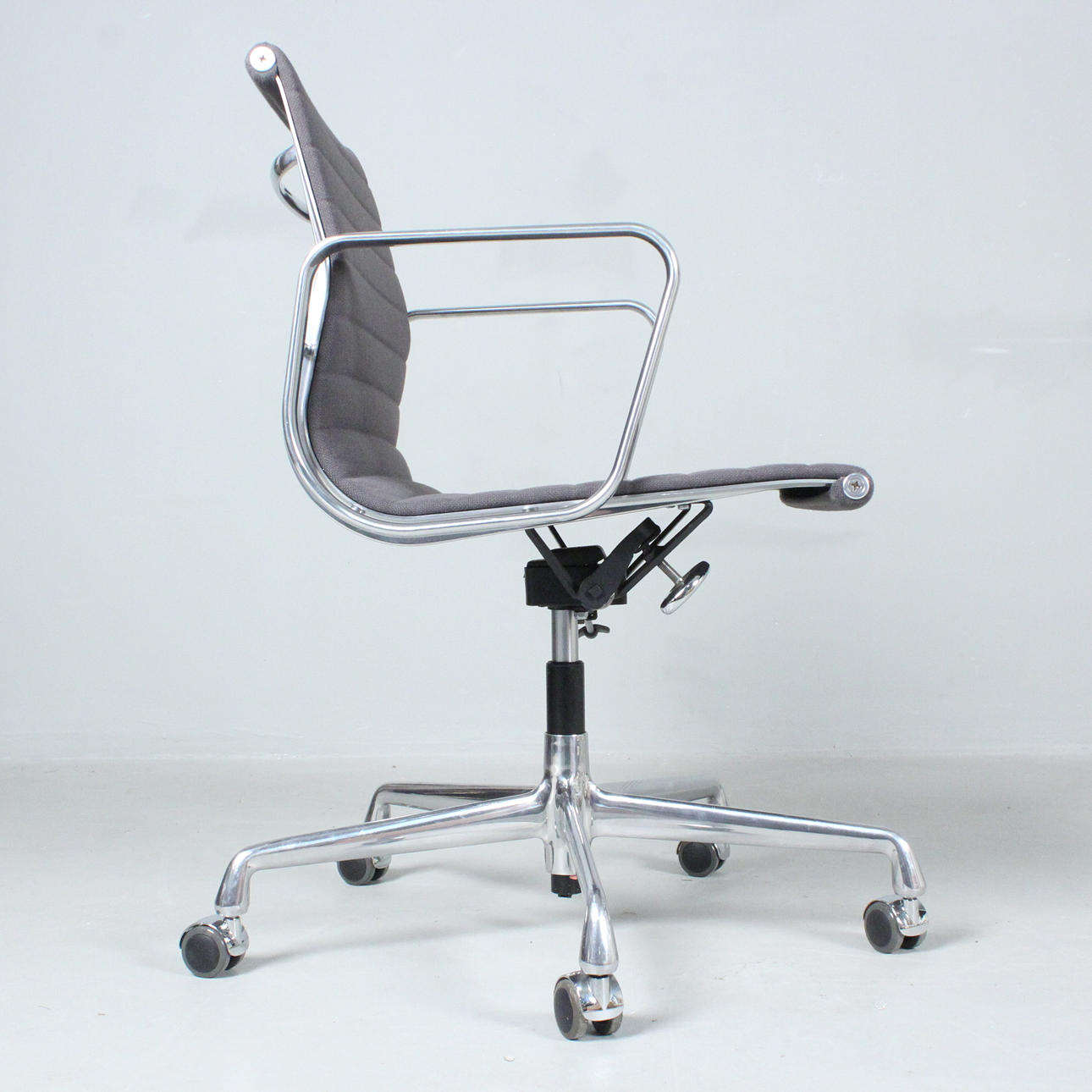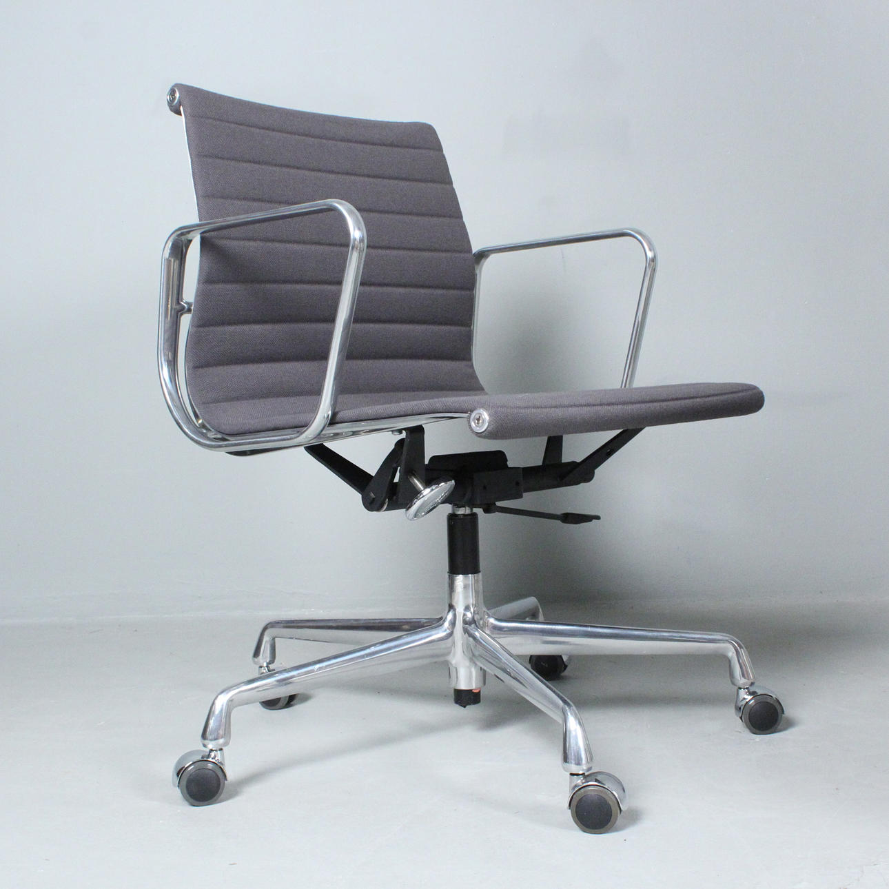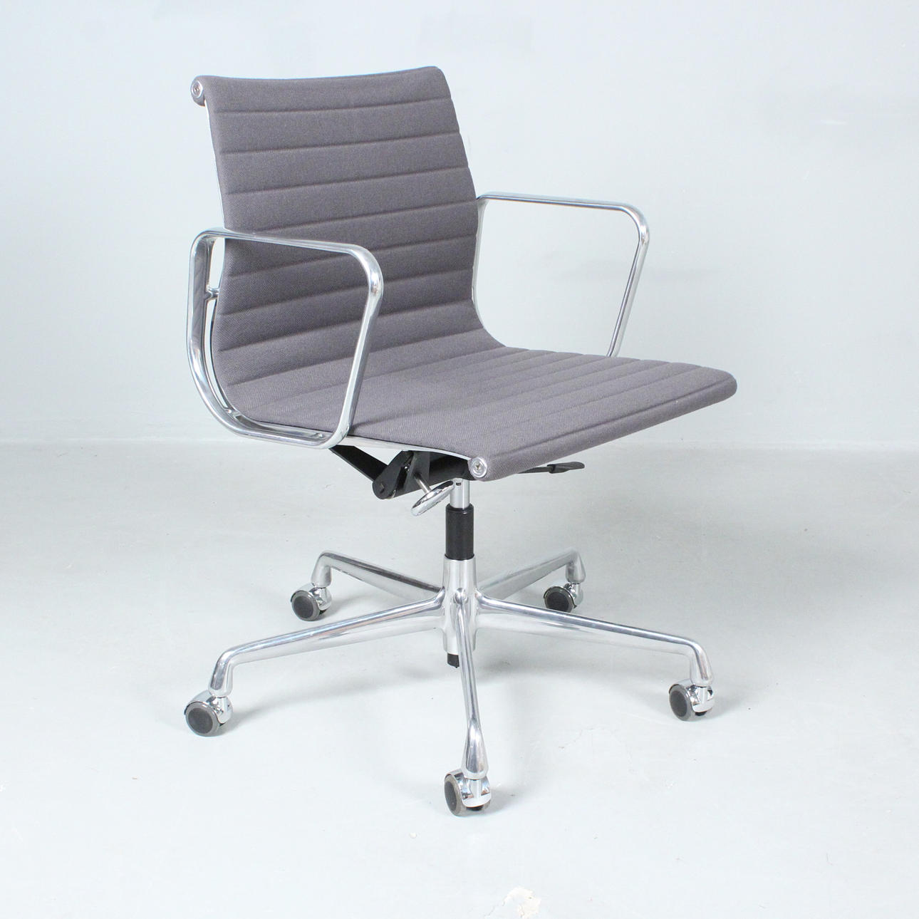 Ray & Charles Eames Vitralle, työtuoli/alumiinituoli 'EA117', 5 tähden jalusta pyörillä painevalettua alumiinia, kromattu, istuin päällystetty harmaalla hopsakilla, korkeuden säätö kaasujukella,