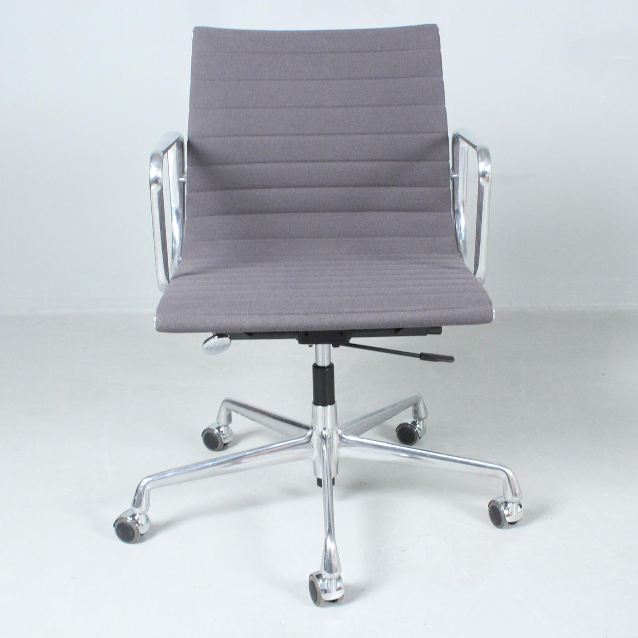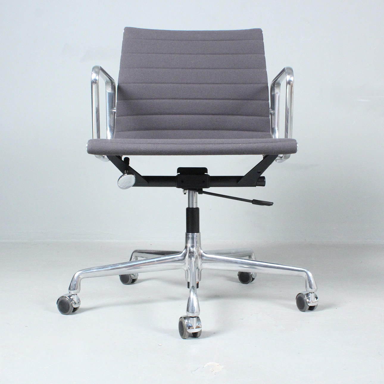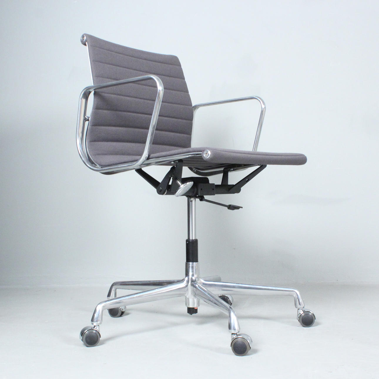 Ray & Charles Eames Vitralle, työtuoli/alumiinituoli 'EA117', 5 tähden jalusta pyörillä painevalettua alumiinia, kromattu, istuin päällystetty harmaalla hopsakilla, korkeuden säätö kaasujukella,