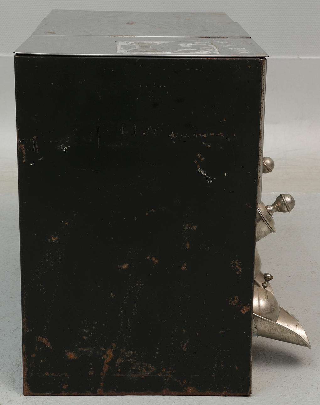 Rajoitettu/huono haju. Lika, ruoste. Yksi laatikko puuttuu. Kauhojen kahva on löysä.