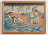 Japanilainen puupiirros, joka kuvaa kahta ihmistä pienessä veneessä, joka sijaitsee puisessa ja lasitetussa kehyksessä 54 cm x 40 cm kehys mukaan lukien.