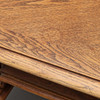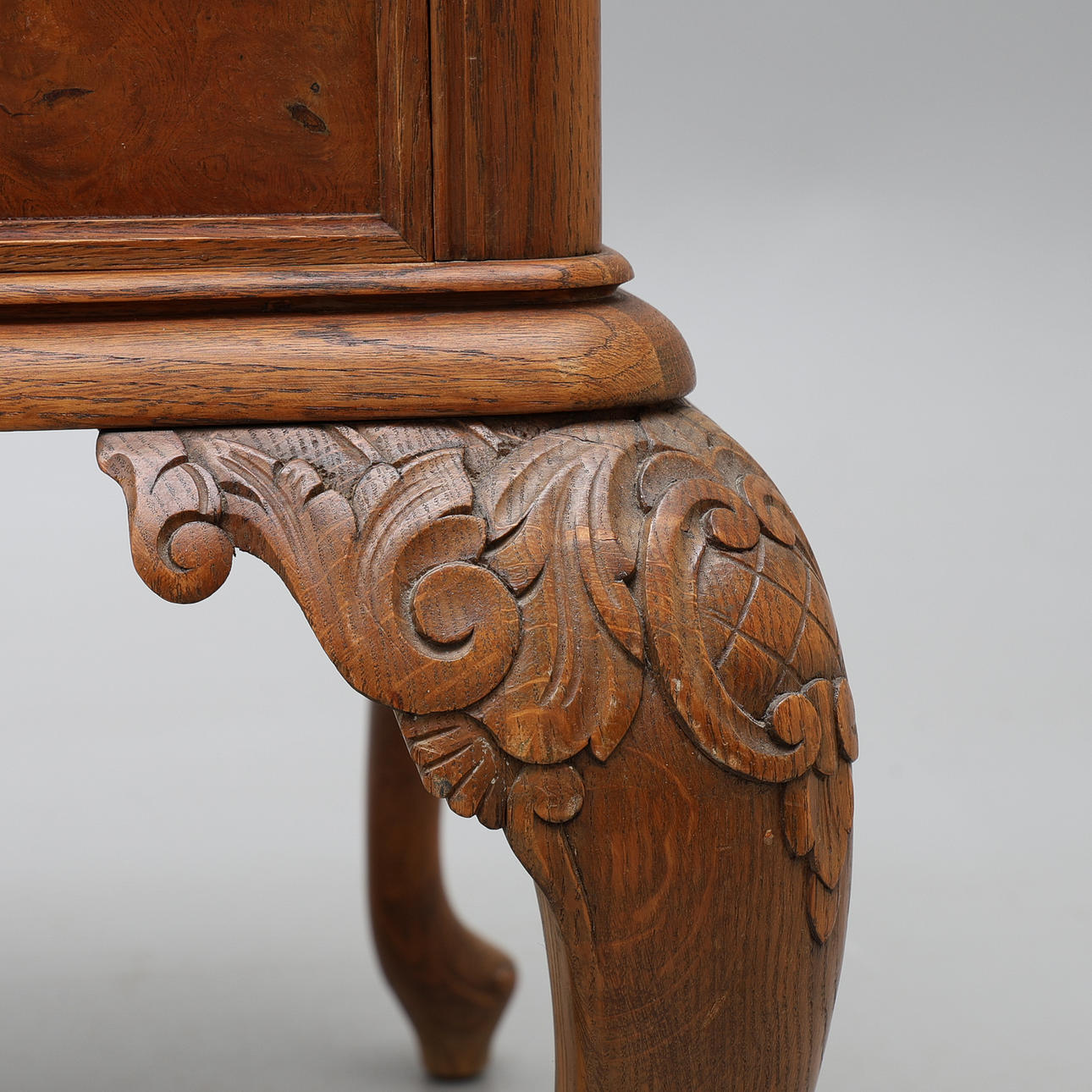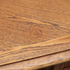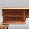Tammipöytä leikattuilla yksityiskohdilla, tammi- ja pyökkikoriste. 5 ulosvedettävää laatikkoa edessä ja hylly takana. Sen alapuolella on merkitty 1138.