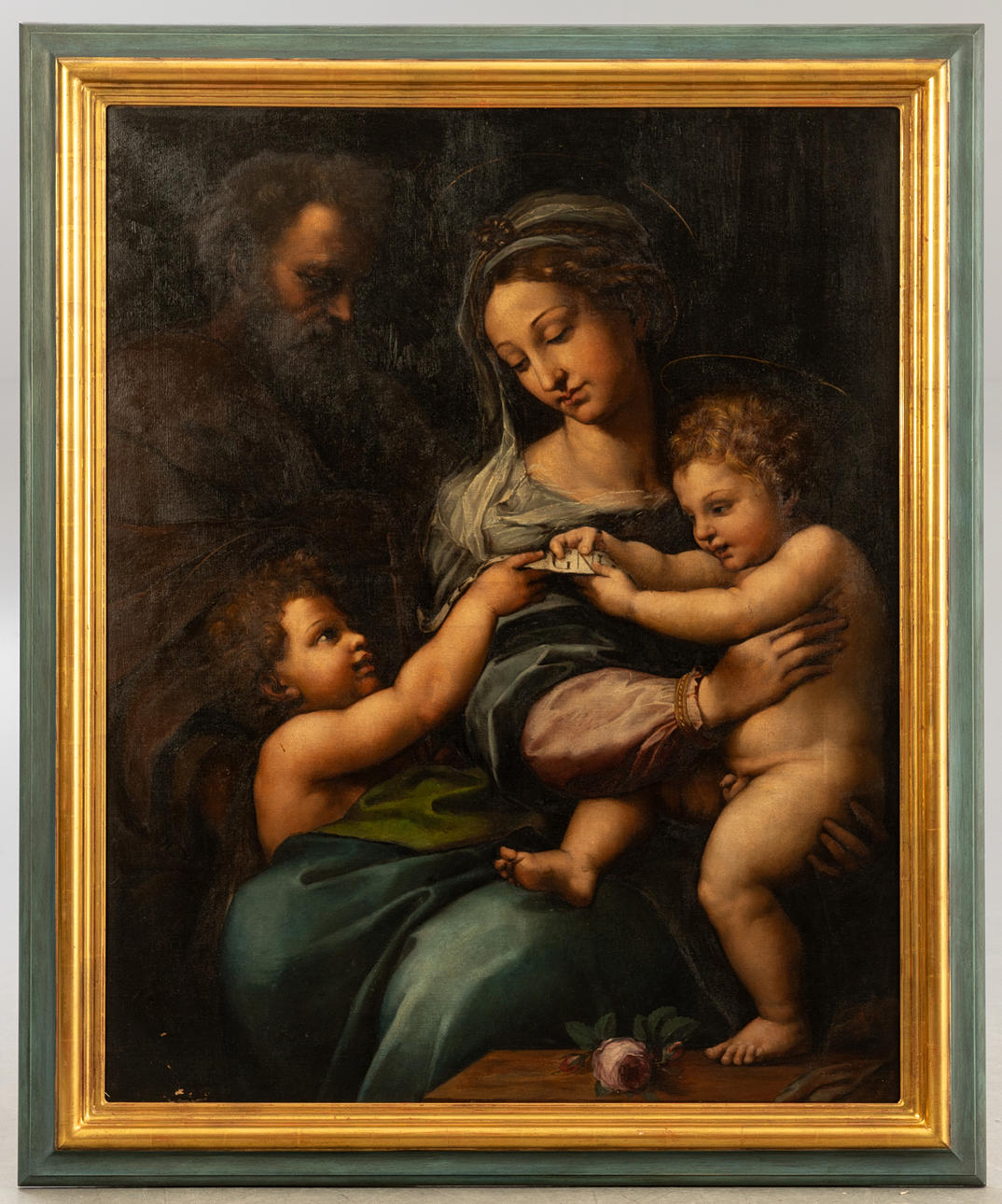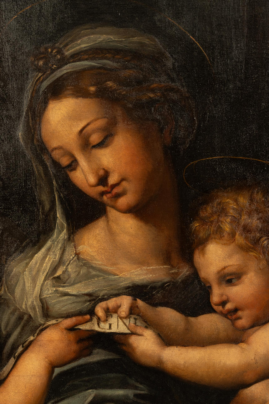 Ferdinand Schauss (1832-1916), kopio Raffaello Santin (1483-1520) mukaan, Madonna della Rosa, öljy kankaalle, 1864, signeerattu ja päivätty paarinkehyksen takana, n. 106 x 86,5 cm, kehyksellä n. 121 x 100 cm.