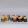 13 eriväristä sinappipurkkia, useimmissa tarroilla.