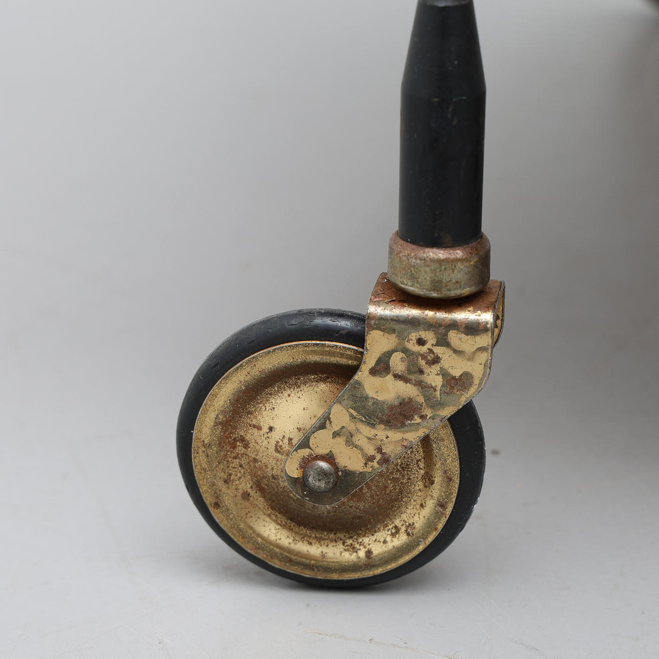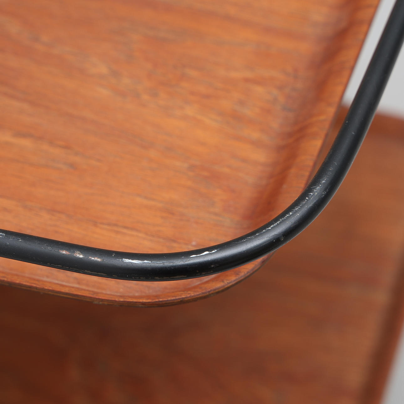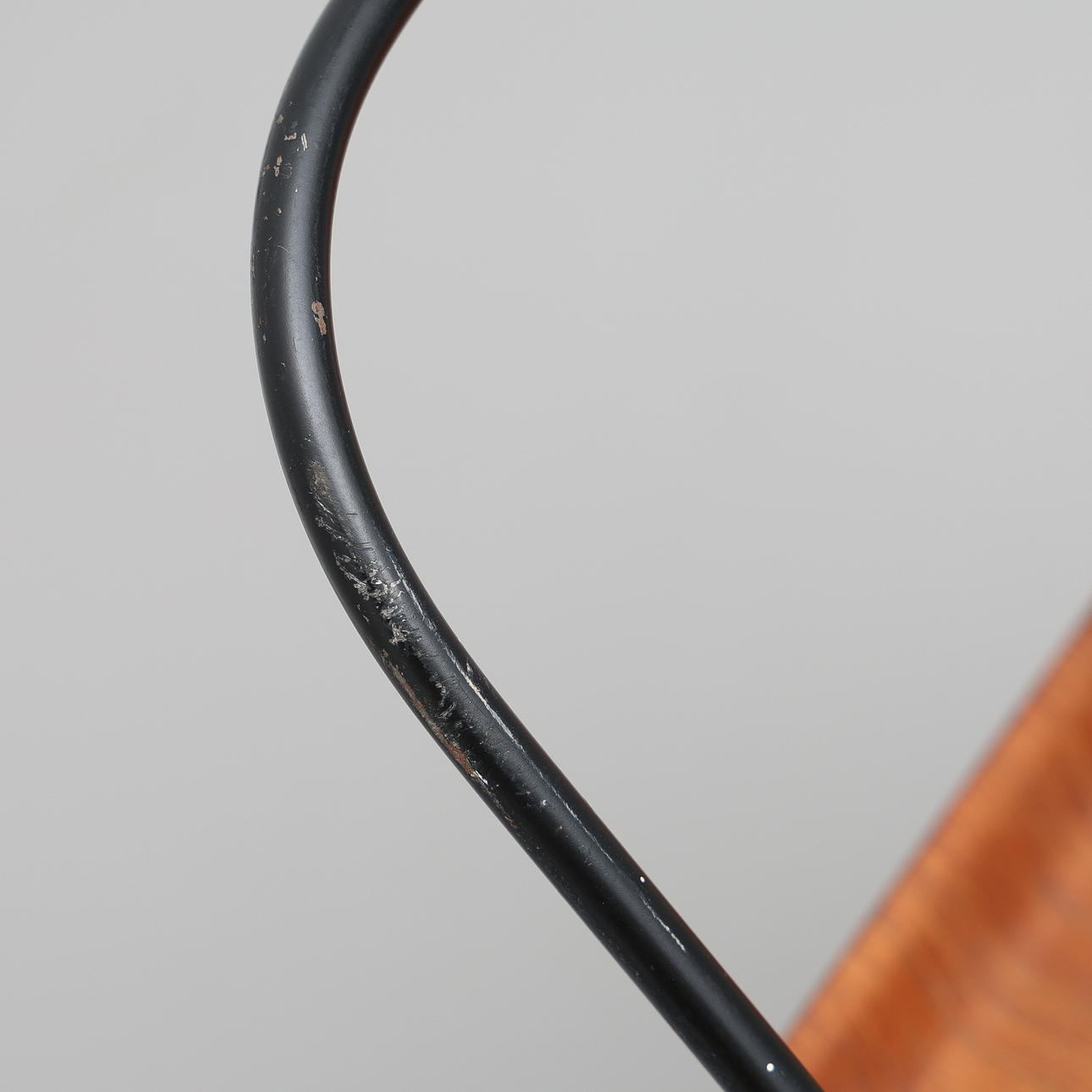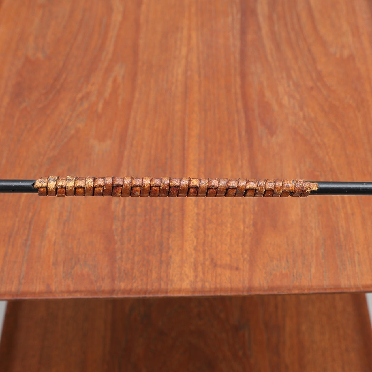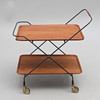 Löysät tiikkilaatat, runko mustalla lakatulla metallilla ja messinkiyksityiskohdat. Korkeus 68 cm, pituus 67 cm.