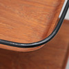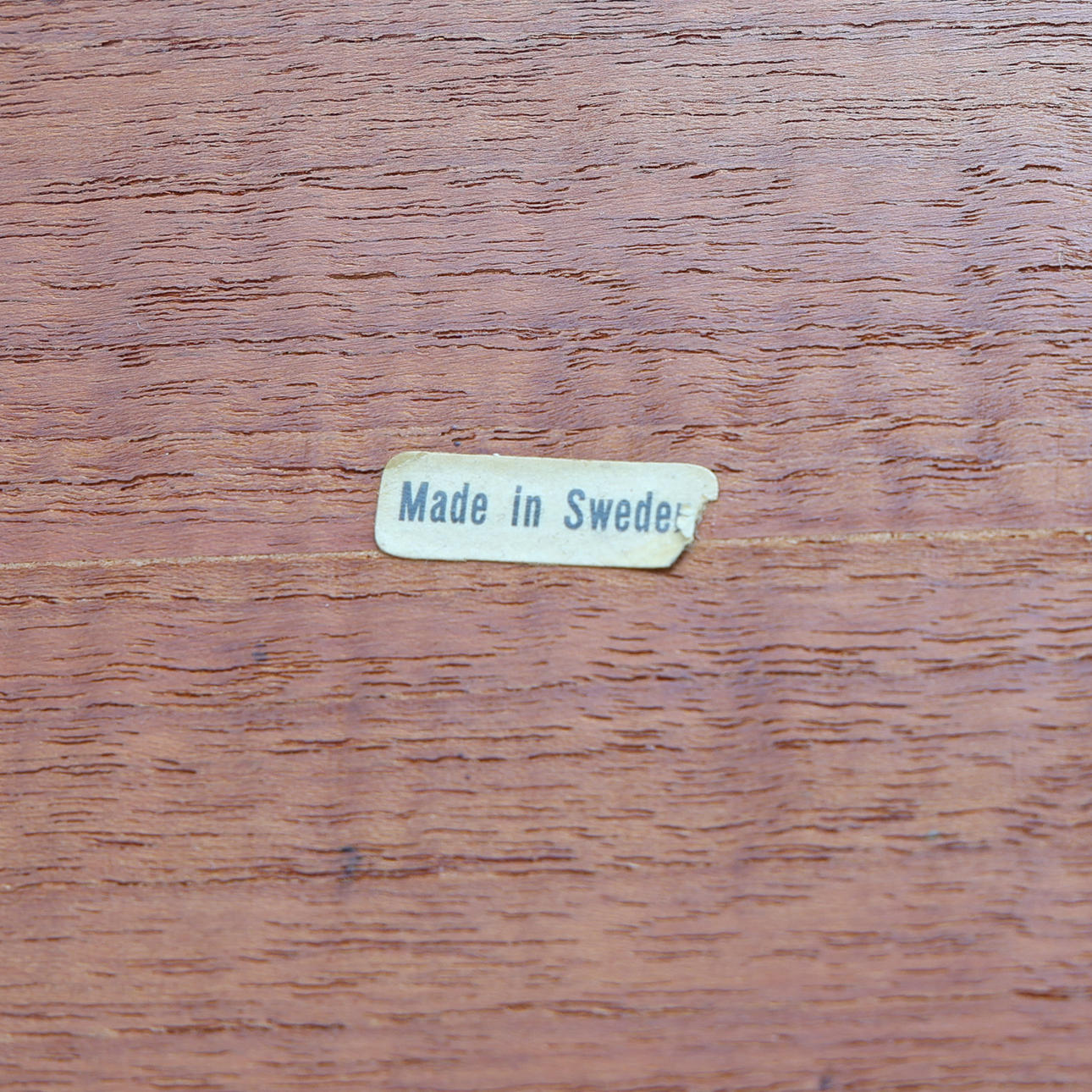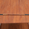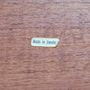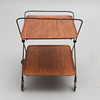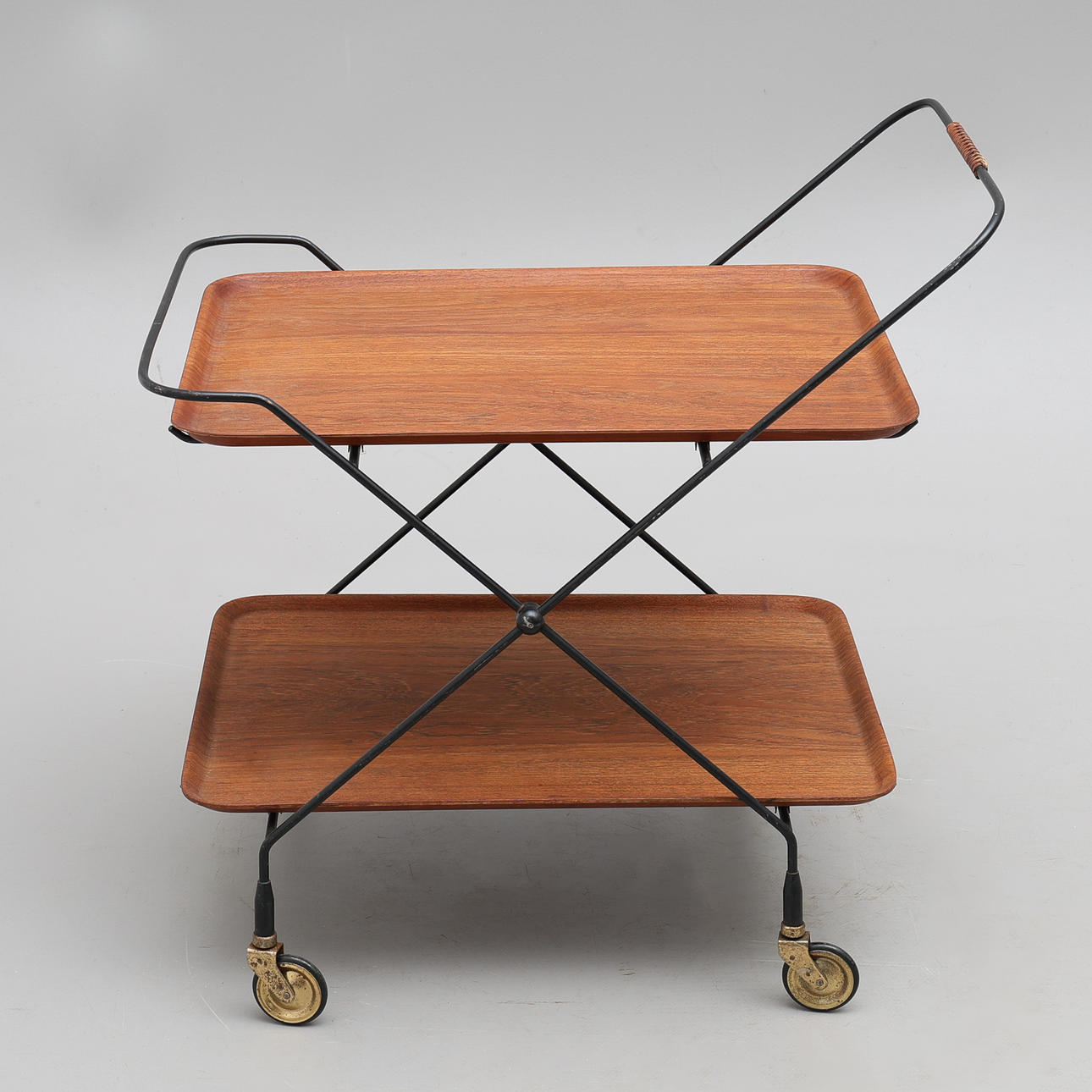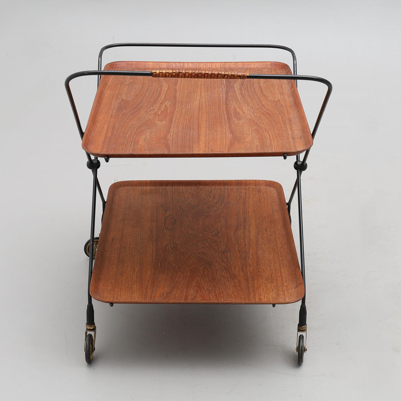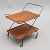 Löysät tiikkilaatat, runko mustalla lakatulla metallilla ja messinkiyksityiskohdat. Korkeus 68 cm, pituus 67 cm.