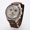 Omega X Swatch -kello, biokeraaminen kotelo ”Mission to Saturn”, kellotaulu minuutti-, tunti- ja sekuntiosoittimella, kronografi, kvartsikoneisto, muovilasi, tarranauha. Mitat n. Halkaisija Ø 42 mm, laatikolla ja paperilla. Tarkistuksen aikaan kello oli käynnissä, Auctionet.com ei takaa toimivuutta.