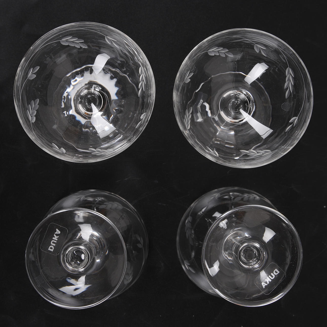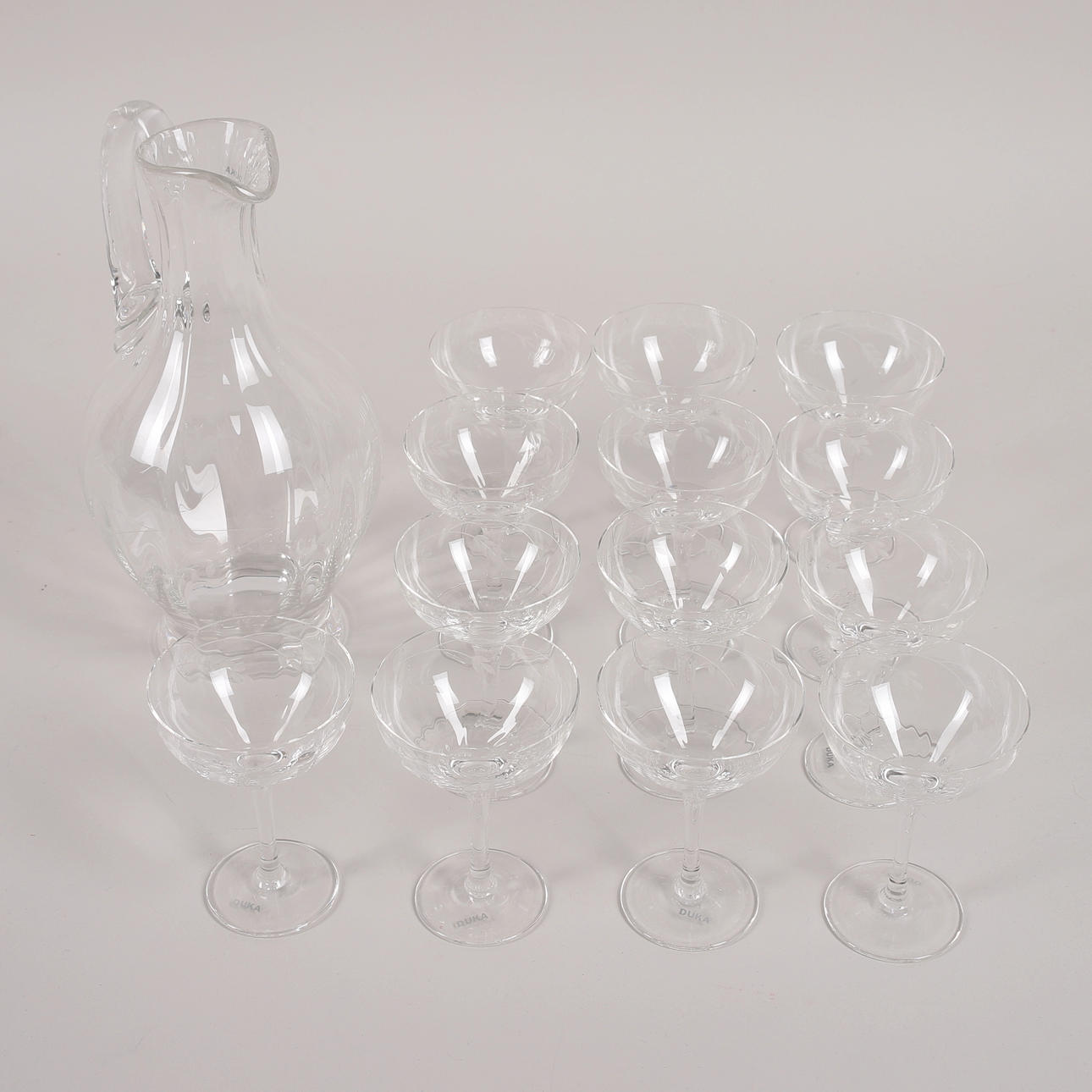 13 kpl liköörilasi/vahvat viinilasit, korkeus n. 10,5 cm. Dekanteri/kannu, korkeus n. 24 cm.