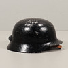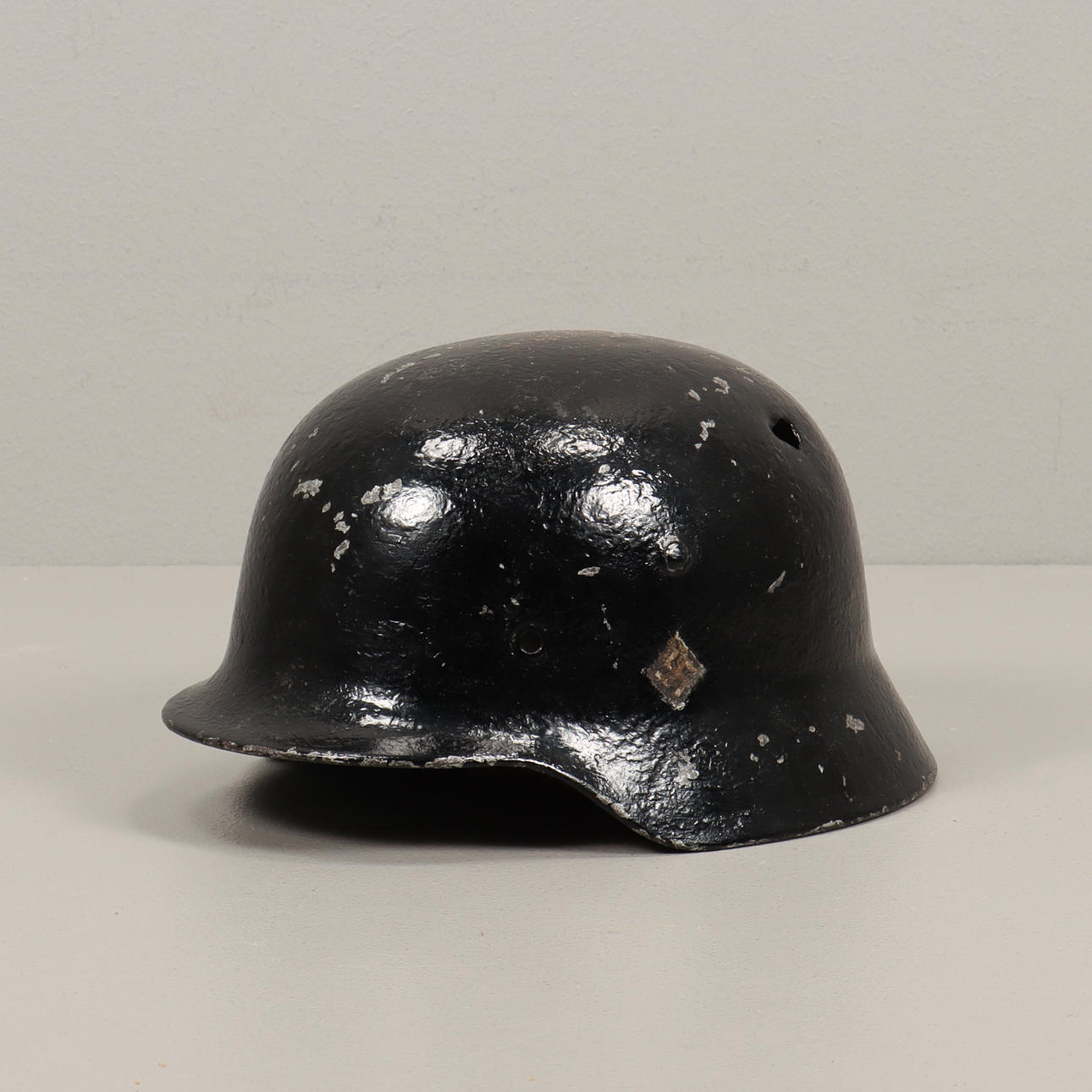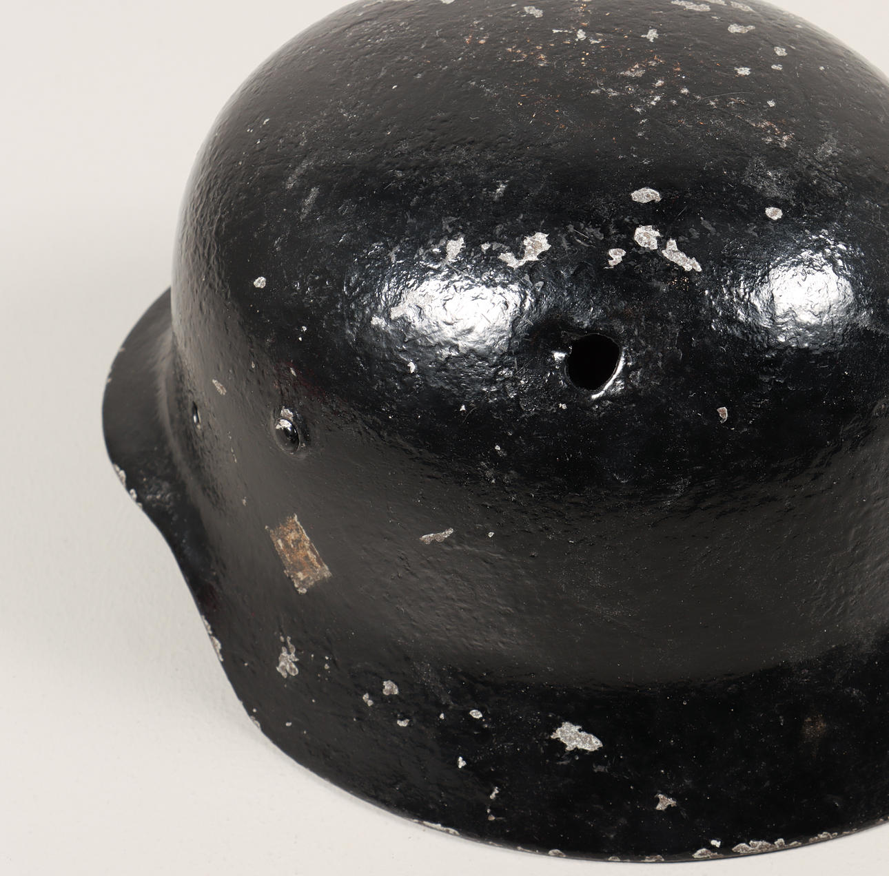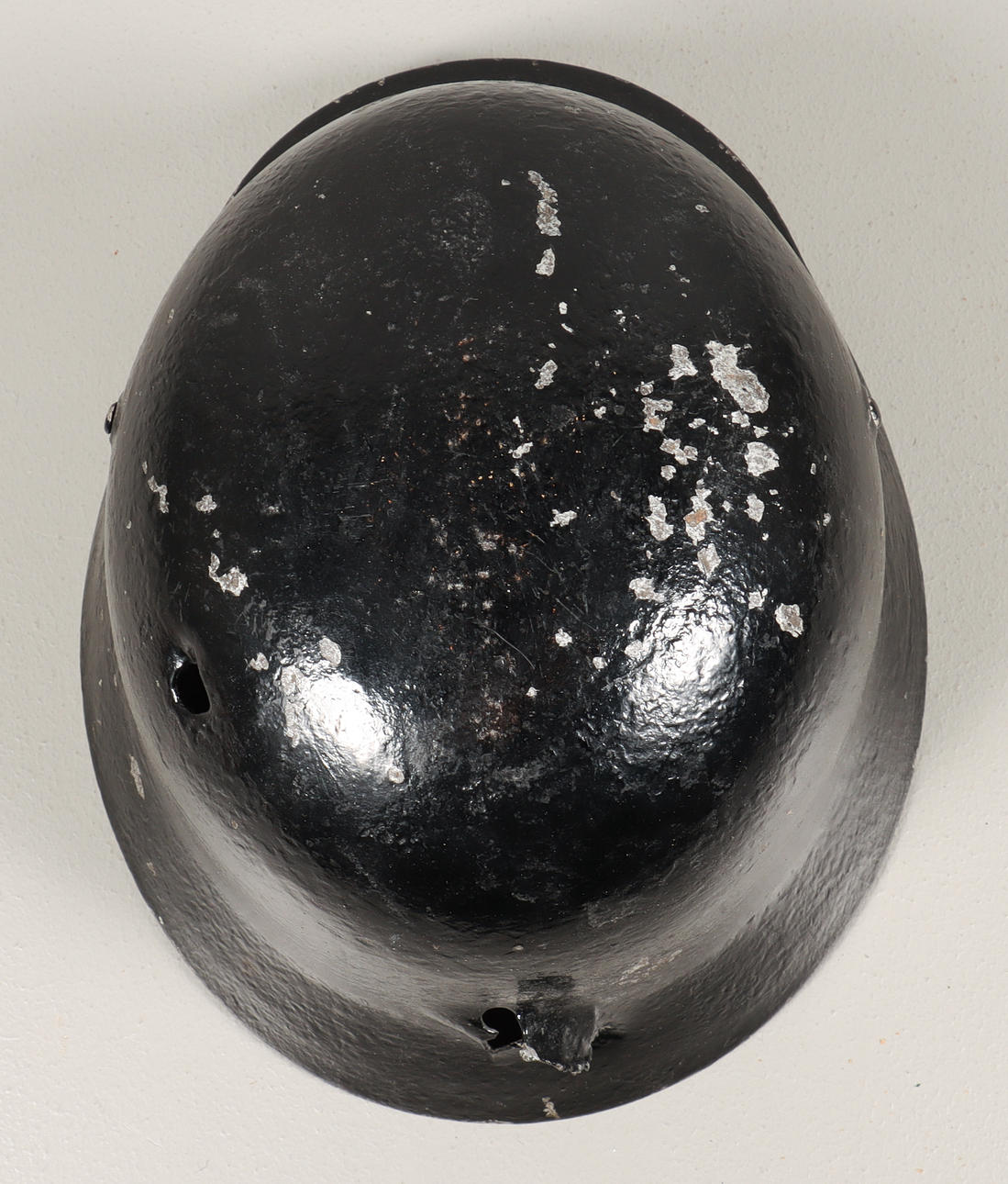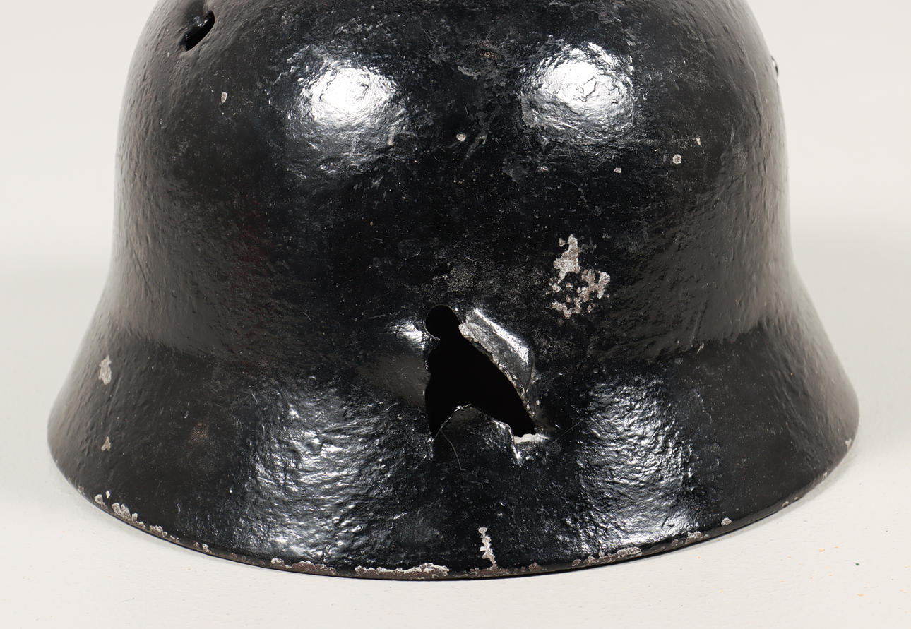 Laukausreiät, myöhempi maalaus, sisäpuolen nahka vaihdettu, kuluminen.