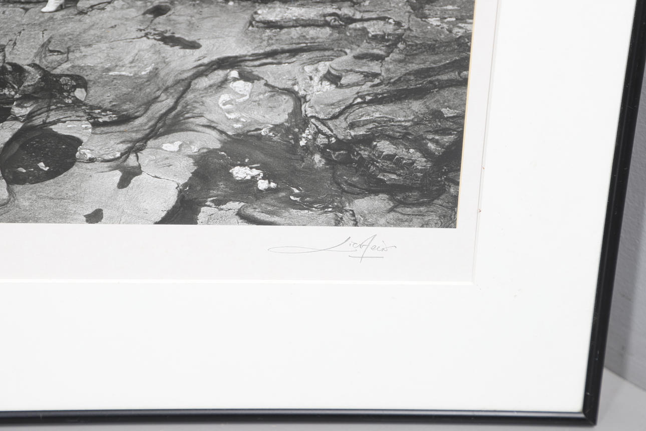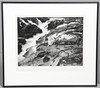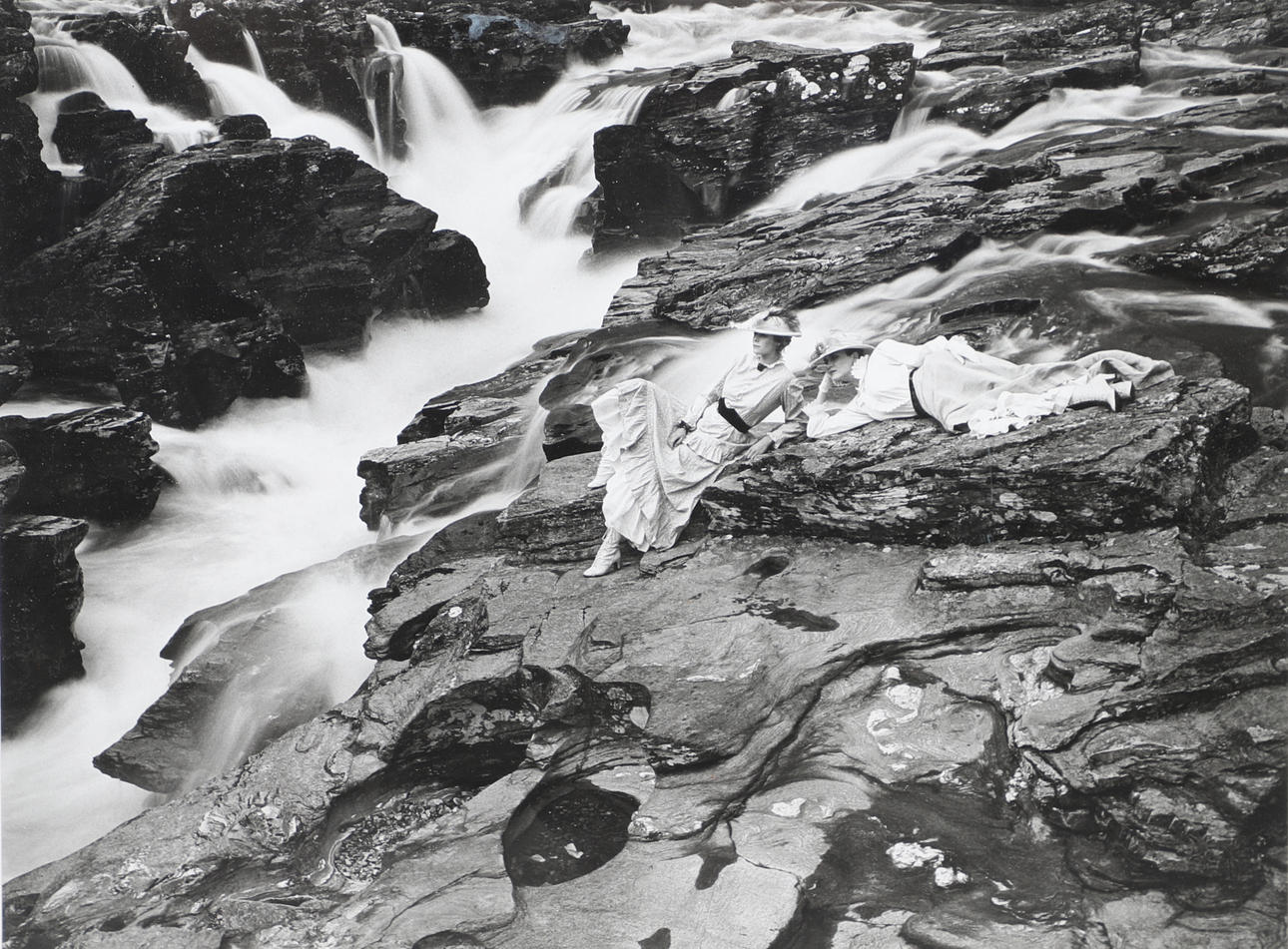 Mustavalkoinen valokuva kahdesta naisesta edwardiaanityylisissä mekoissa rentoutuvissa kallioilla vesiputouksen äärellä. Signerad med lyijykynä marginaalissa. Kehystetty ja lasitettu. 50 x 57 cm.