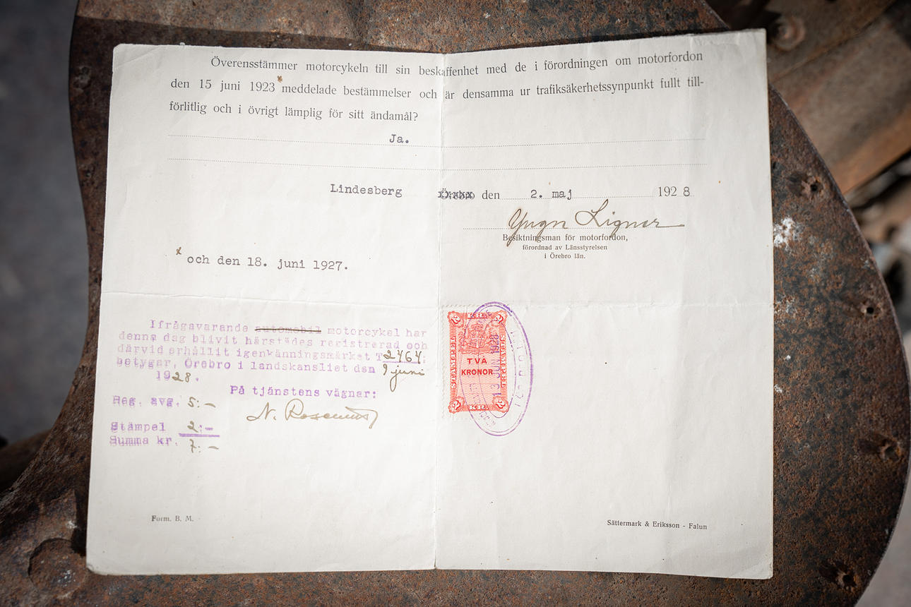 Seuraava alkuperäinen tutkimuslaite on päivätty ”Lindesberg 1928 2. toukokuuta”. Tarkastusvälineet ovat esillä ”Nya Cykelaffen, Lindesberg” -tapahtumassa, jossa moottoripyörä myytiin uutena.