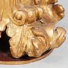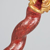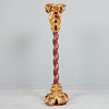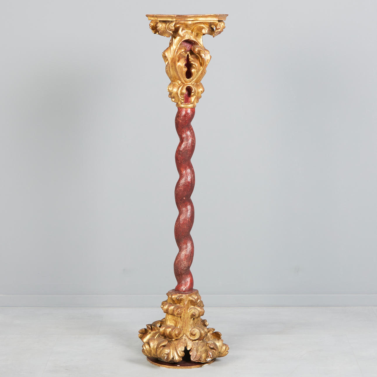 Kaiteen muotoinen pylväs veistetystä puusta, jossa punaisella koristeltu, kierretty varsi ja veistetty pääty ja jalkalauta, joissa on volute- ja jänteen muotoisia elementtejä, kukin kultaa, varustettu pyöreällä hyllyllä, yläosassa pyöreä hylly, H.135 cm, D.37 cm.