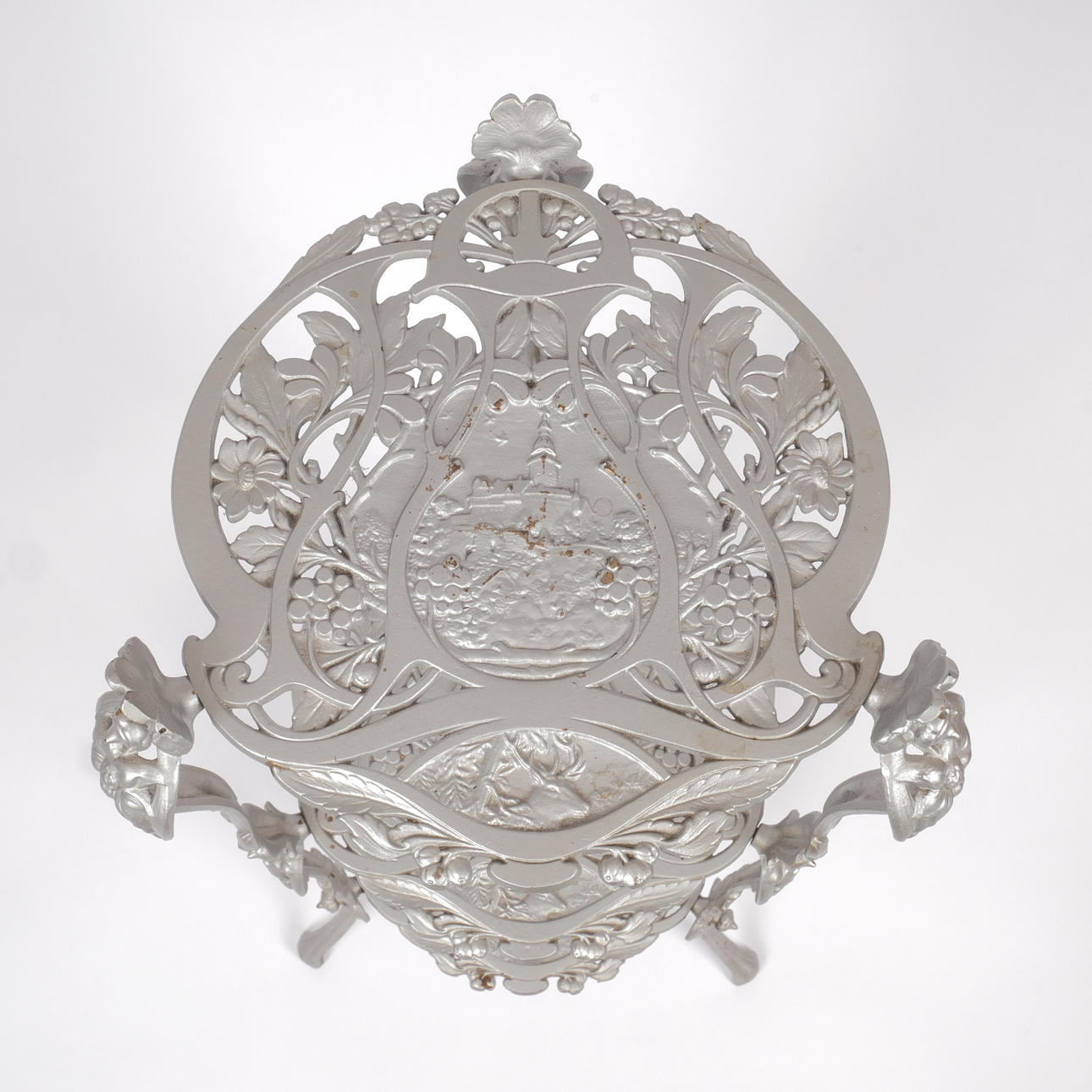 Läpi, rikkoutunut koriste, jossa kirkko, hirven pää, kukat ja lehdet. Korkeus 74 cm, halkaisija n. 32 cm.
