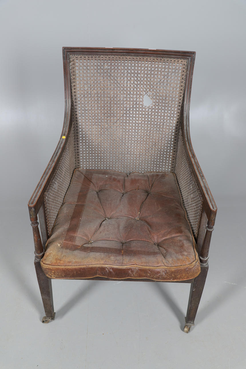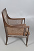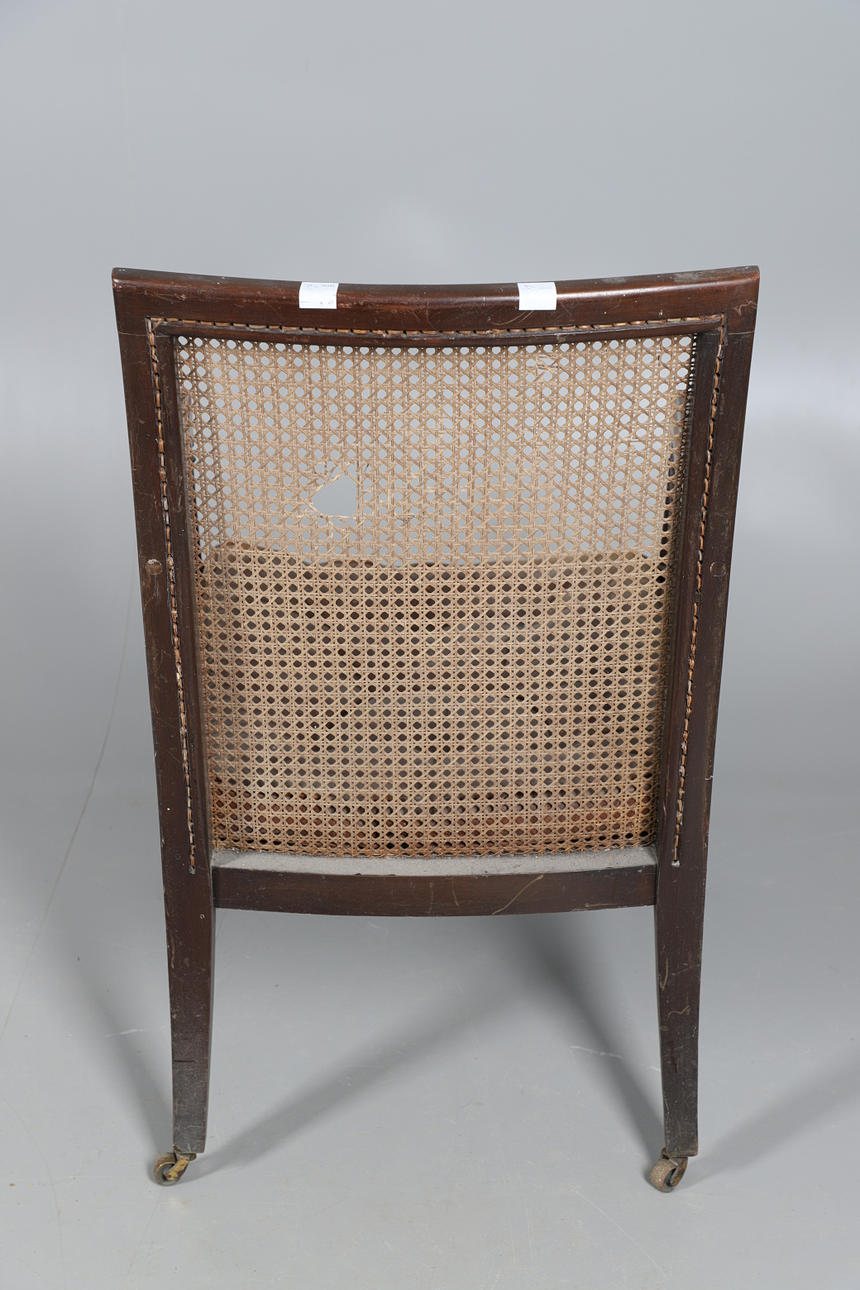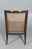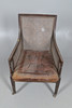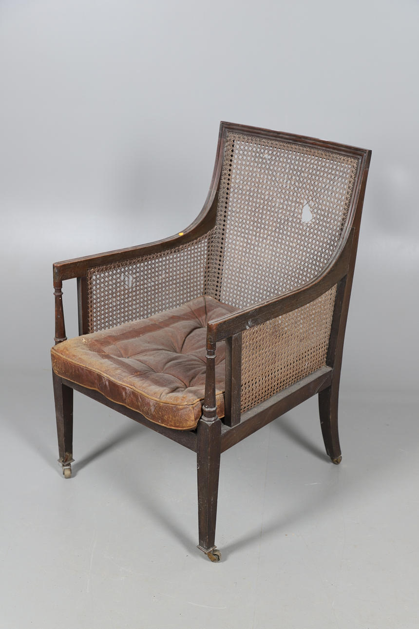 Rataanin sivut ja selkä, käännetyt tuet ja kapenevat jalat messinkipyörillä. Nappinen istuintyyny. Istuinkorkeus 36cm, Kokonaiskorkeus 96cm.