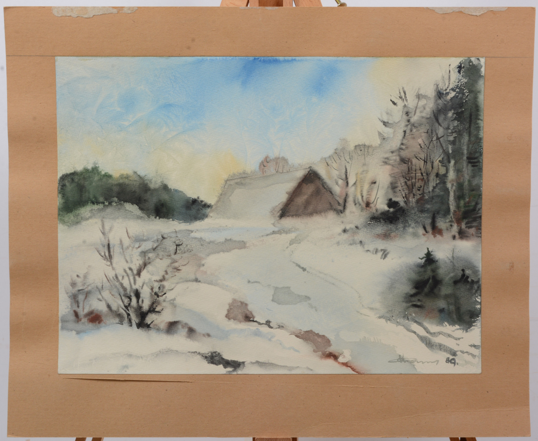 3520267. OLGERTS KRAUKLIS. Talvimökki. Latviassa. Vesiväri.