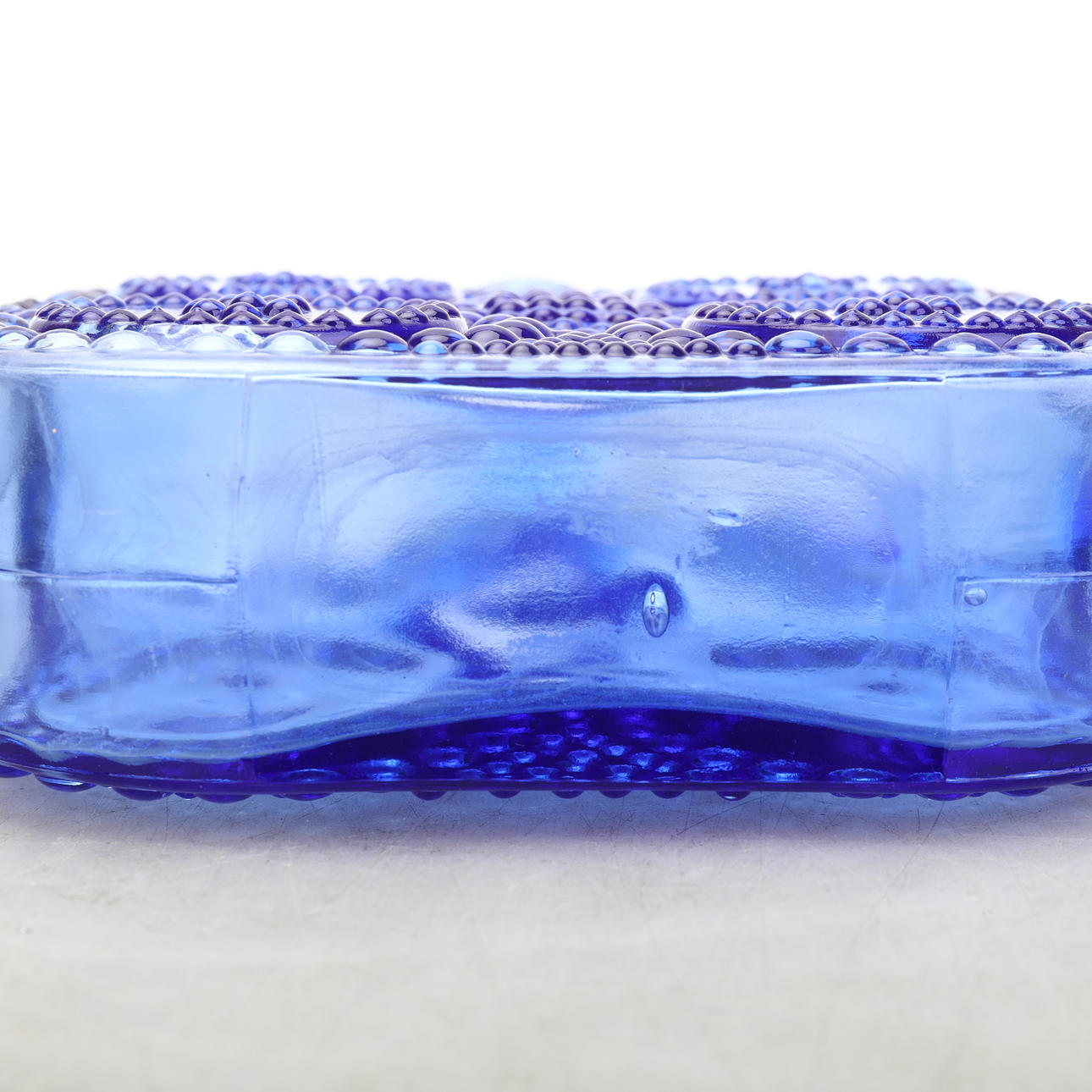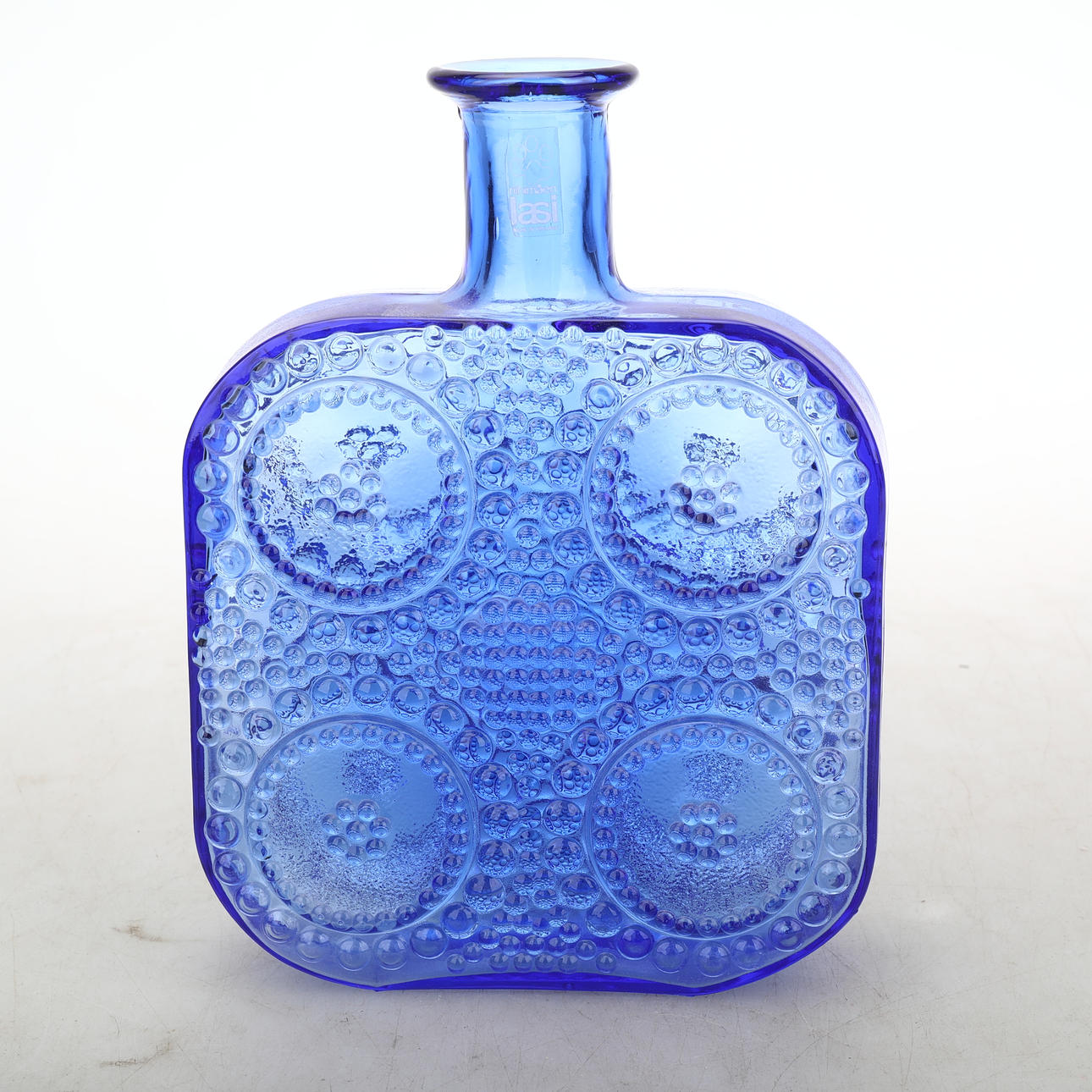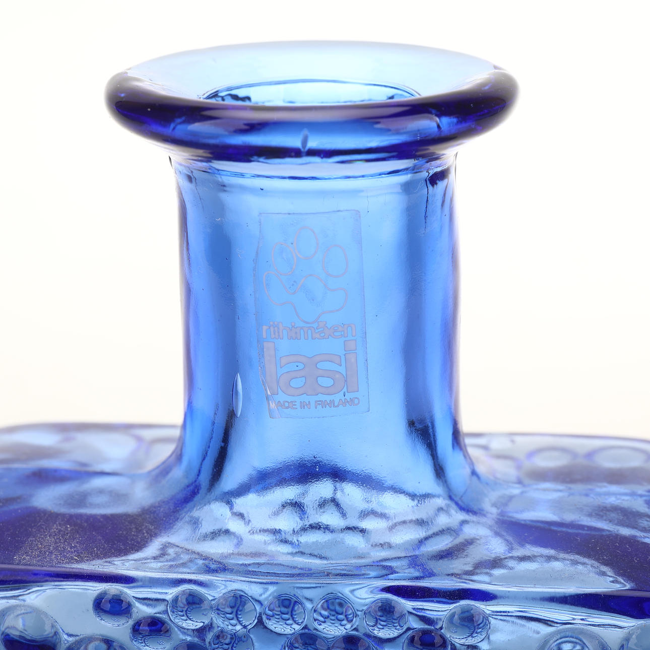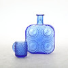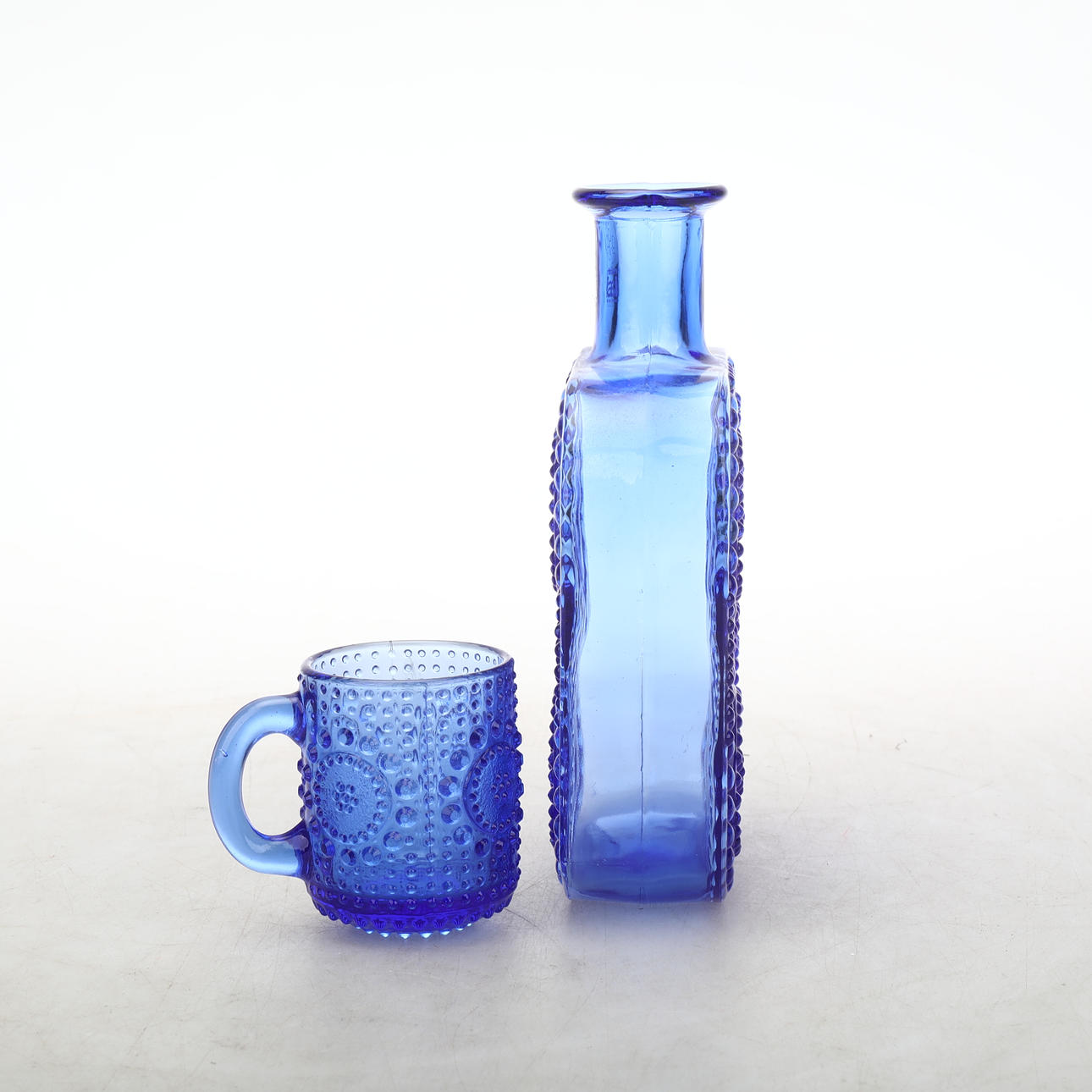 Sininen puristuslasi. Pullo, n 19 cm, korkeus. Kuppi n., 7 cm, korkeus.