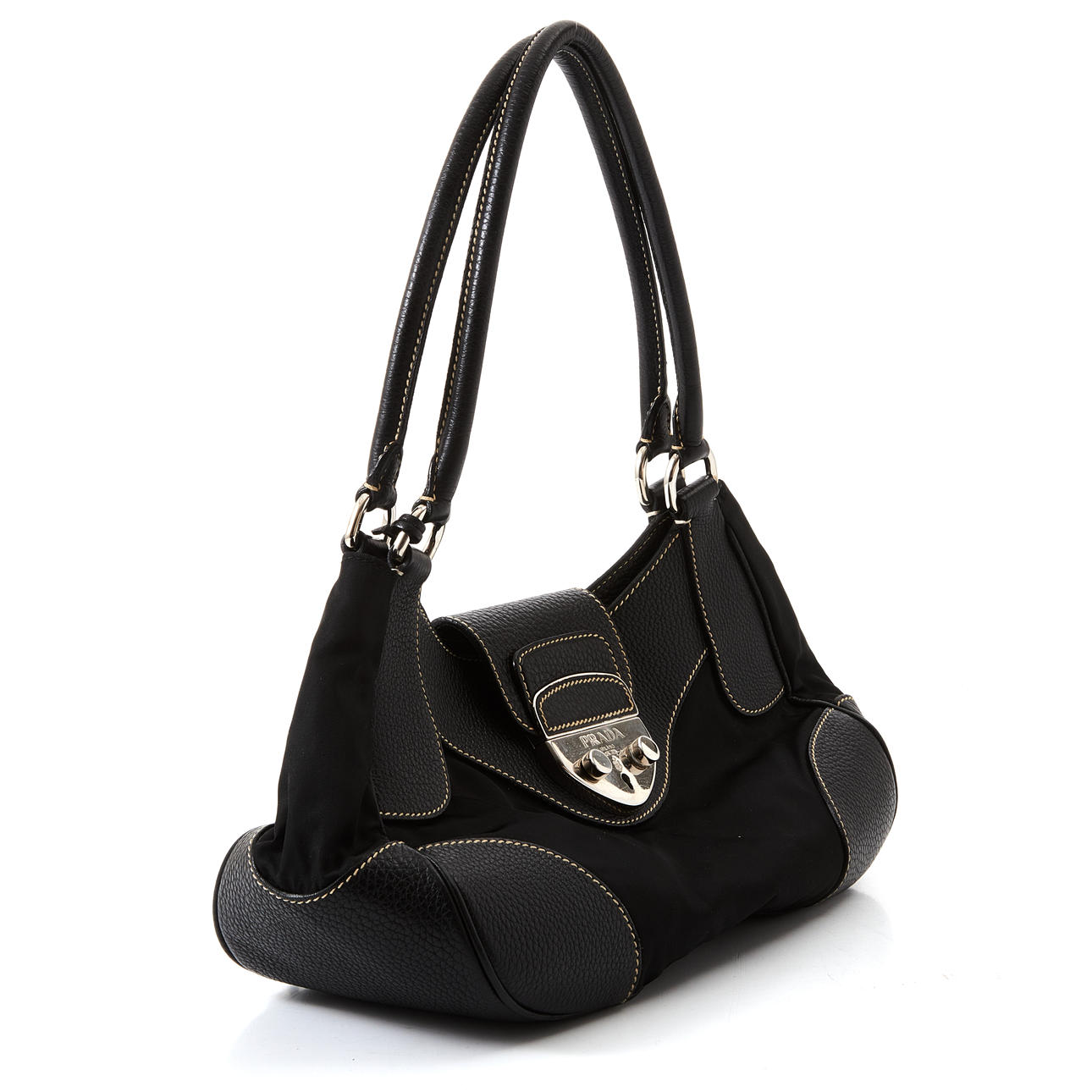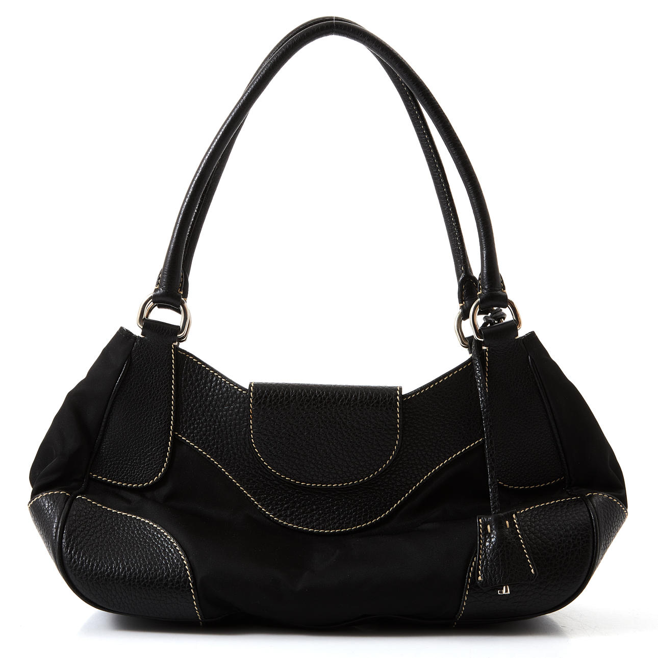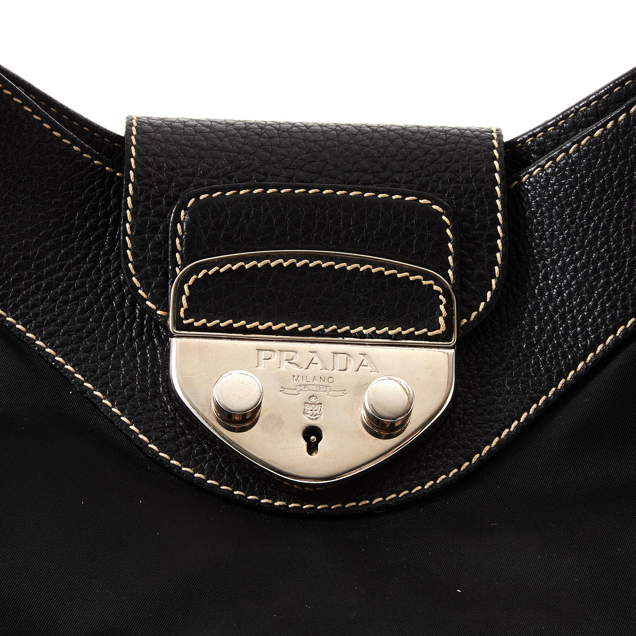 Nailonia ja mustaa kohokuvioitua nahkaa kevyillä ompeleilla, sormukset ja solki valkoista metallia, lukittava solki avaimella ripustettuna clochettissa, vuorattu mustalla tekstiilillä, sisäpuolella vetoketjullinen lokero, merkintä ”Prada Milano”, mukana pölypussi alkuperäisessä muodossa, mitat n. 21x30x12cm.