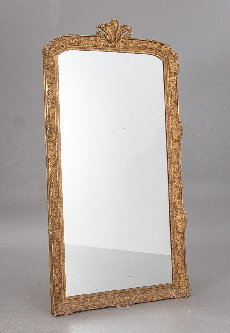 Puu leikattu ja osittain kullattu. Erittäin suorakaiteen muotoinen, nivelletty runko, jossa on runsaasti koristeltuja kasvien jänteitä ja simpukan kruunua. KxL: n. 158 x 82 cm.