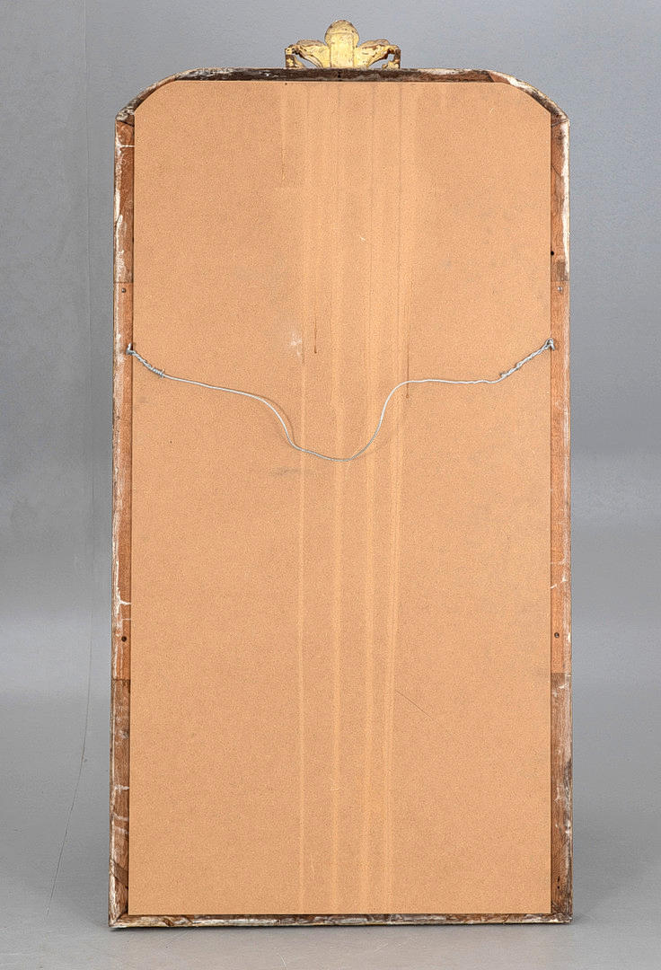 Kulumisen merkkejä, pieniä koristeellisia menetyksiä paikoissa, kolhuja ja halkeamia. Takaseinä ja peili myöhemmin.