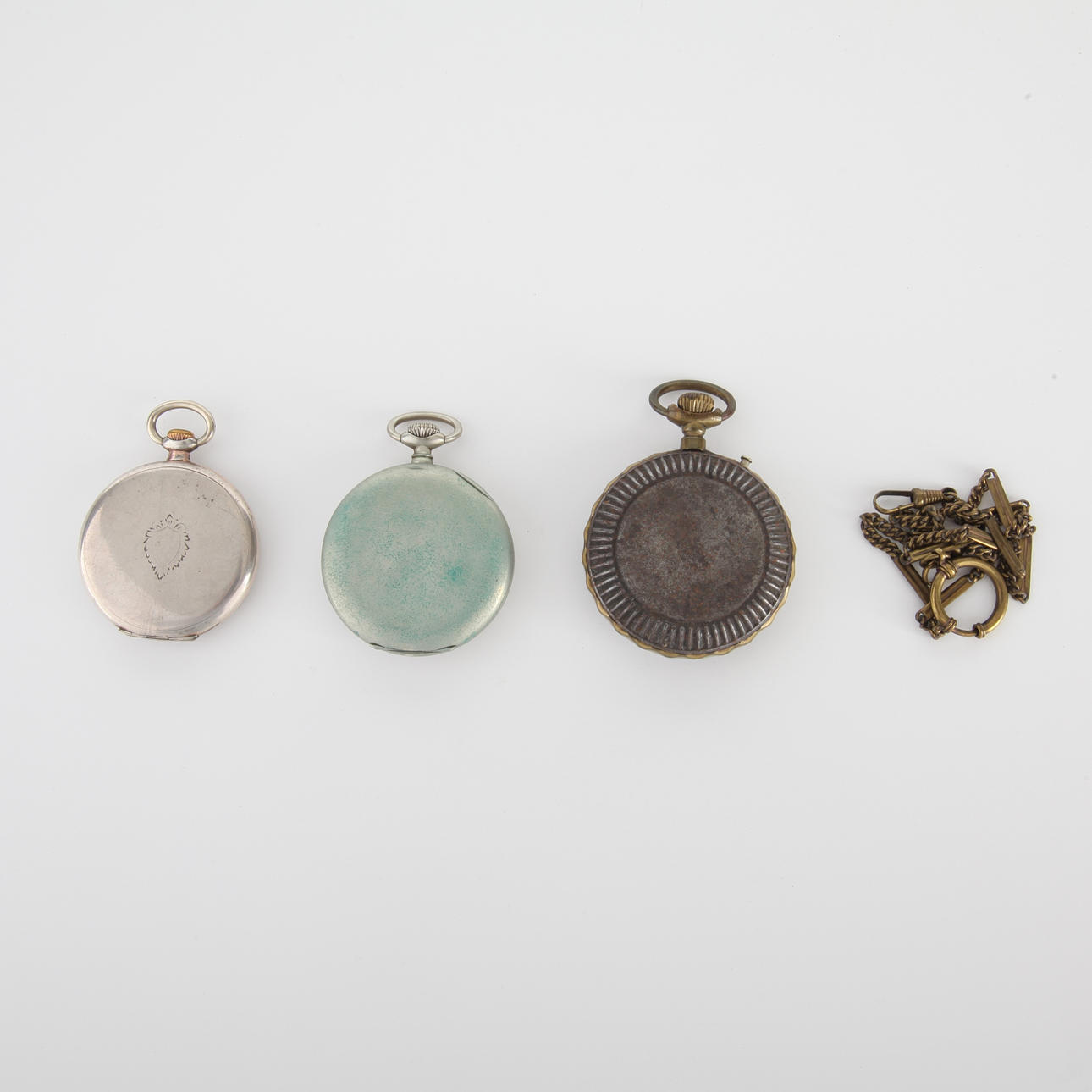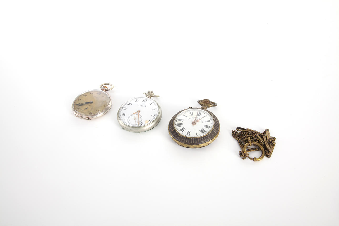 Viking-taskukello valkoisesta metallista ja Regulador Patent 1a toimivat rekisteröintihetkellä, hopeakello ei toiminut. Toiminnallista takuuta ei anneta.