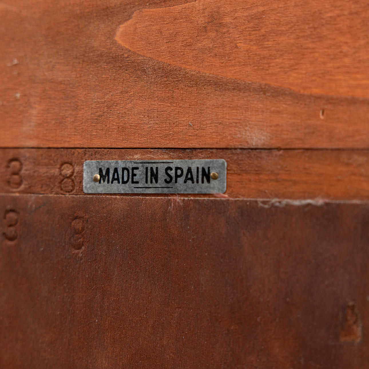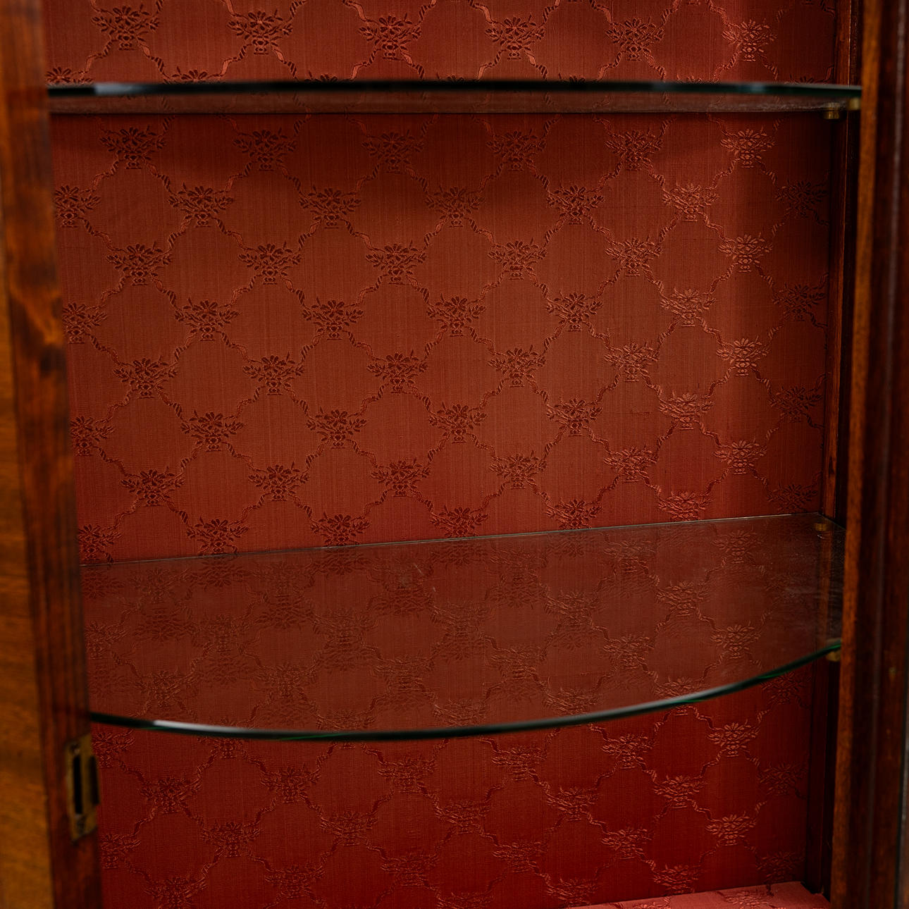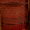 Maalattu sisustus, jossa pohjassa figuraalinen kohtaus ja maisema, kudottu lasi, sisustus verhoiltu silkillä, kolme hyllyä joista kaksi lasia, messinkiyksityiskohdat.