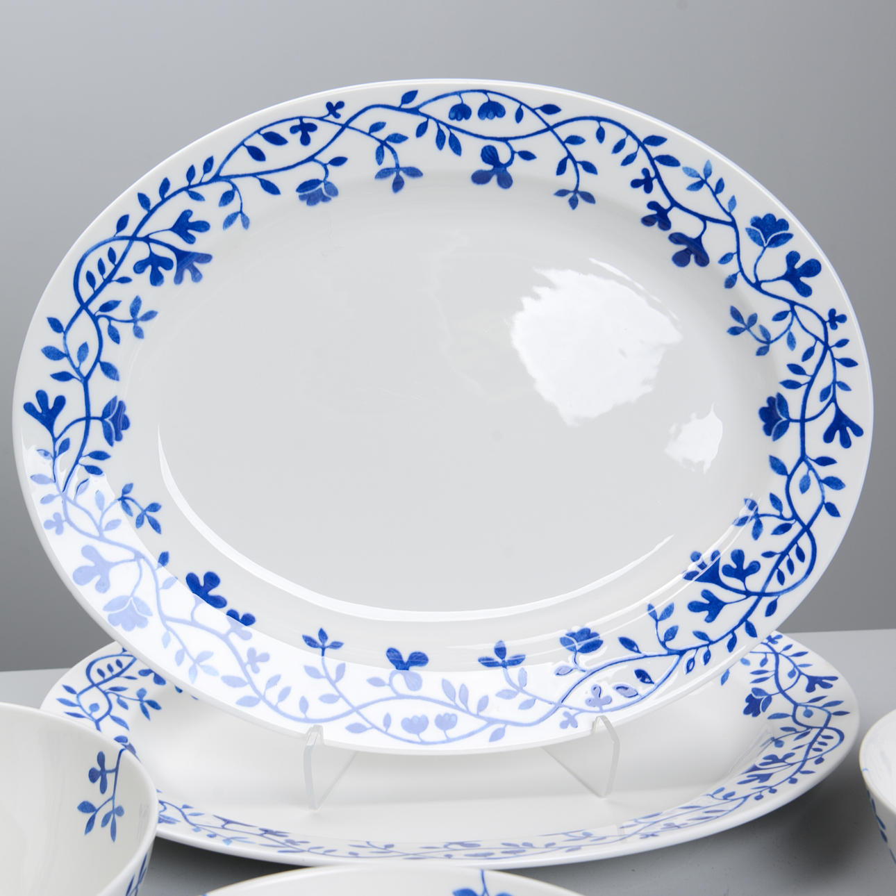Sininen sisustus käämittävistä lehdistä kukilla luonnonvalkoista pohjaa vasten. Sarja esiteltiin vuonna 2008, ja sen valmistus on lopetettu.