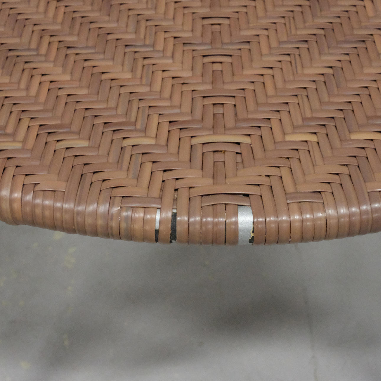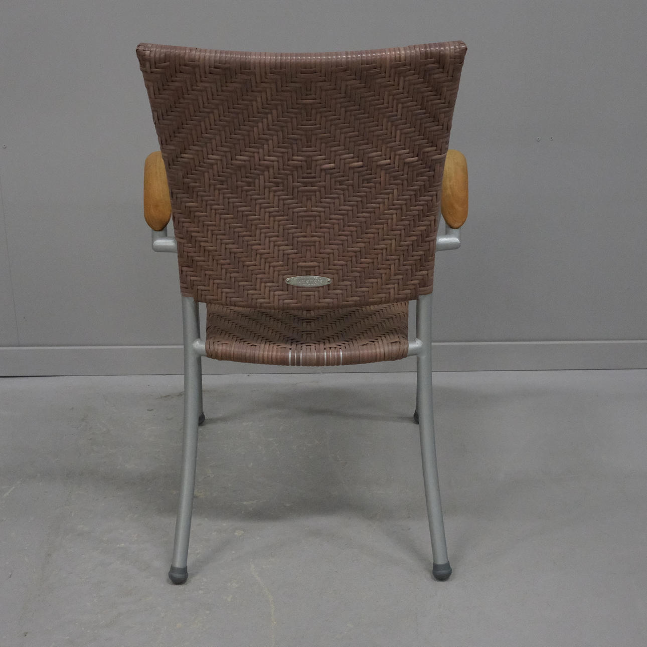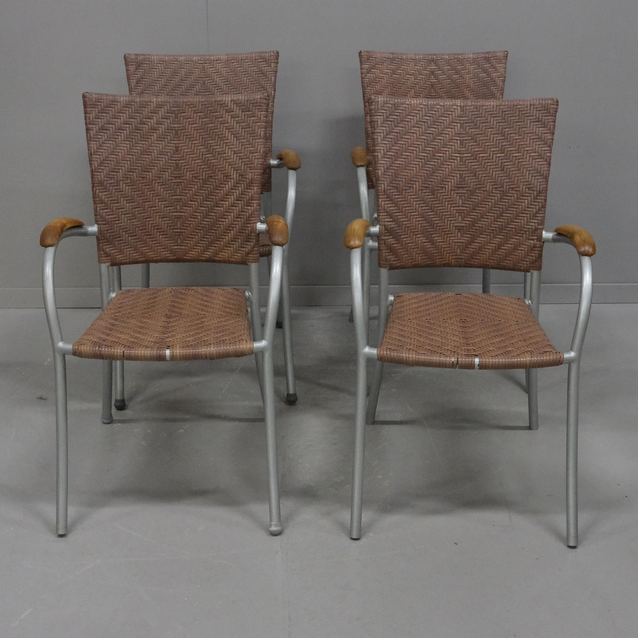 Neljä nojatuolia, taiderottinki, metalli ja puu ja pinottava. Korkeus 90cm, istuinkorkeus 35cm.