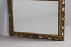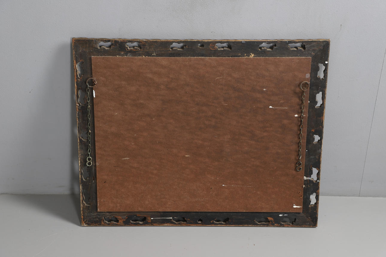 Koristeellinen lehtityylinen kehys ja viistetty reunapeililevy. Ripustettu roikkuvista ketjuista. 75cm x 60cm.