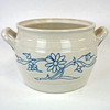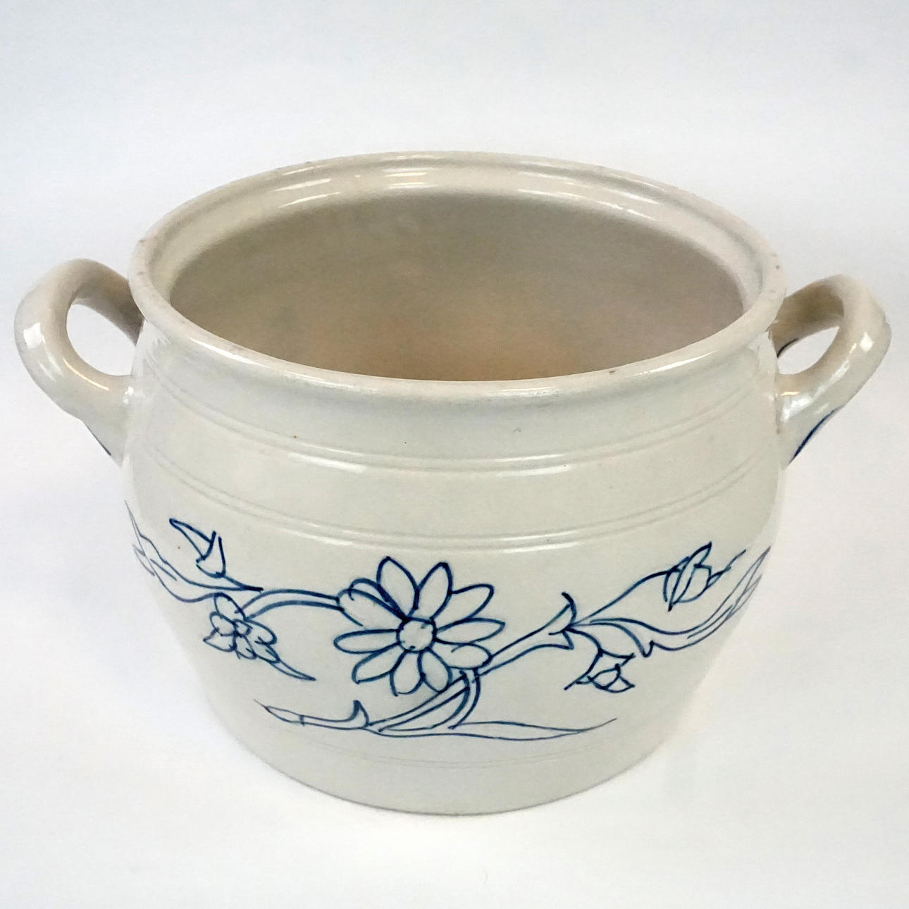 Sininen ja valkoinen kivitavararuukku, korkeus 18 cm, halkaisija 23 cm.