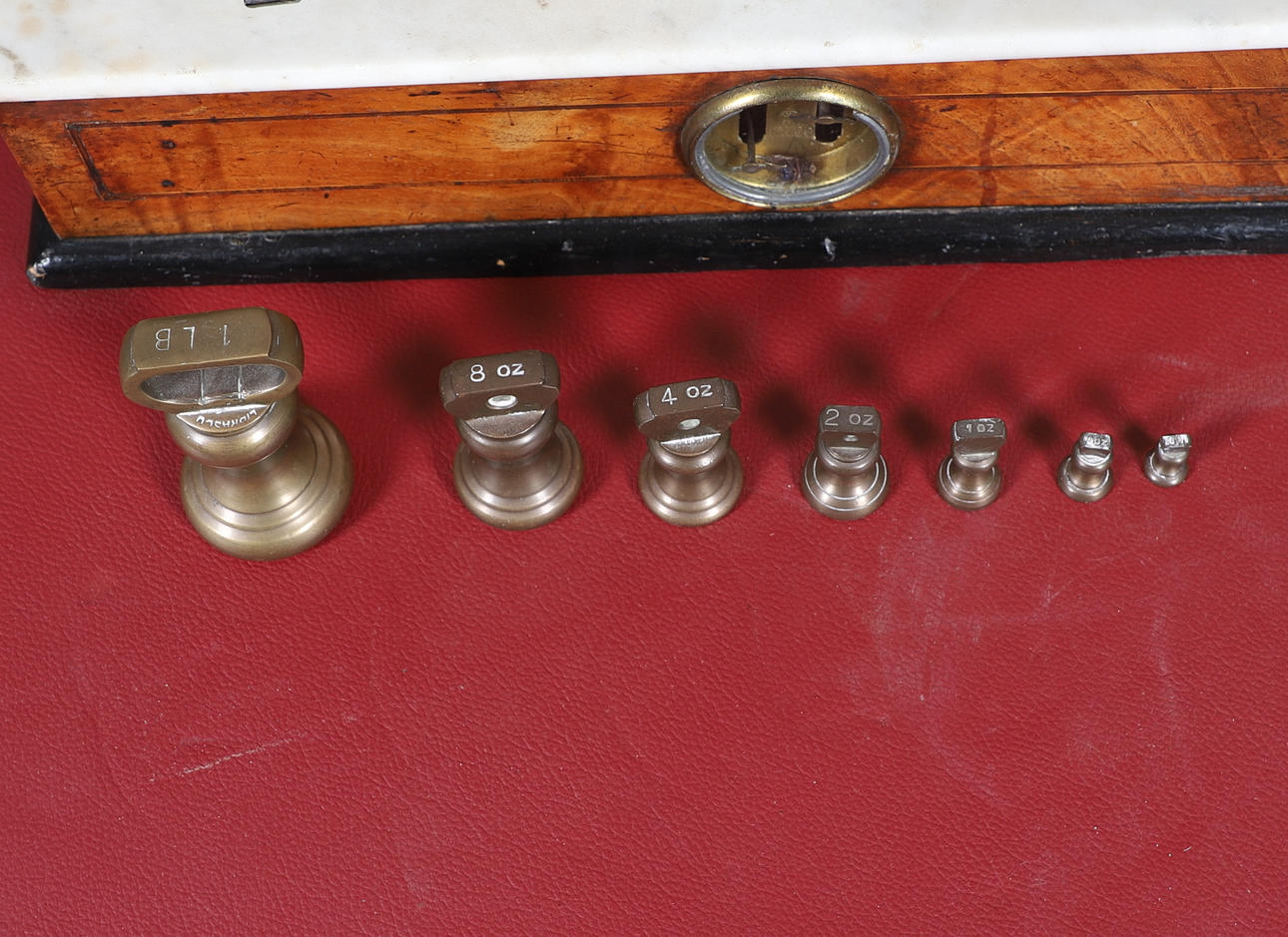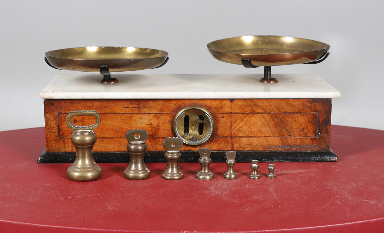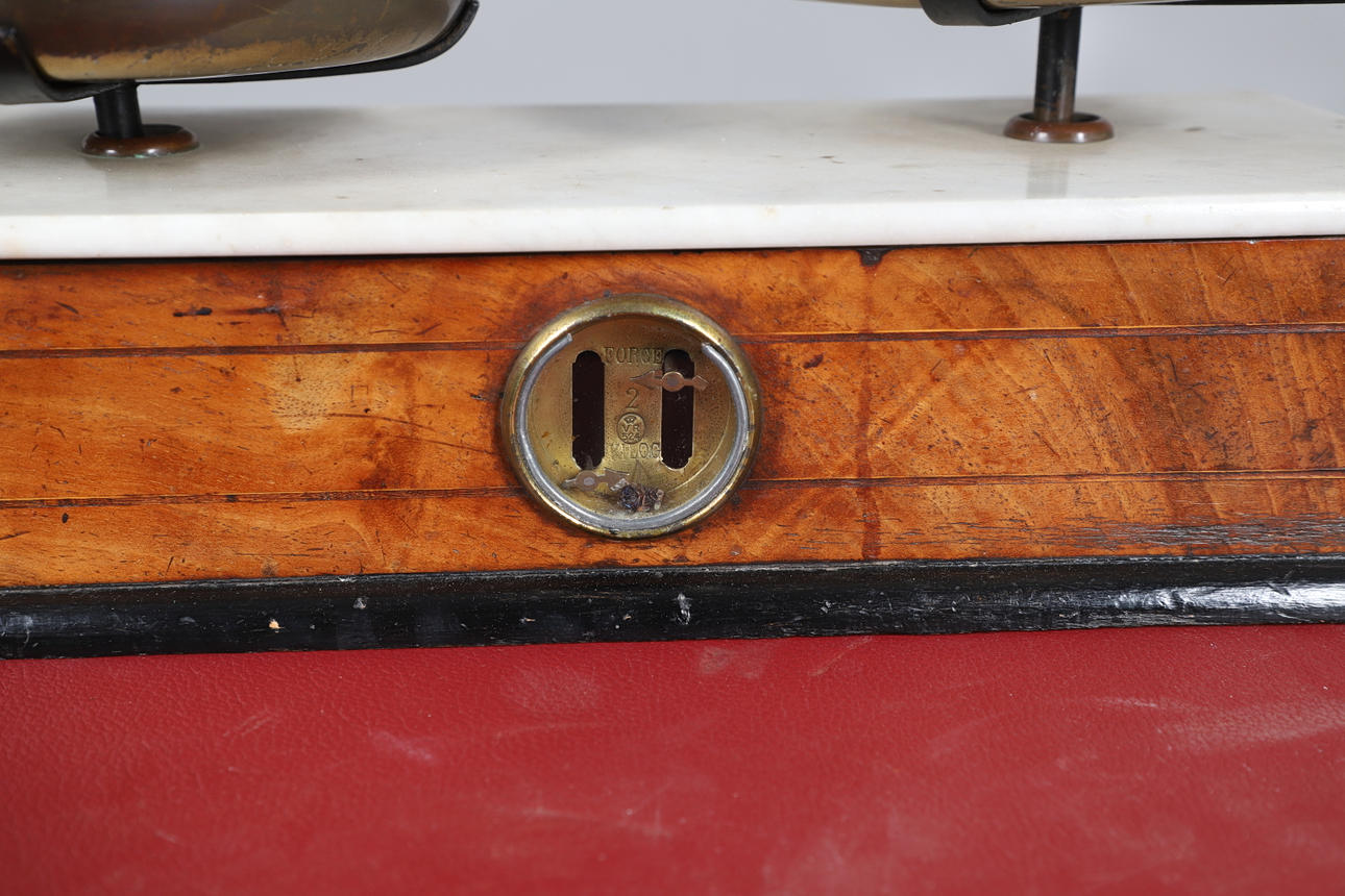 marmorikansi pähkinäpohjalla ja eebenpuisella pohjalla, jossa näkymätasapainoikkuna, leimattu V.R 524, seitsemän messinkipainoa, 44cm x 17cm.