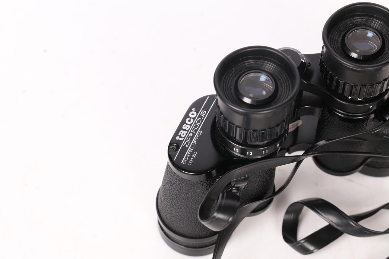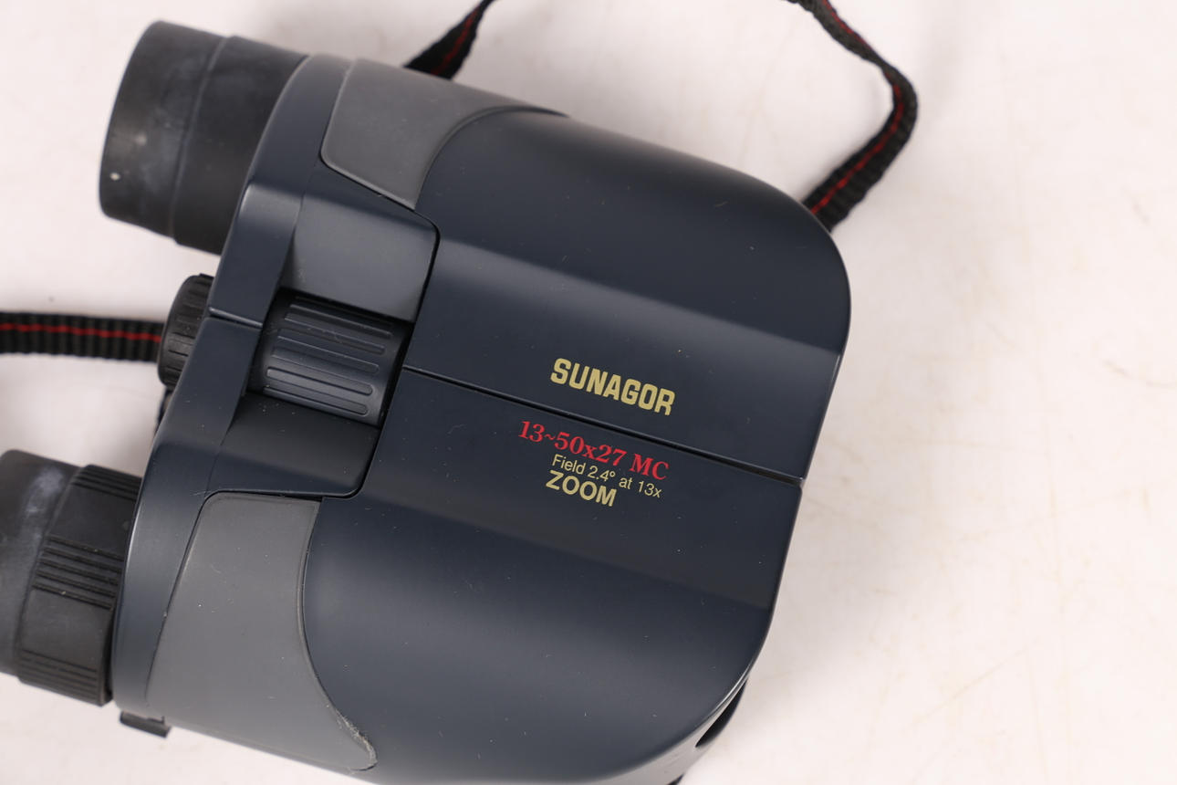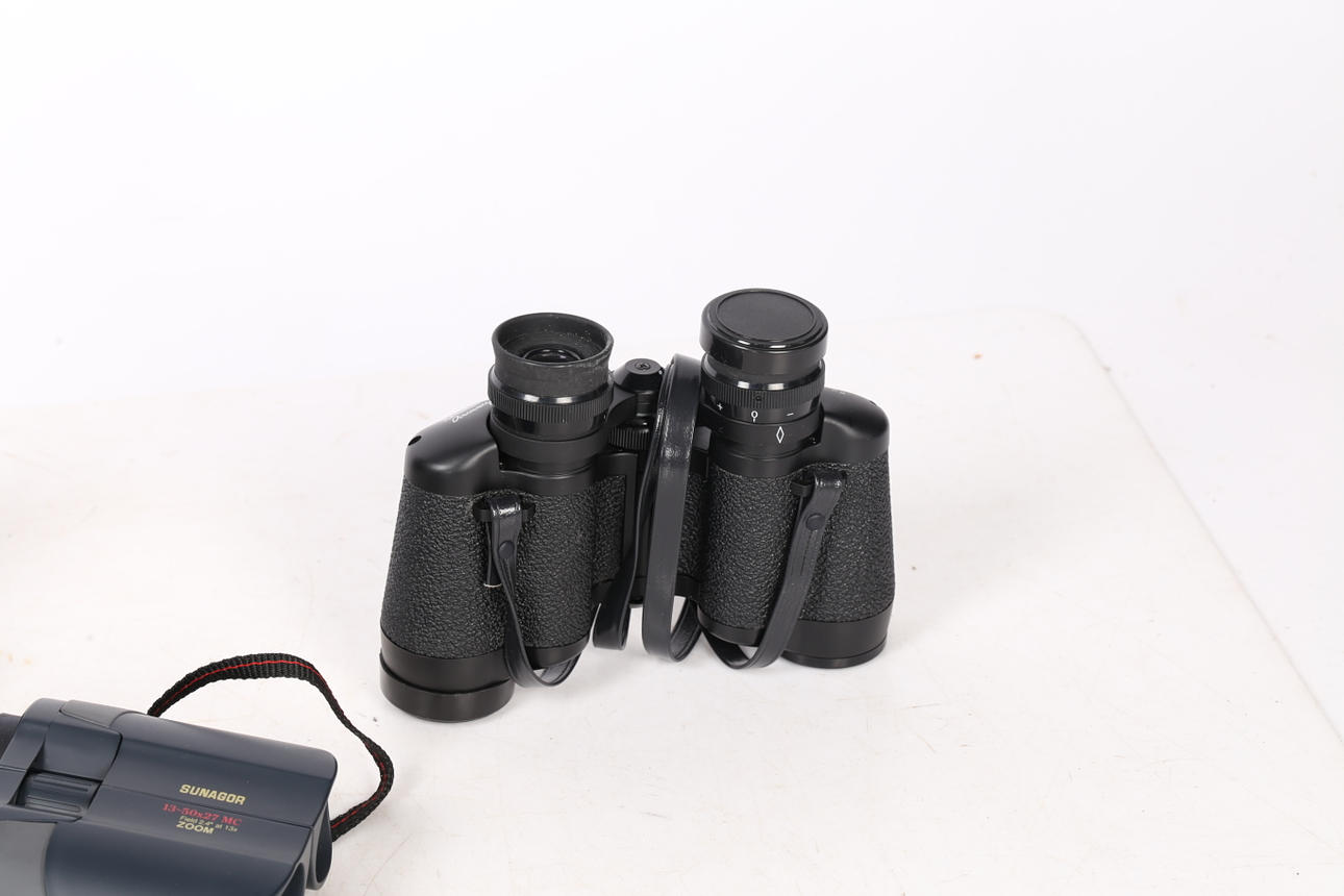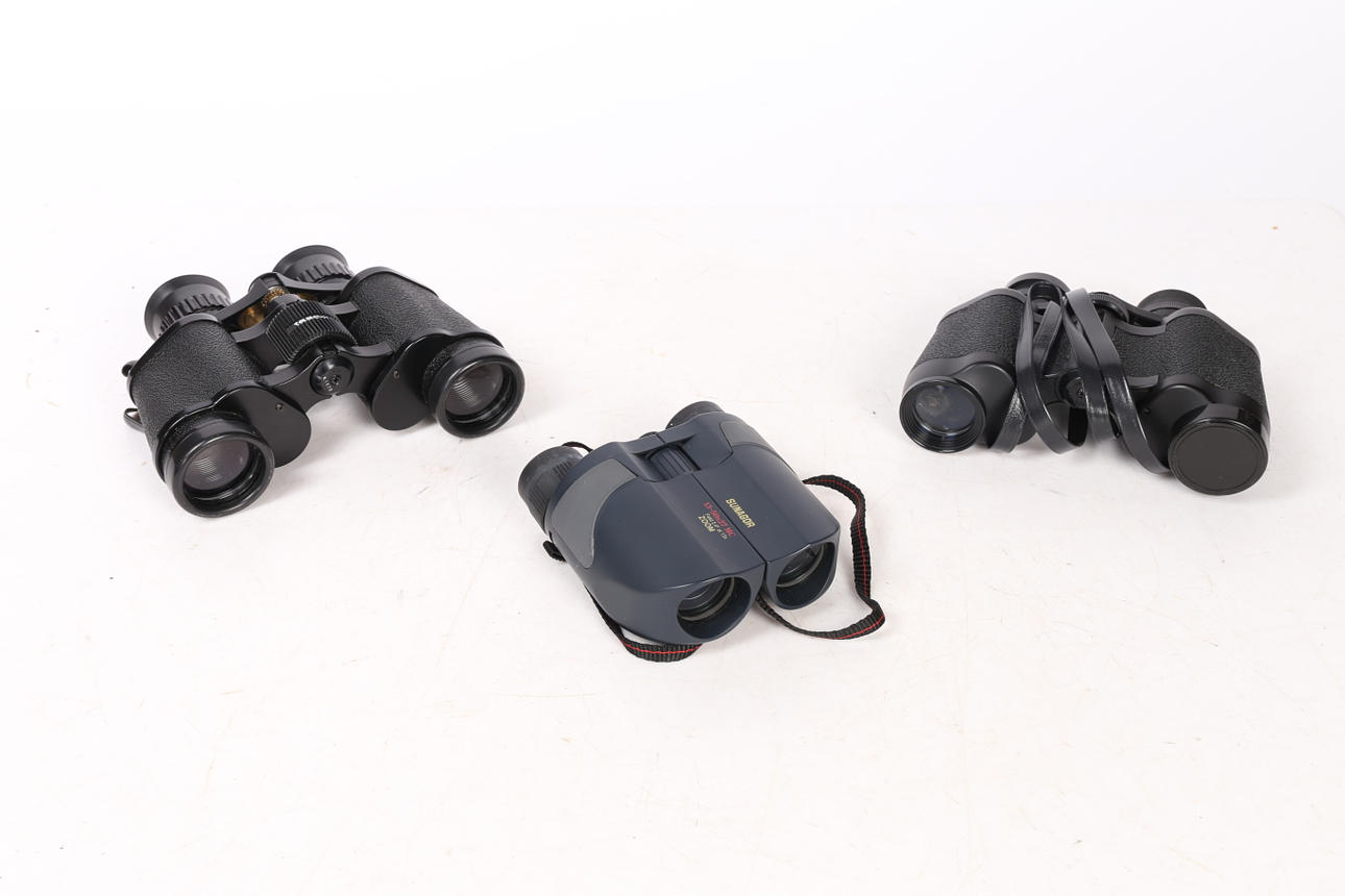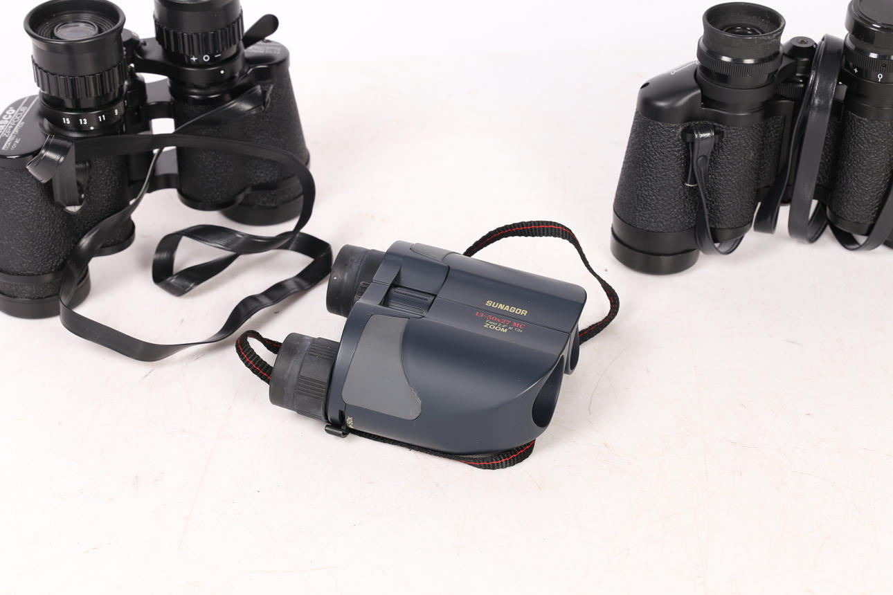 Sisältää Tasco 7X-15X35, Sunagor taittokiikarit 50x27 ja Halina Discovery 8x30 Field -kiikarit (3).
