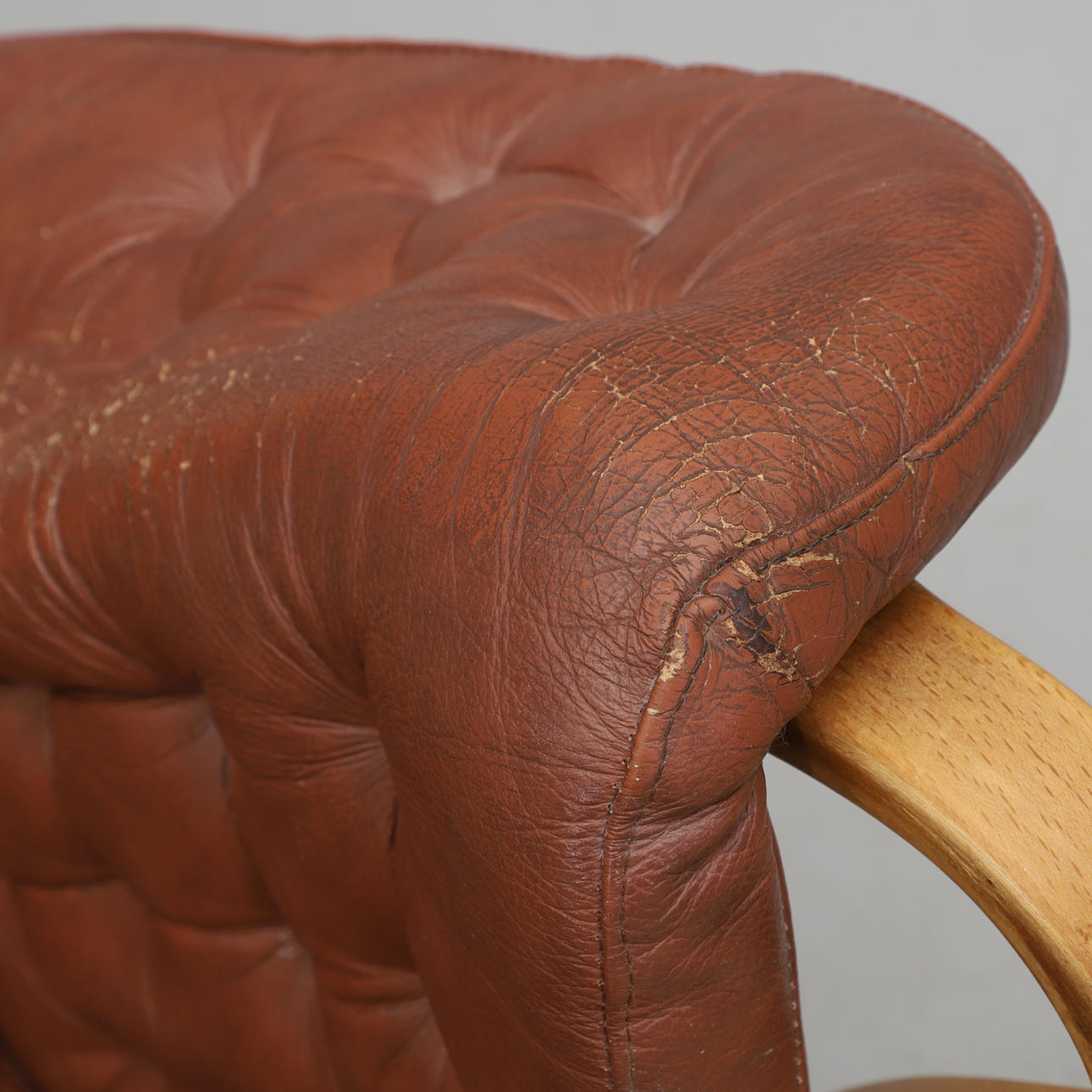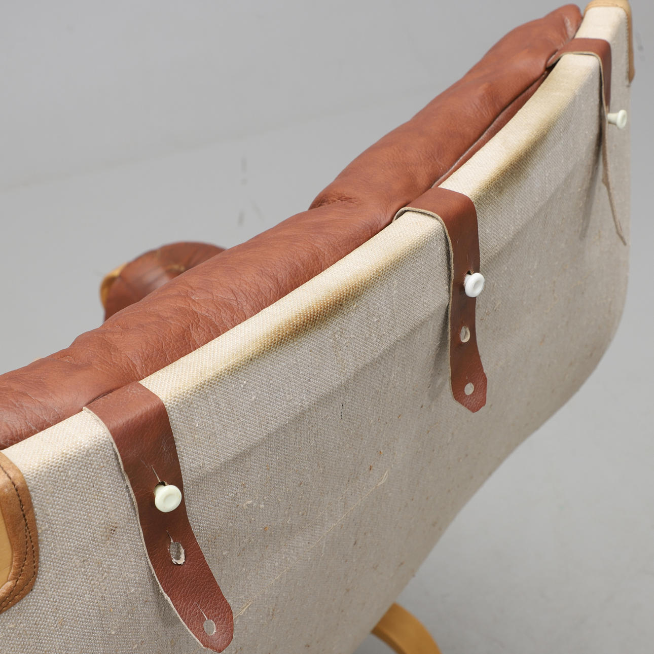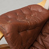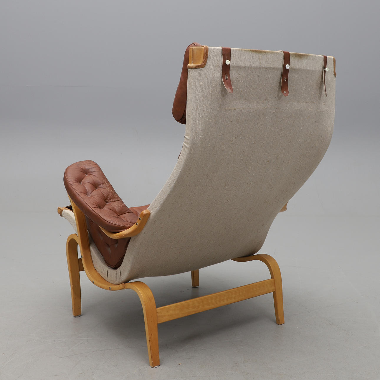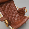 Runko laminoidusta pyökistä. Kankaasta valmistettu kankaasta valmistettu kangas. Nahkaverhoilu. Löysä tyyny istuimessa ja selkänojassa. Kaulatyyny ja verhoillut käsinojat. Tuotemerkki. Leveys 85, selkäkorkeus 98, istuinkorkeus 39 cm.